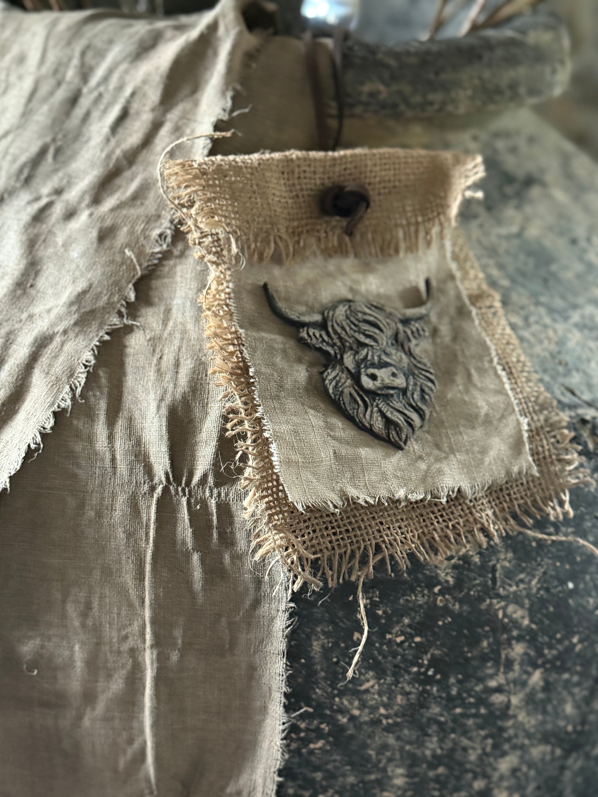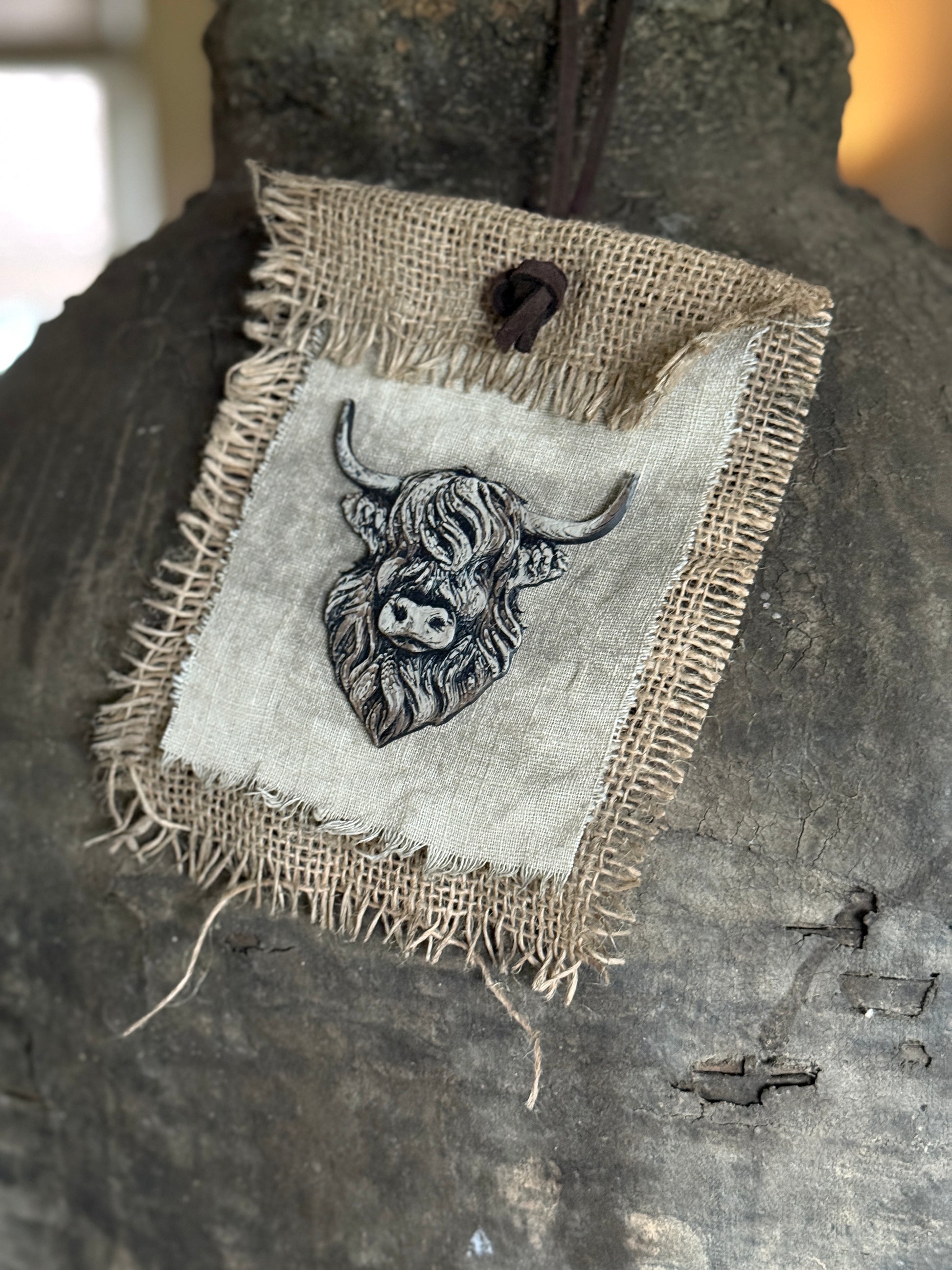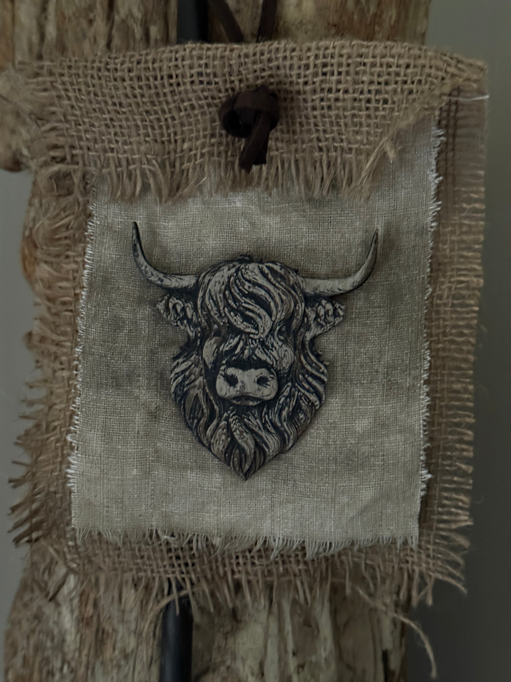 Dieses charmante Kreidetuch von San7 ist handgefertigt und zeigt ein dekoratives Hochlandrind. Dank des Lederbands lässt es sich leicht aufhängen und ist eine einzigartige und warme Ergänzung für Ihr Zuhause während der Feiertage.