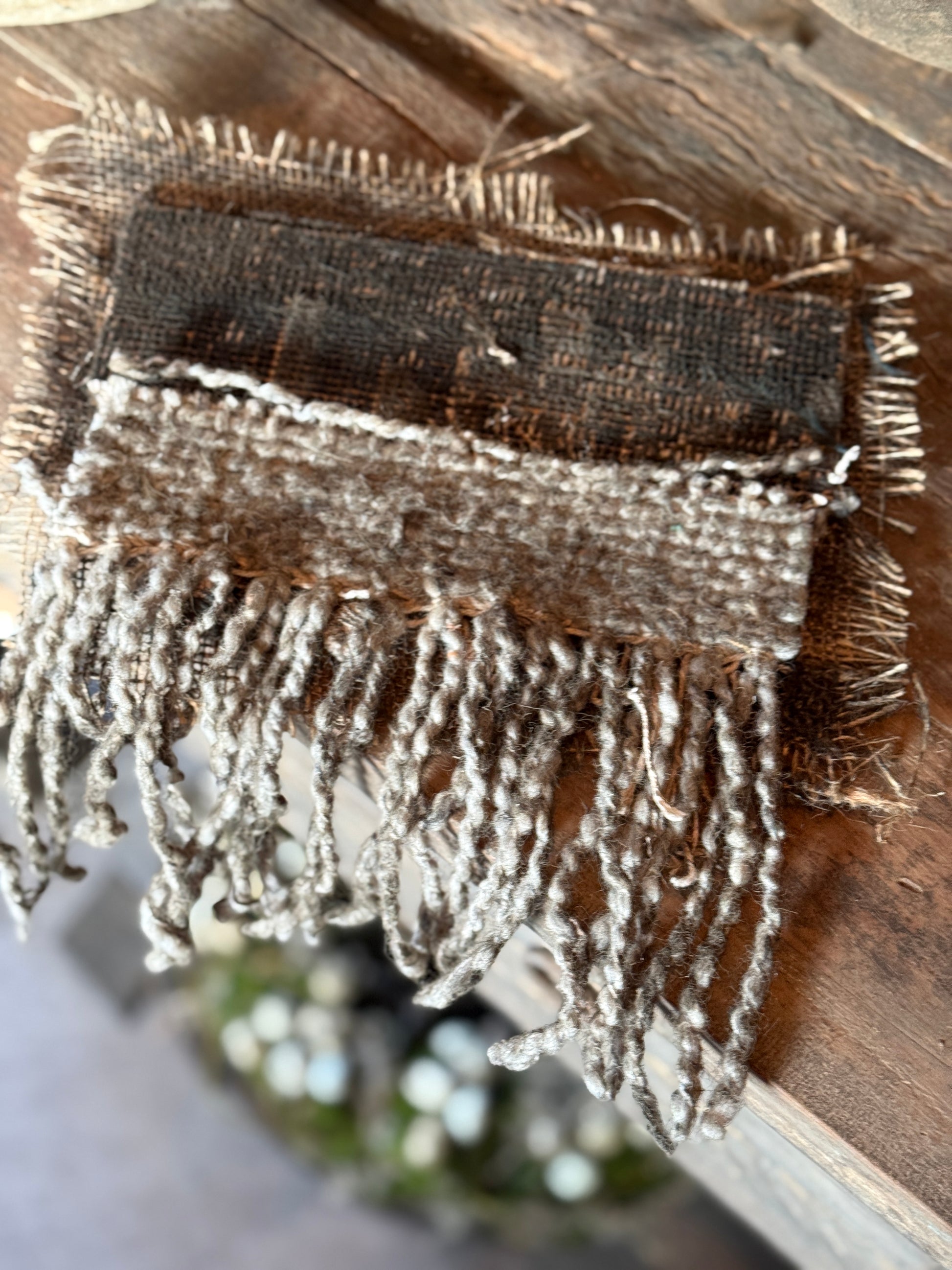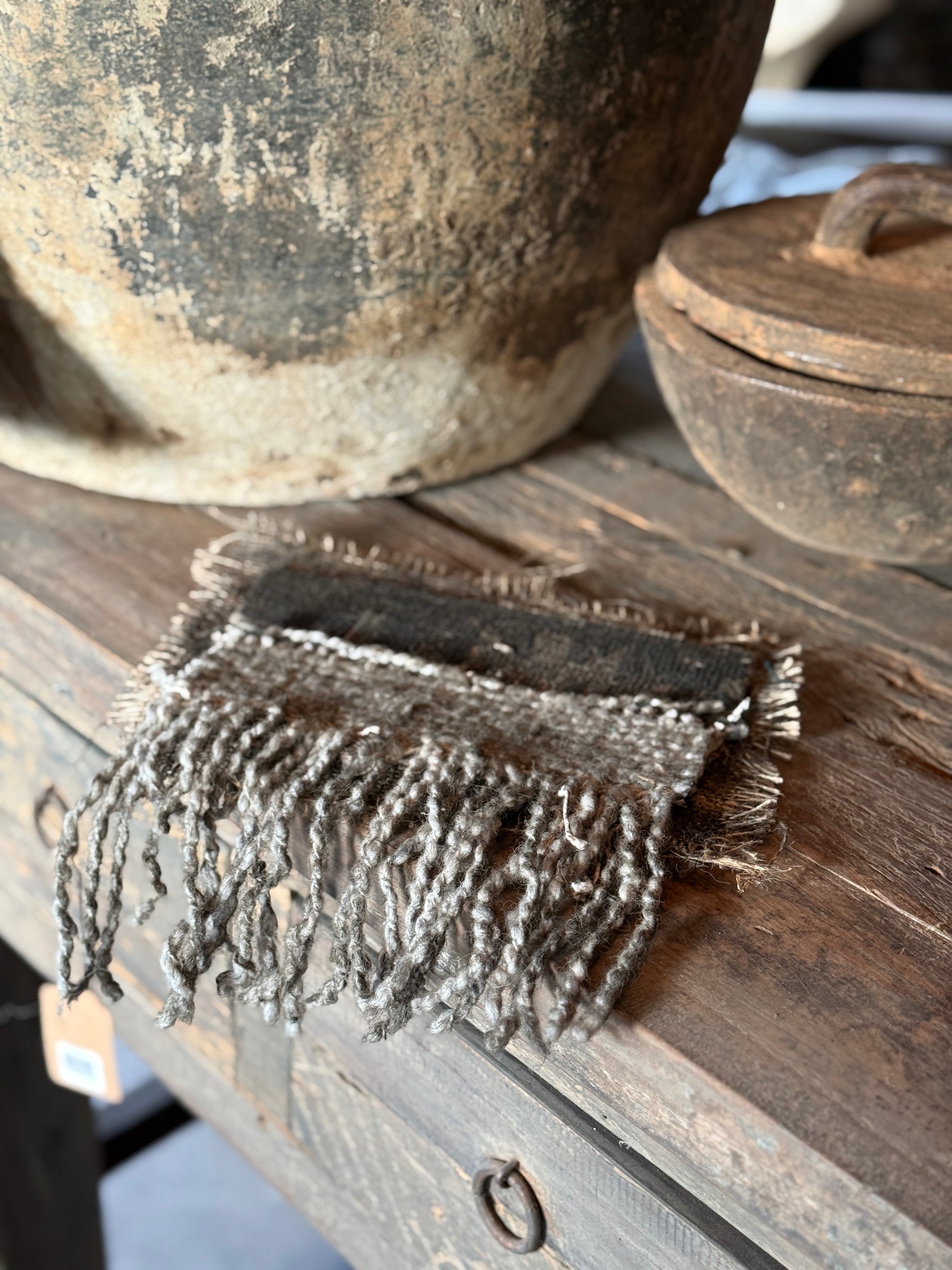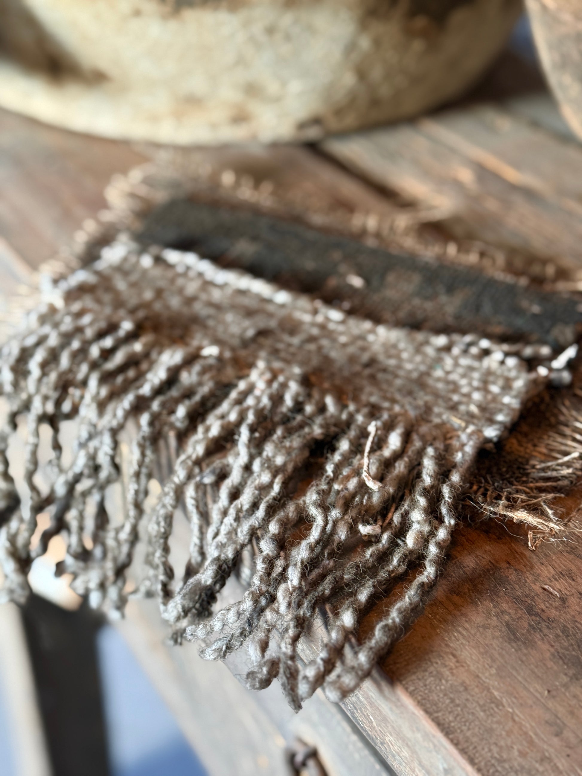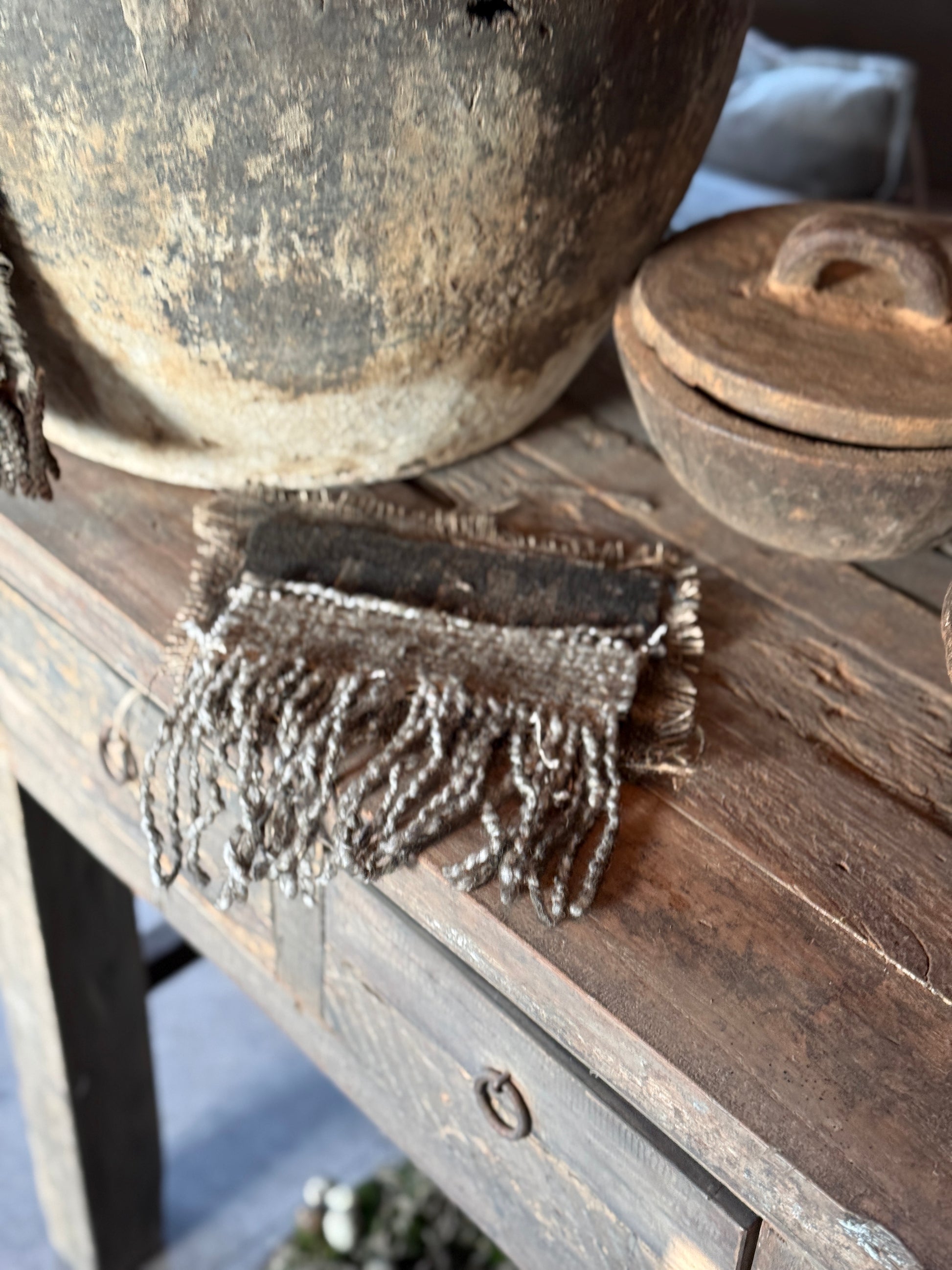 Das Material besteht aus Kelim-Stoff, Seil, Band, Jute und Kalkfarbe.