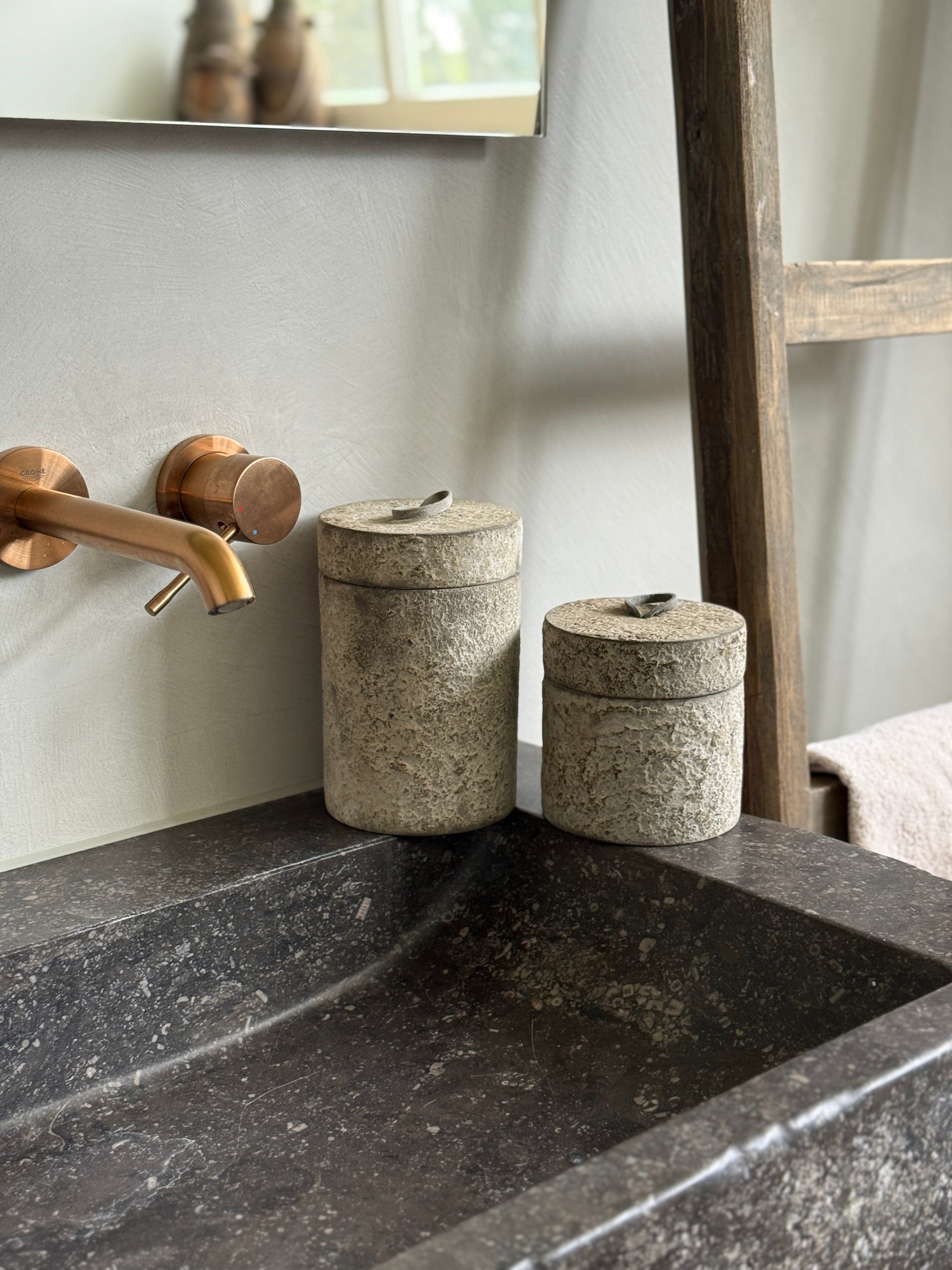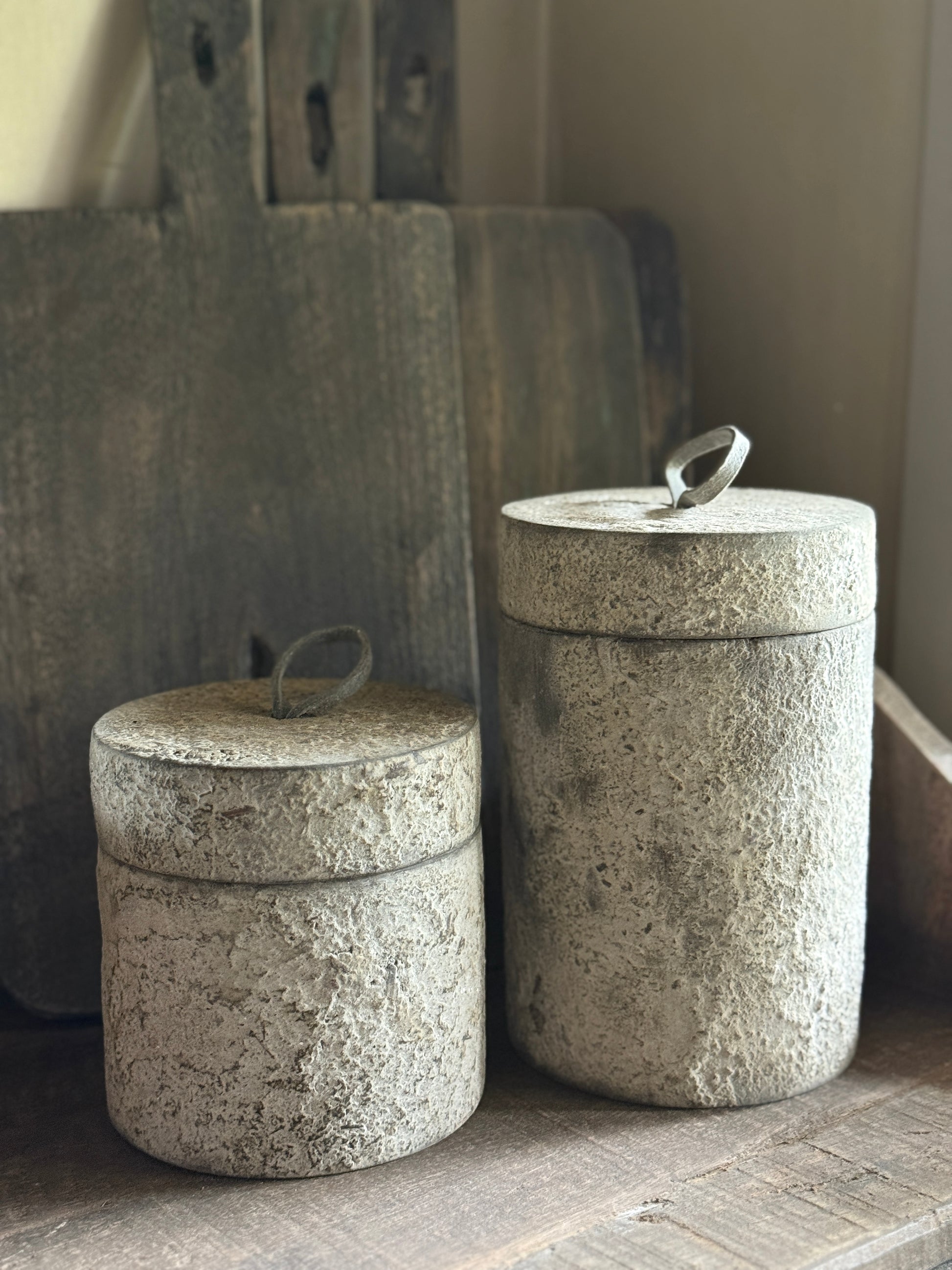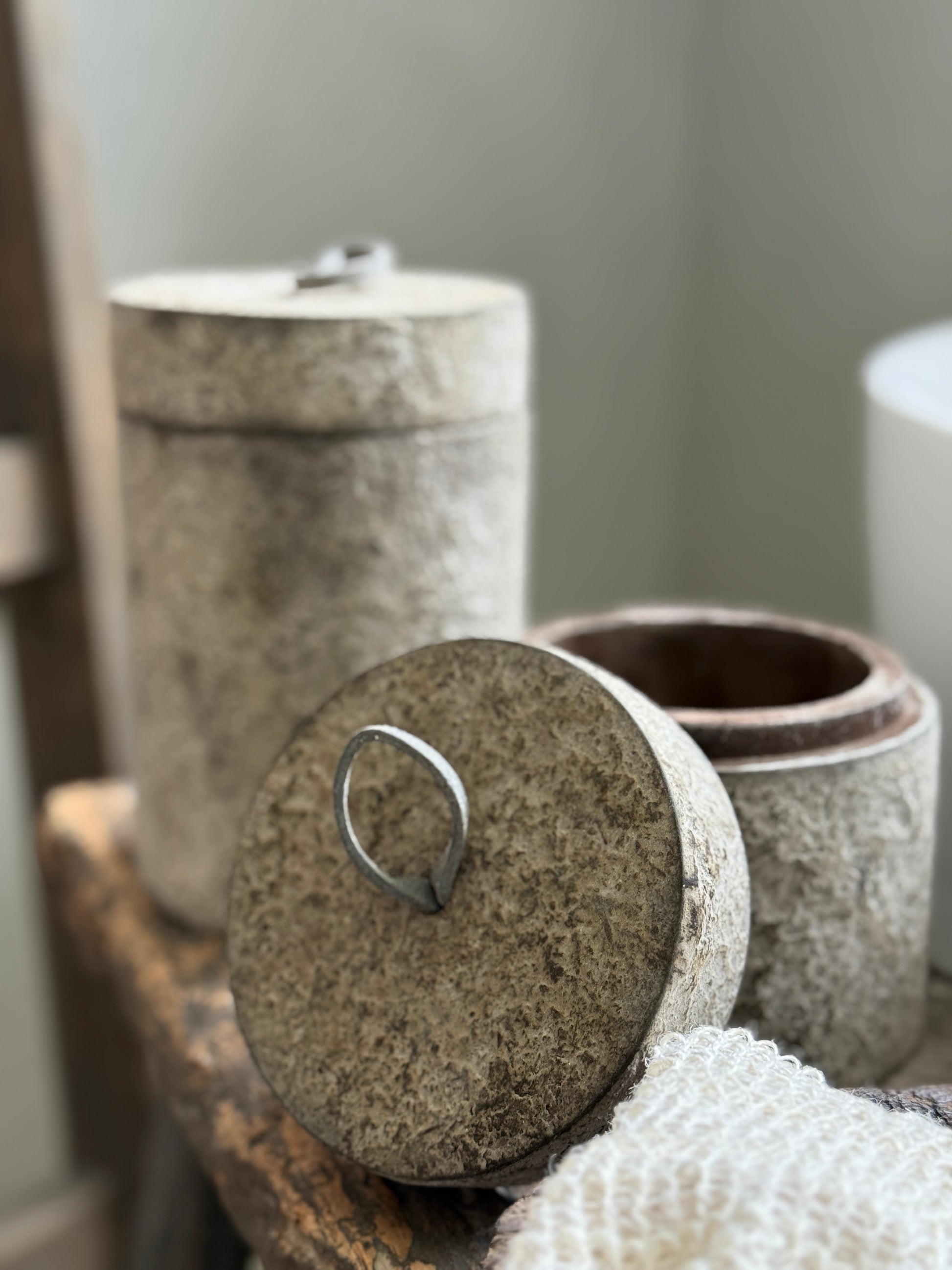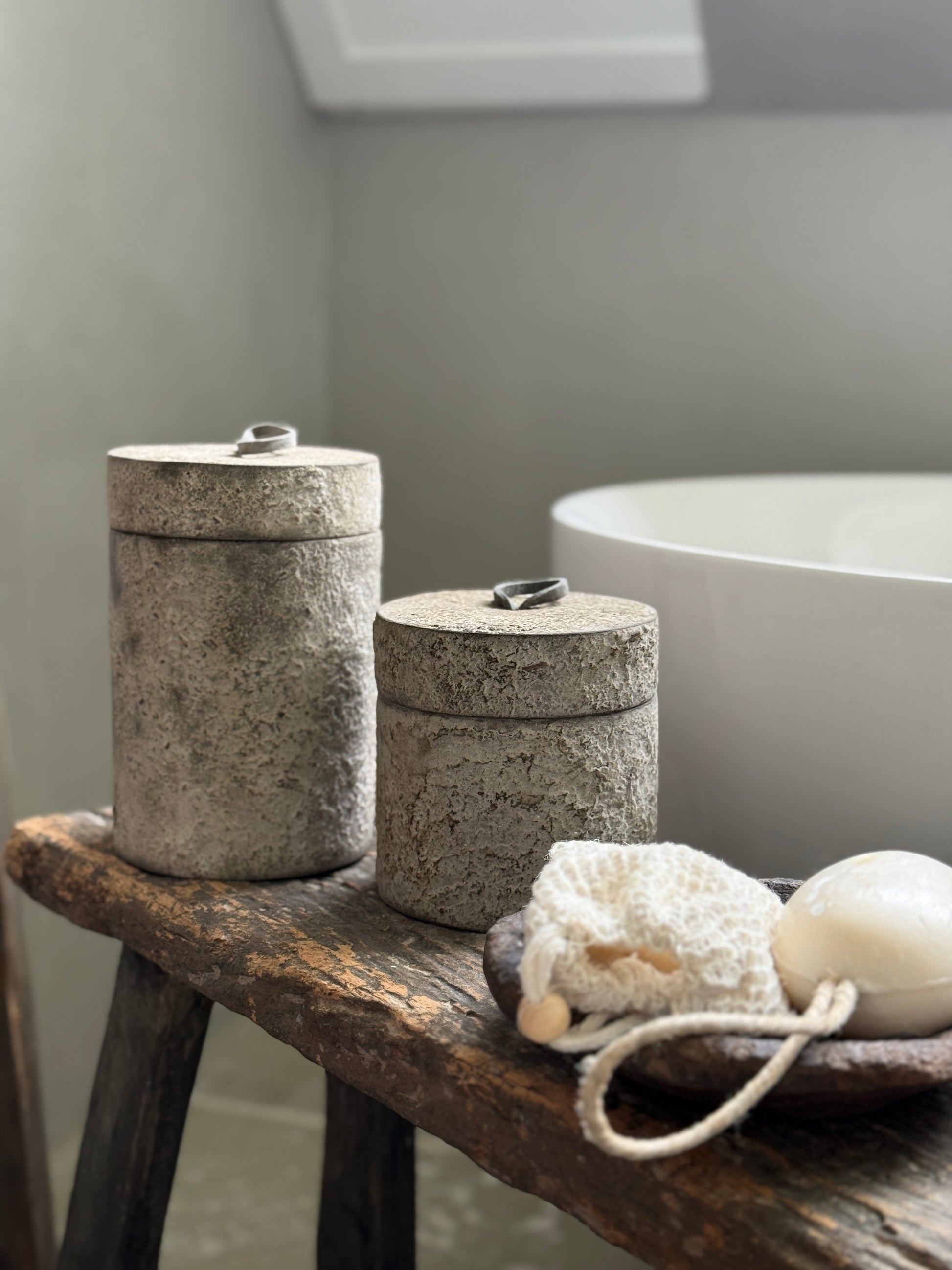 Dieses stilvolle Holzgefäß mit Deckel kombiniert natürliche Materialien mit einem robusten, rustikalen Look. Das Gefäß besticht durch sein verwittertes Beton-Finish und eine Lederschlaufe zum einfachen Öffnen. Seine einzigartige Oberfläche und das zeitlose Design machen dieses Gefäß multifunktional – ideal im Badezimmer für Wattepads oder Schmuck, im Wohnzimmer zur Aufbewahrung oder in der Küche für kleine Küchenutensilien.