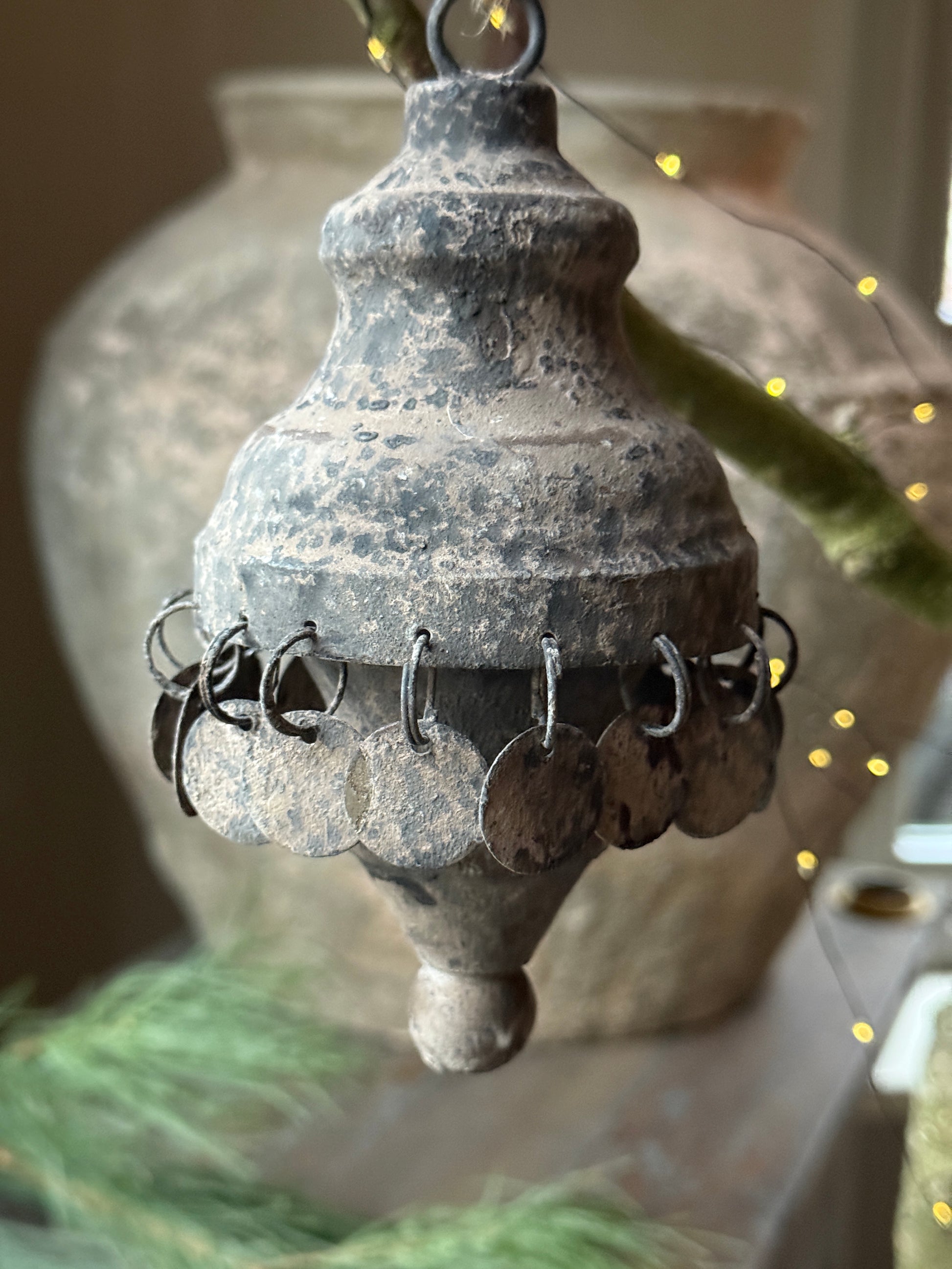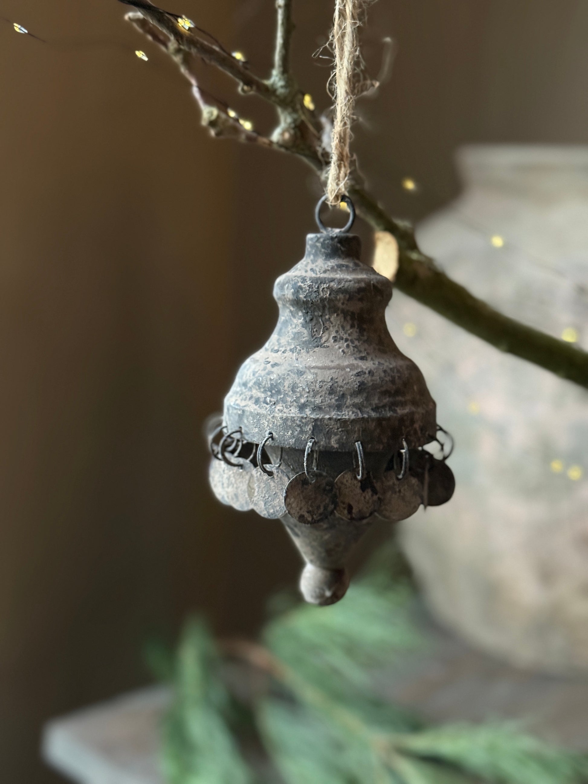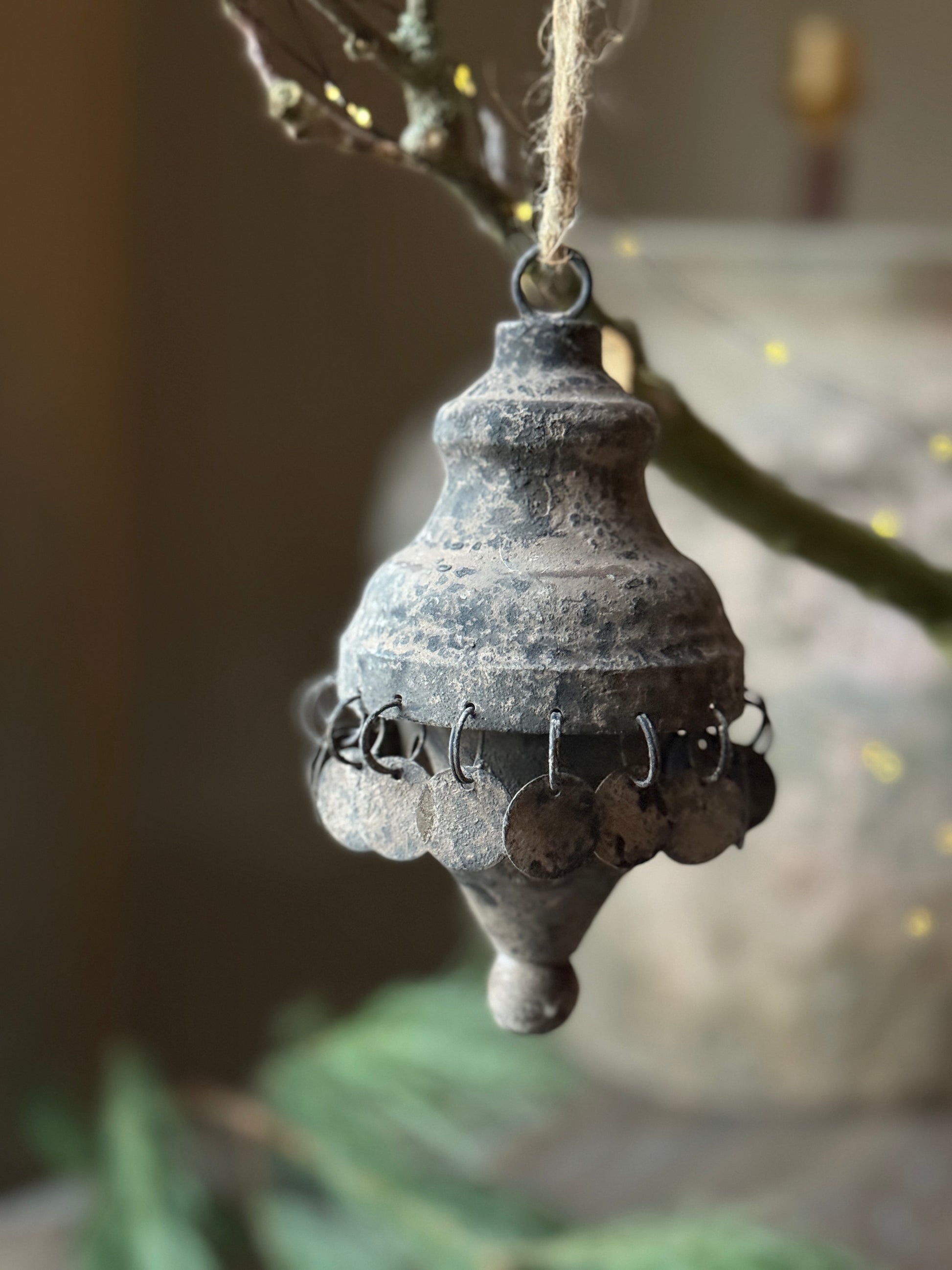 Dieser robuste Weihnachtsschmuck in Dunkelgrau mit dezentem Vintage-Look wirkt besonders wertig. Der Rand ist mit einer einzelnen Münzreihe verziert, was dem Schmuckstück eine verspielte und zugleich stilvolle Note verleiht. Perfekt für eine schlichte, rustikale Weihnachtsdekoration mit einem markanten Akzent.