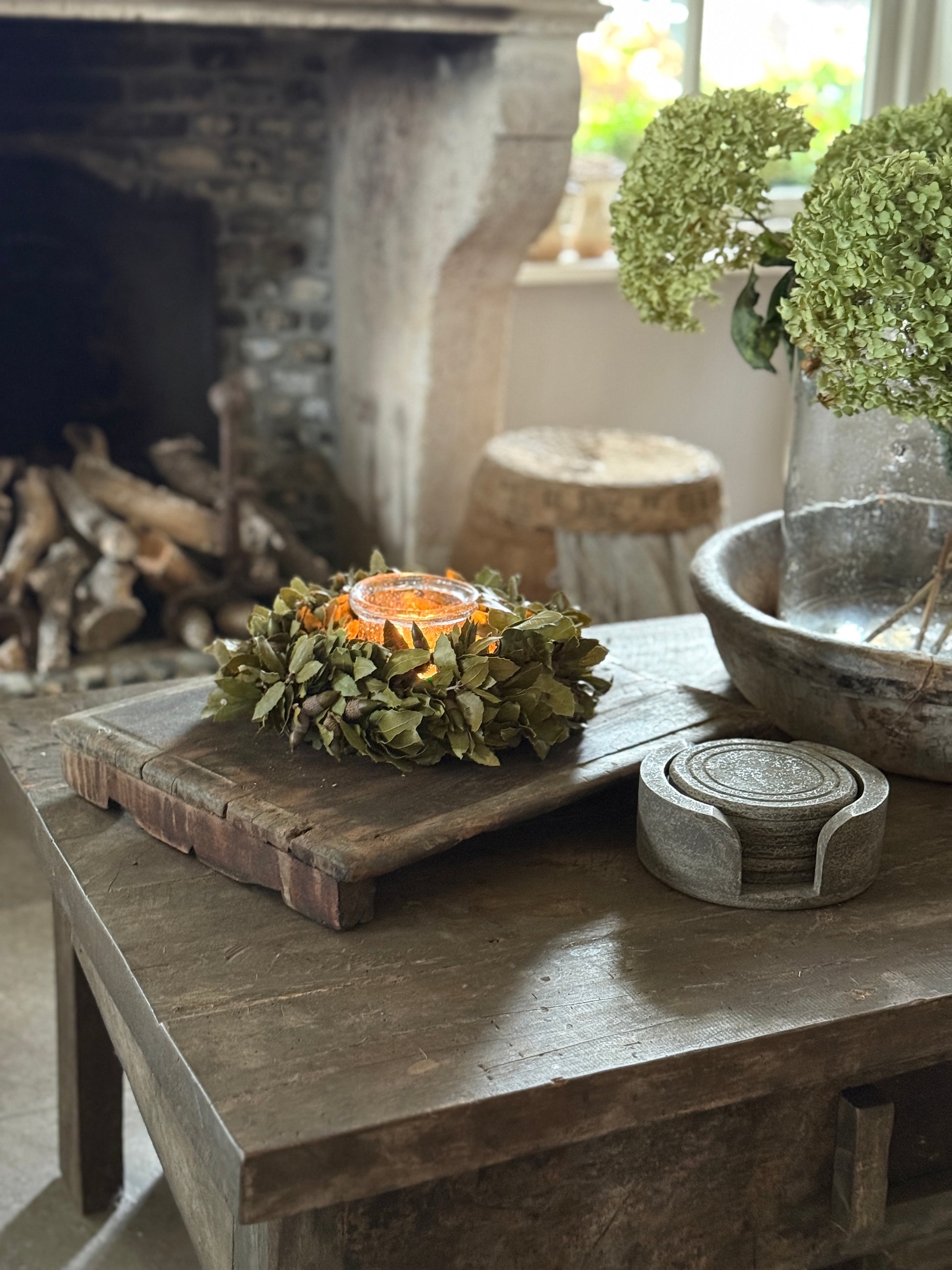 Das Bild zeigt den Kranz in Kombination mit der Mooss-Laterne in der Größe XS – eine schöne Ergänzung für jedes Landhaus-Interieur.