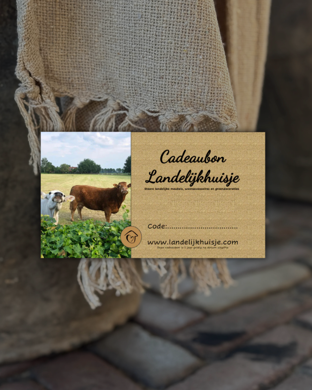 Auf der Suche nach einem originellen und stimmungsvollen Geschenk? Mit dem Landelijkhuisje-Geschenkgutschein geben Sie sich die Freiheit, etwas Schönes aus unserer Kollektion an Landhausaccessoires, Möbeln und grüner Dekoration auszuwählen. Vom robusten Holzartikel über den stimmungsvollen Kranz bis hin zum einzigartigen Hingucker für die Inneneinrichtung ist für jeden etwas dabei.