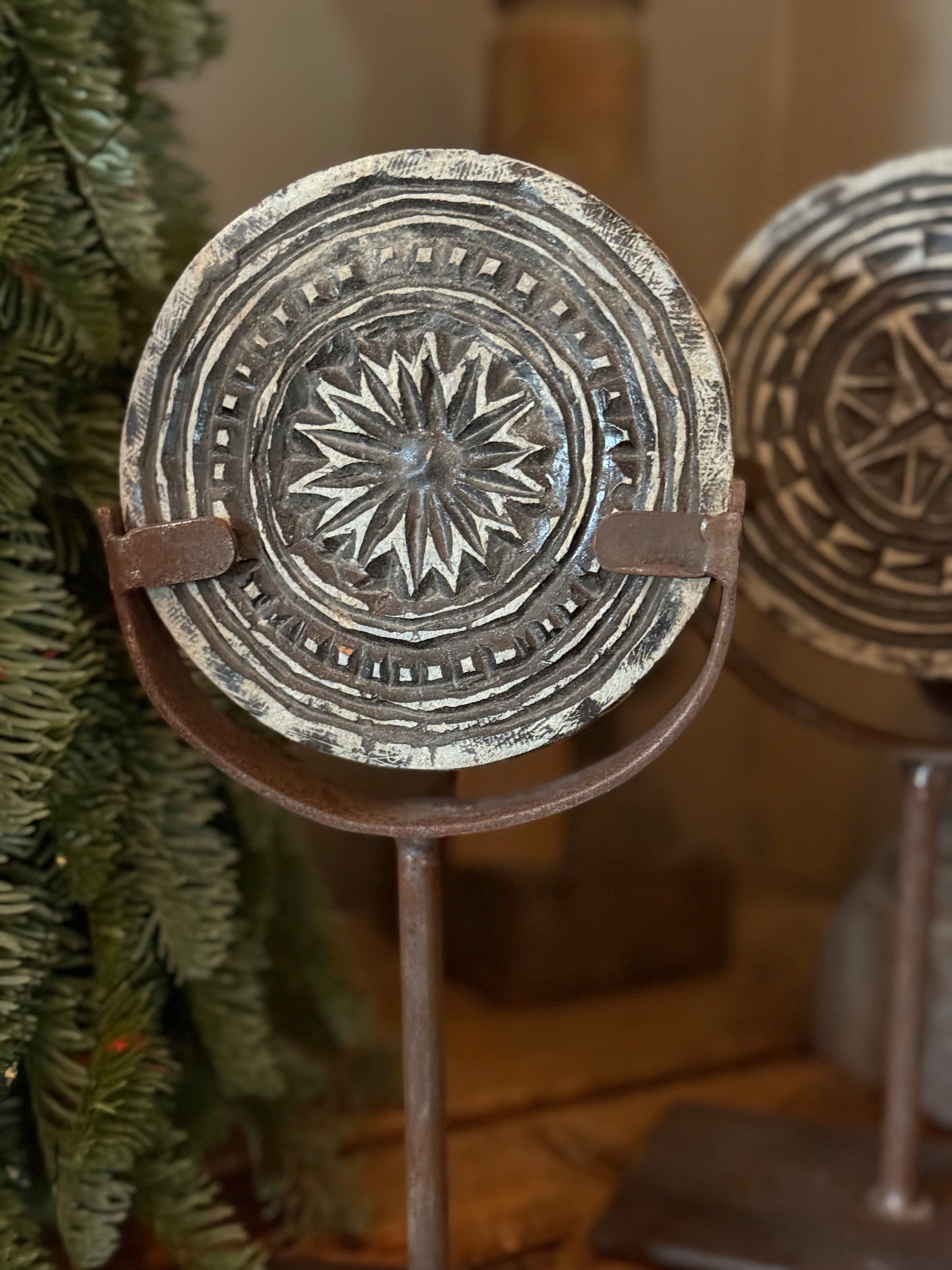 Dieser antike Mandela-Stein ist ein einzigartiges und authentisches Dekorationsobjekt, das Ihrem Interieur sofort Charakter verleiht. Der Stein ist in einem stabilen Eisenrahmen auf einem Ständer eingefasst und stellt somit eine wunderschöne, kunstvolle und handwerkliche Bereicherung dar.