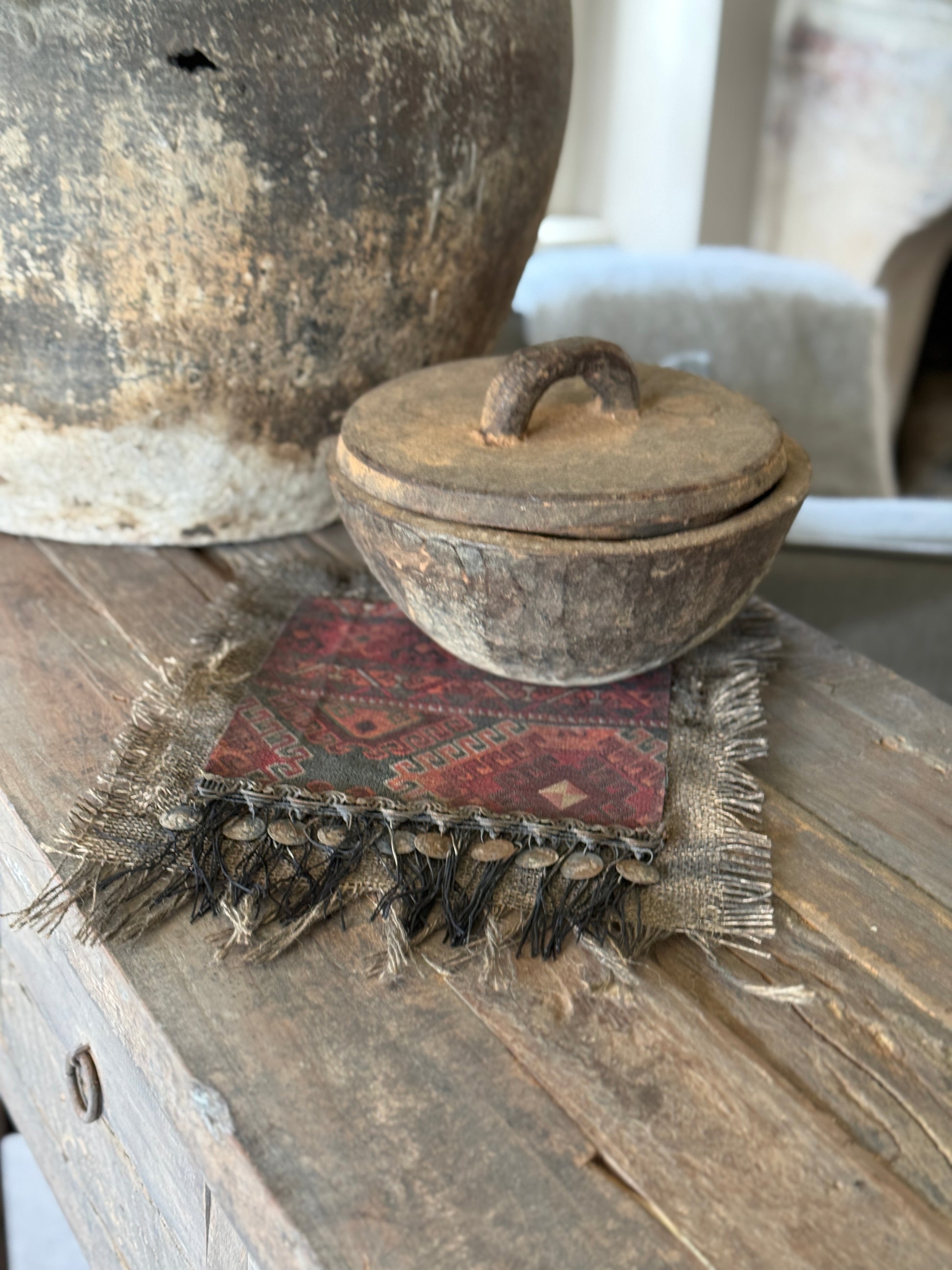 Dit handgemaakte Granny’s kleedje is een sfeervol en decoratief item met een authentieke, landelijke uitstraling. Het kleedje is met zorg samengesteld uit kelimstof, touw, lint, jute en afgewerkt met kalkverf, wat zorgt voor een uniek en doorleefd karakter. Elk exemplaar is handgemaakt en daardoor net even anders.
