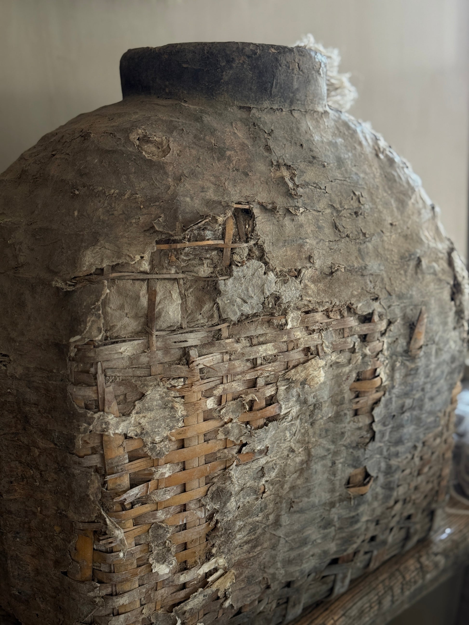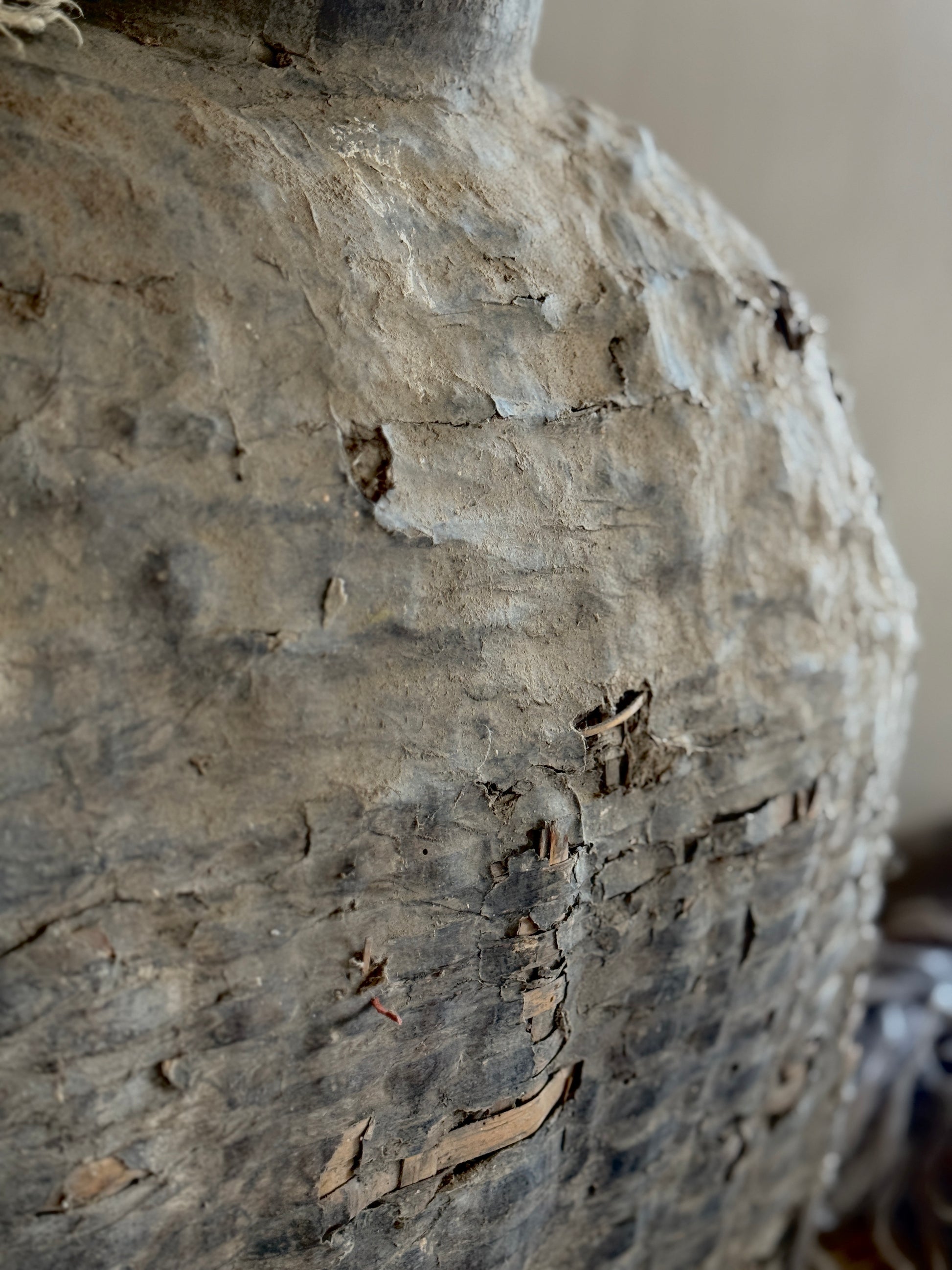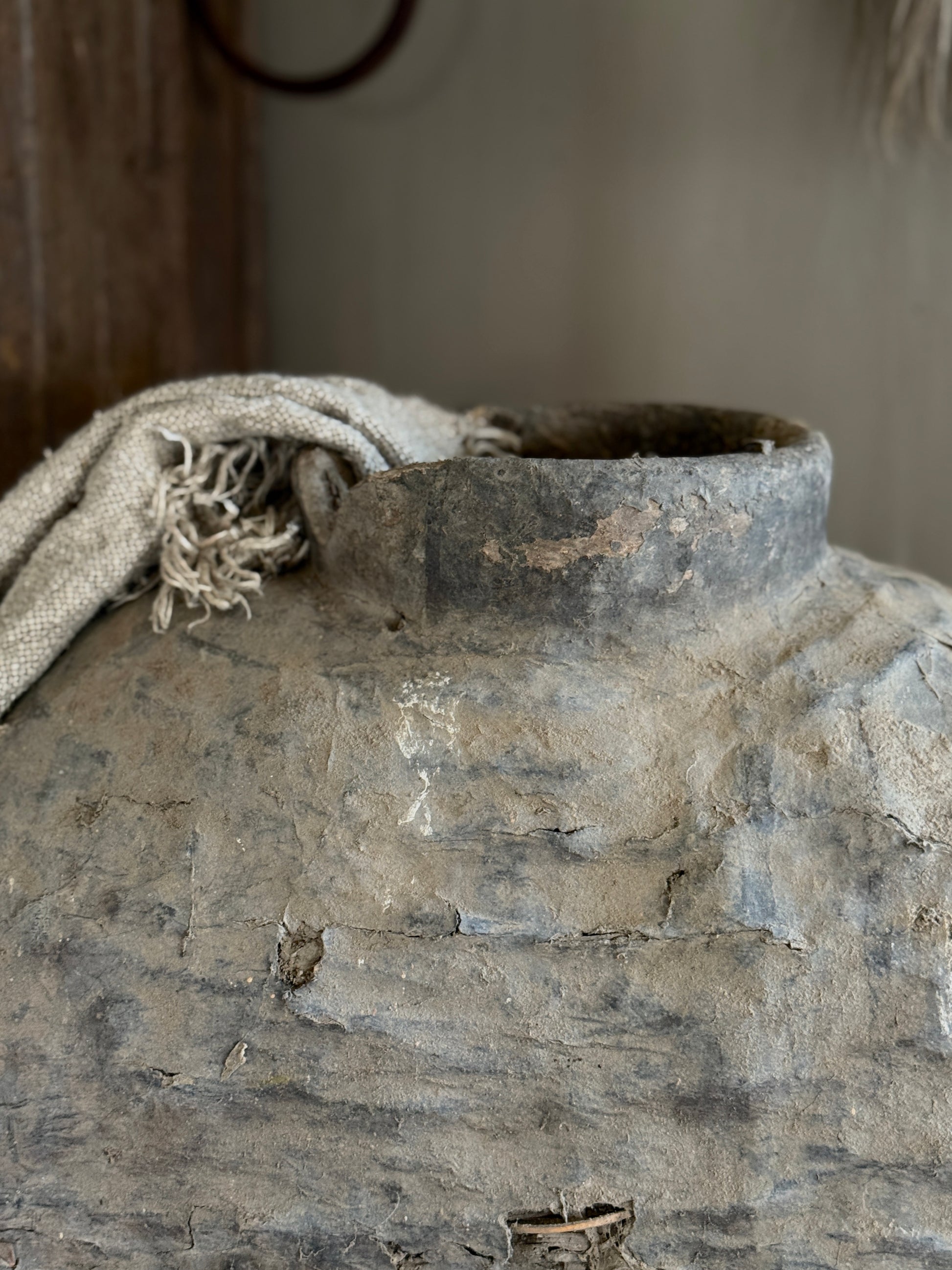 This old clay basket is an authentic object originally from India , where this type of basket was traditionally used for storing and transporting grain, flour, or other raw materials. Years of use have given each basket a unique, weathered appearance and the basket shows signs of wear, making it one of a kind.