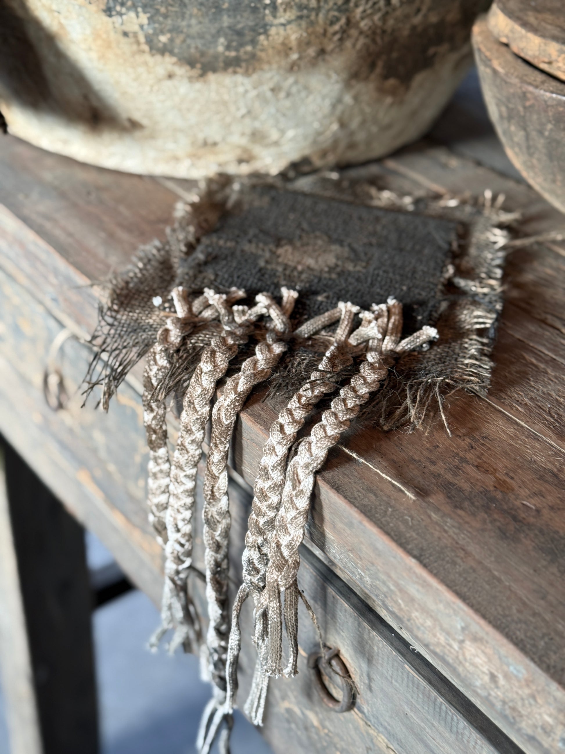 This handmade Granny's rug is a charming and decorative piece with an authentic, rustic look. Carefully crafted from kilim fabric, rope, ribbon, and jute, it's finished with chalk paint, giving it a unique and timeworn character. Each piece is handmade and therefore slightly different.