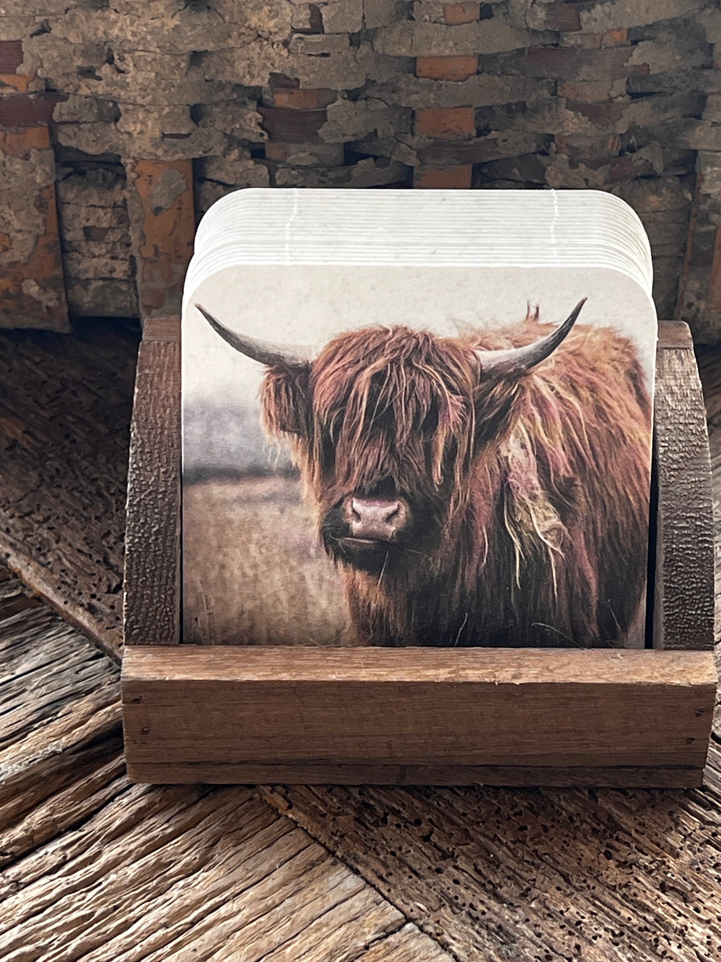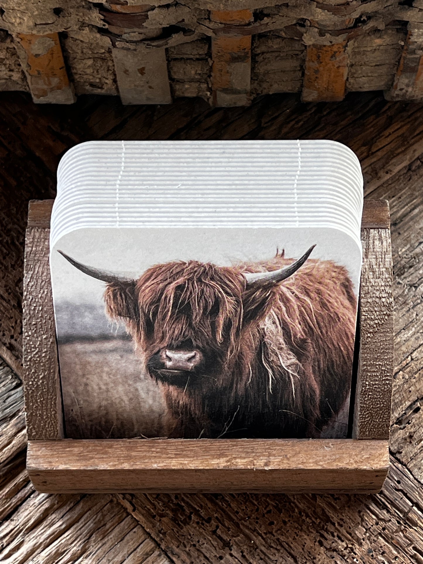 This set consists of a wooden holder with 20 pieces of hard cardboard coasters with the print of a buffalo on both sides with a light background.