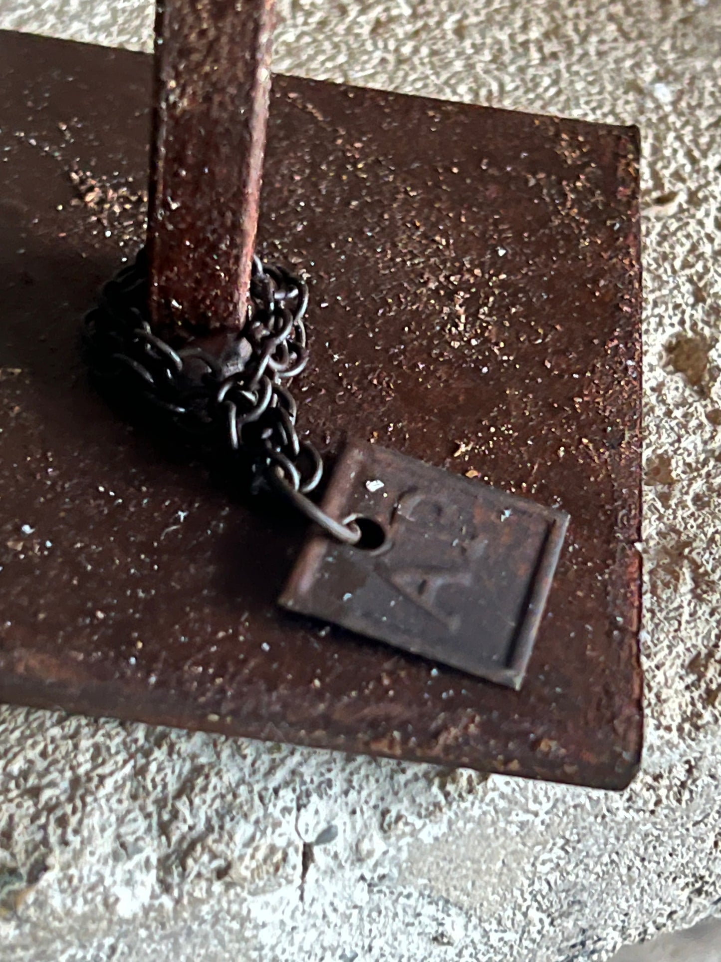 This super cool table candlestick "Marrakech" by Aura Peeperkorn is a real eye-catcher for every table. Made of iron in a unique, weathered rust version, it exudes a tough and authentic charm. The finished rusted pendant on a chain adds a subtle, extra detail, making the candlestick even more characterful.