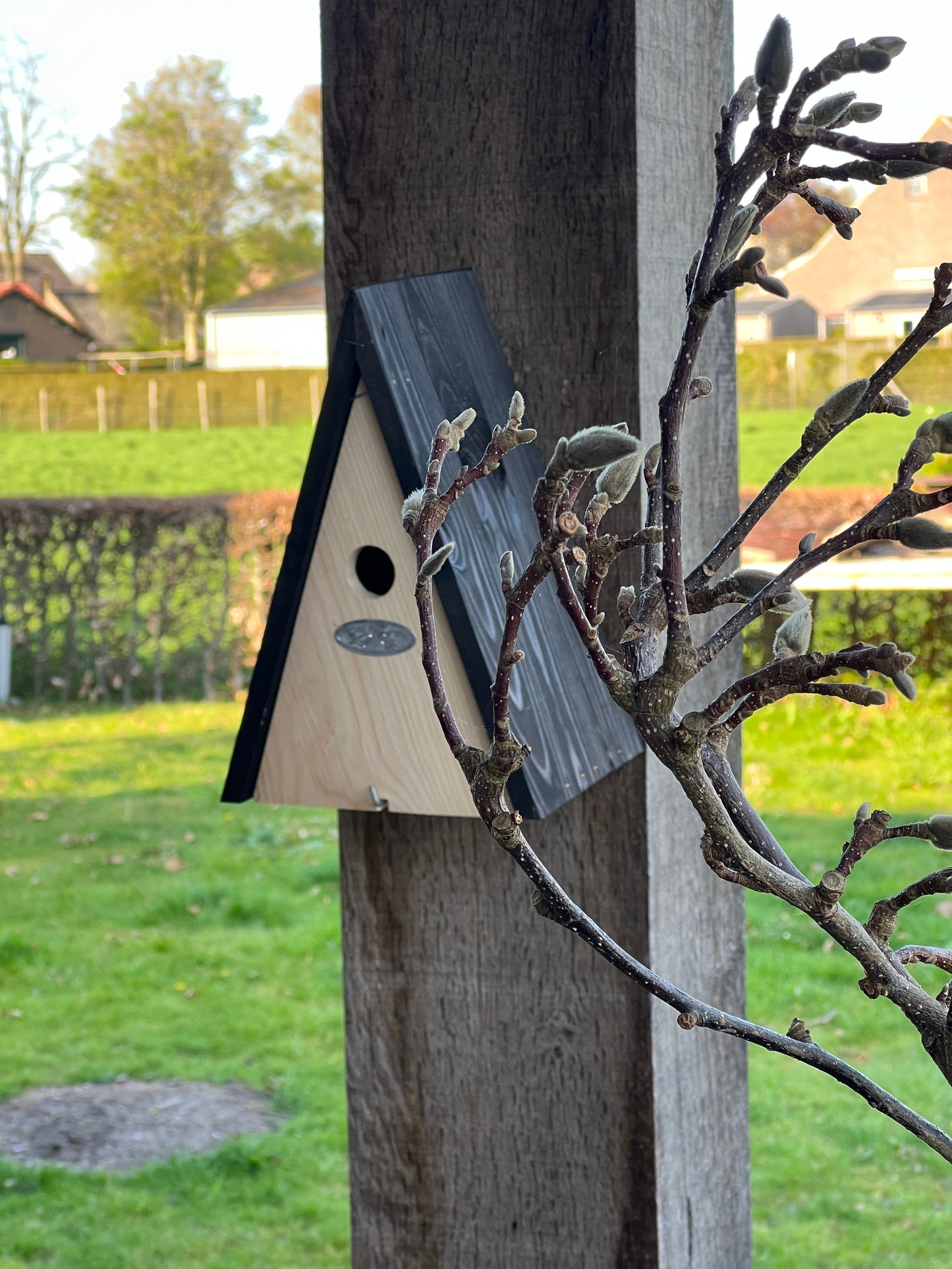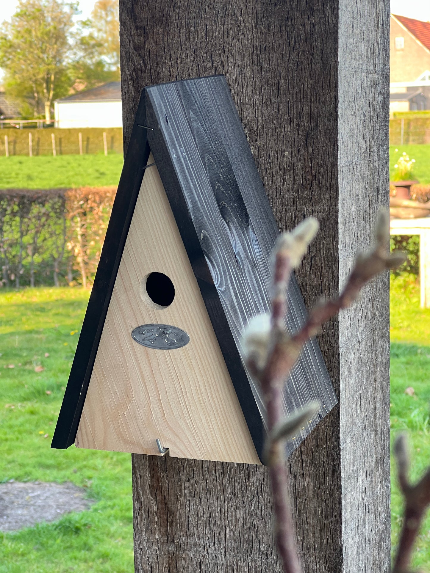 This rural bird house looks cozy in your garden and attracts the birds.