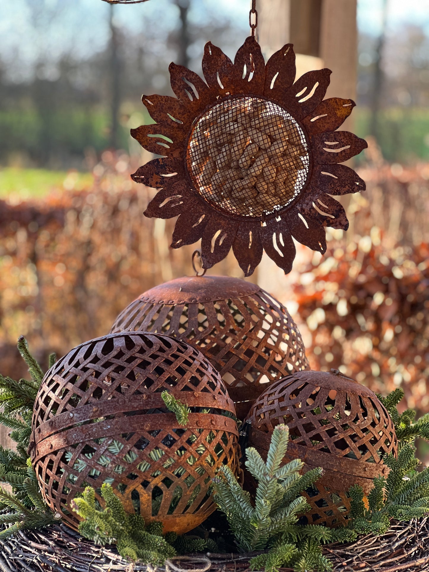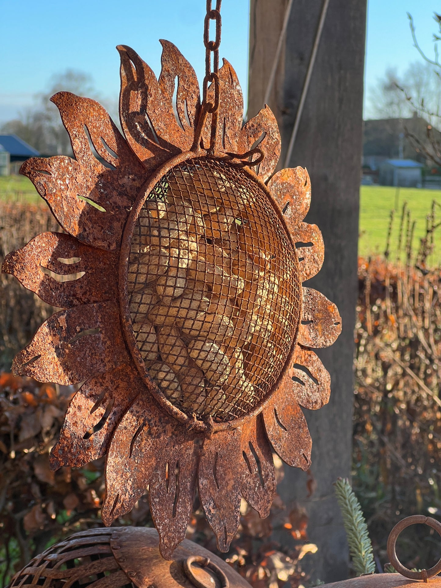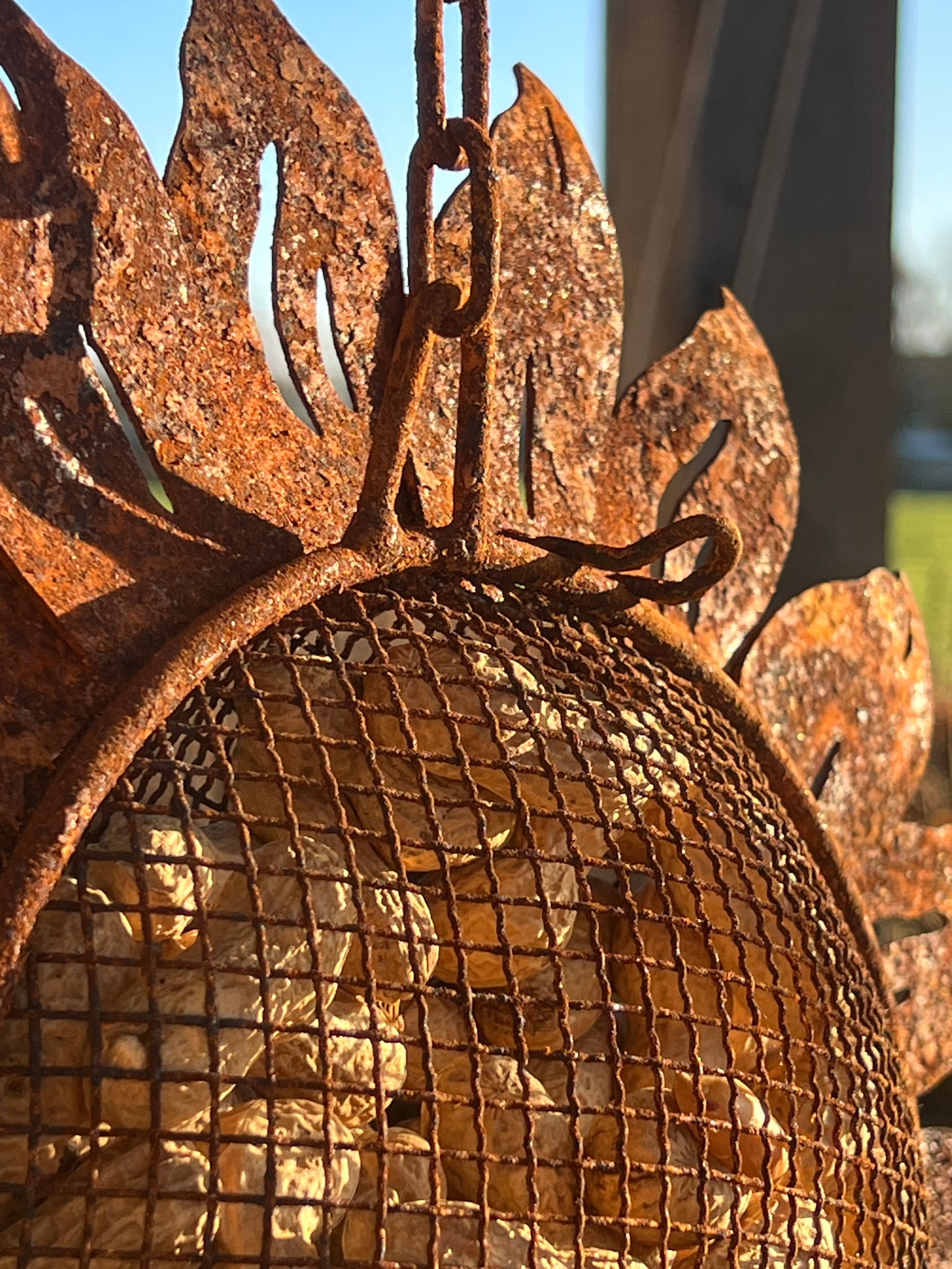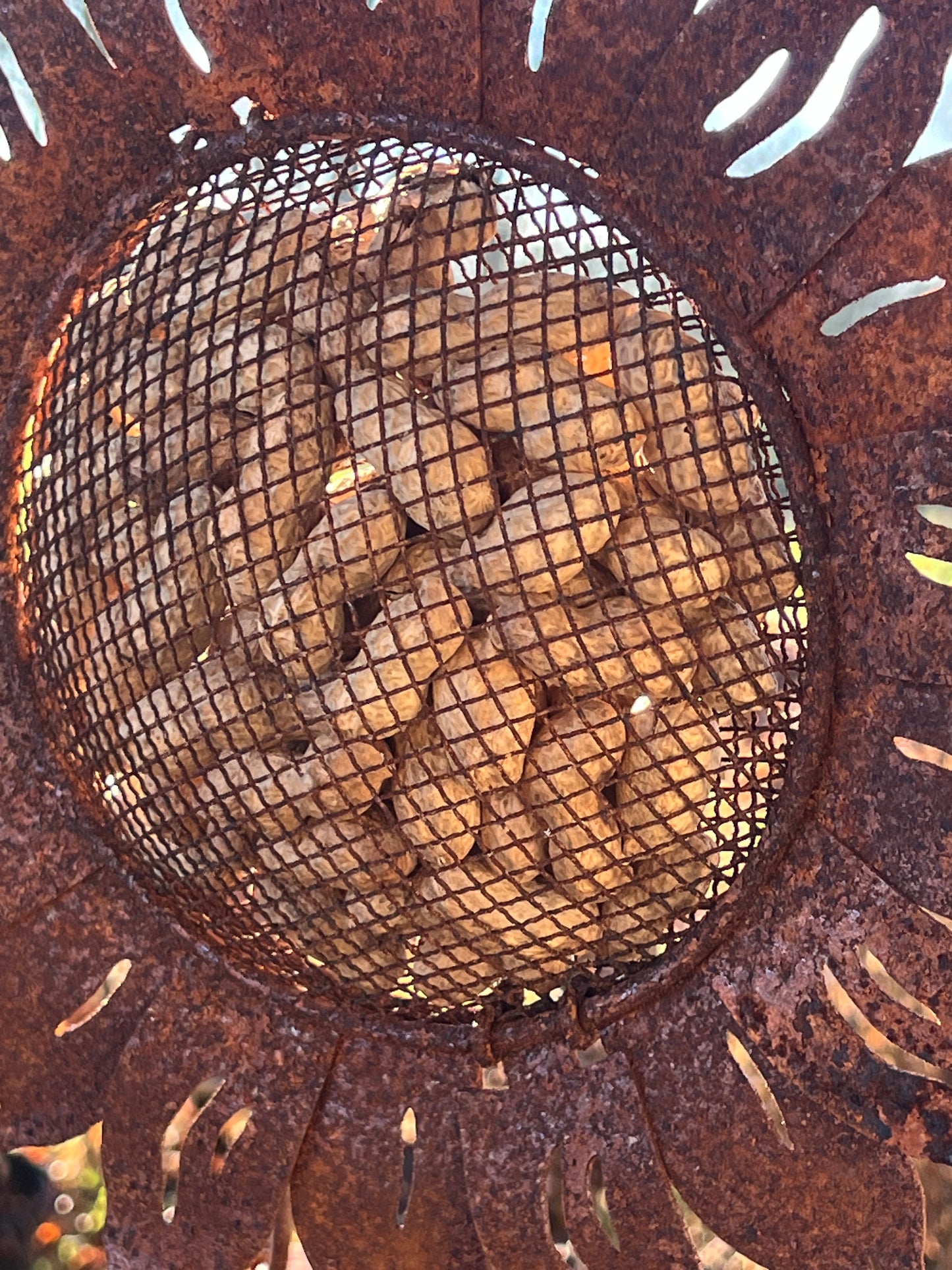 Product Description: Bird Food Hanger in the Shape of a Rusted Sunflower