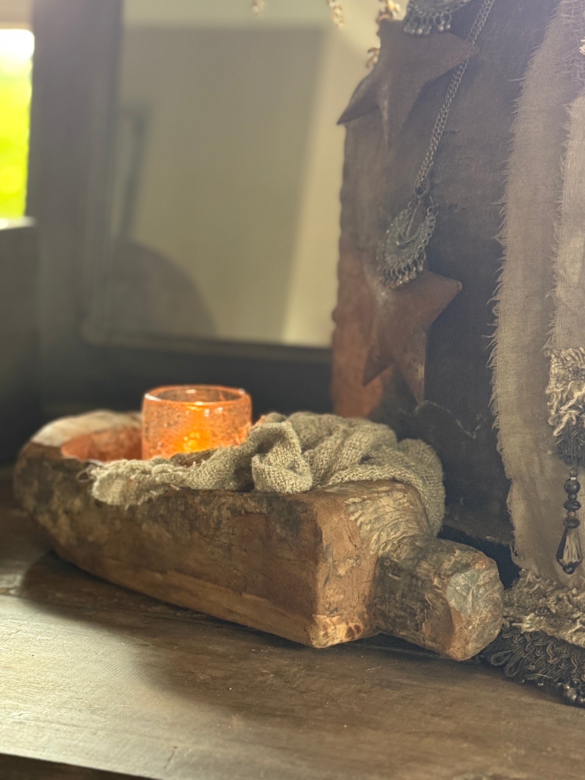 This unique , old wooden mortar with a handle originates from India and bears the marks of a long past. With its weathered appearance and robust shape, it's a unique decorative item that fits perfectly into a rugged, rustic interior .