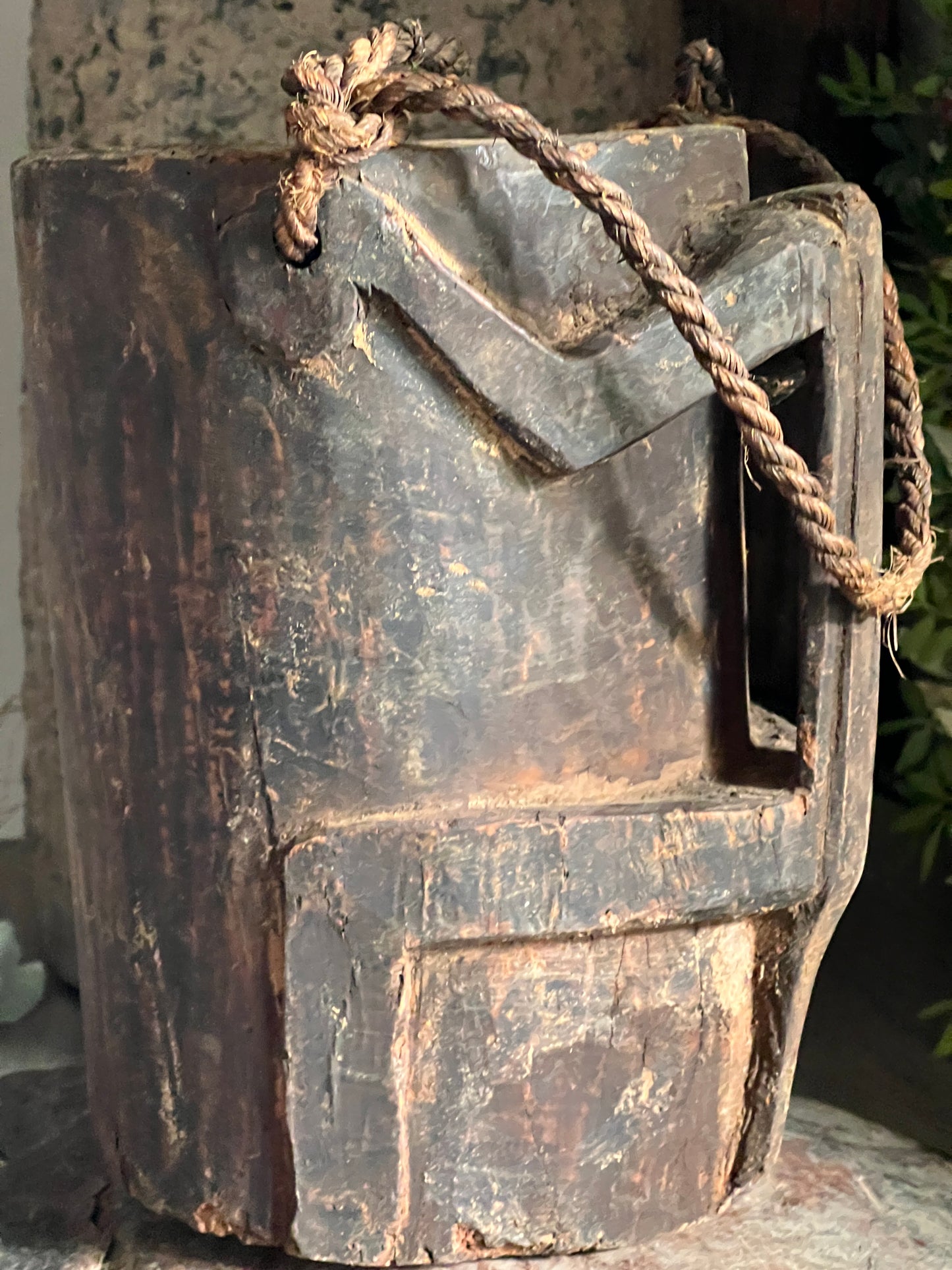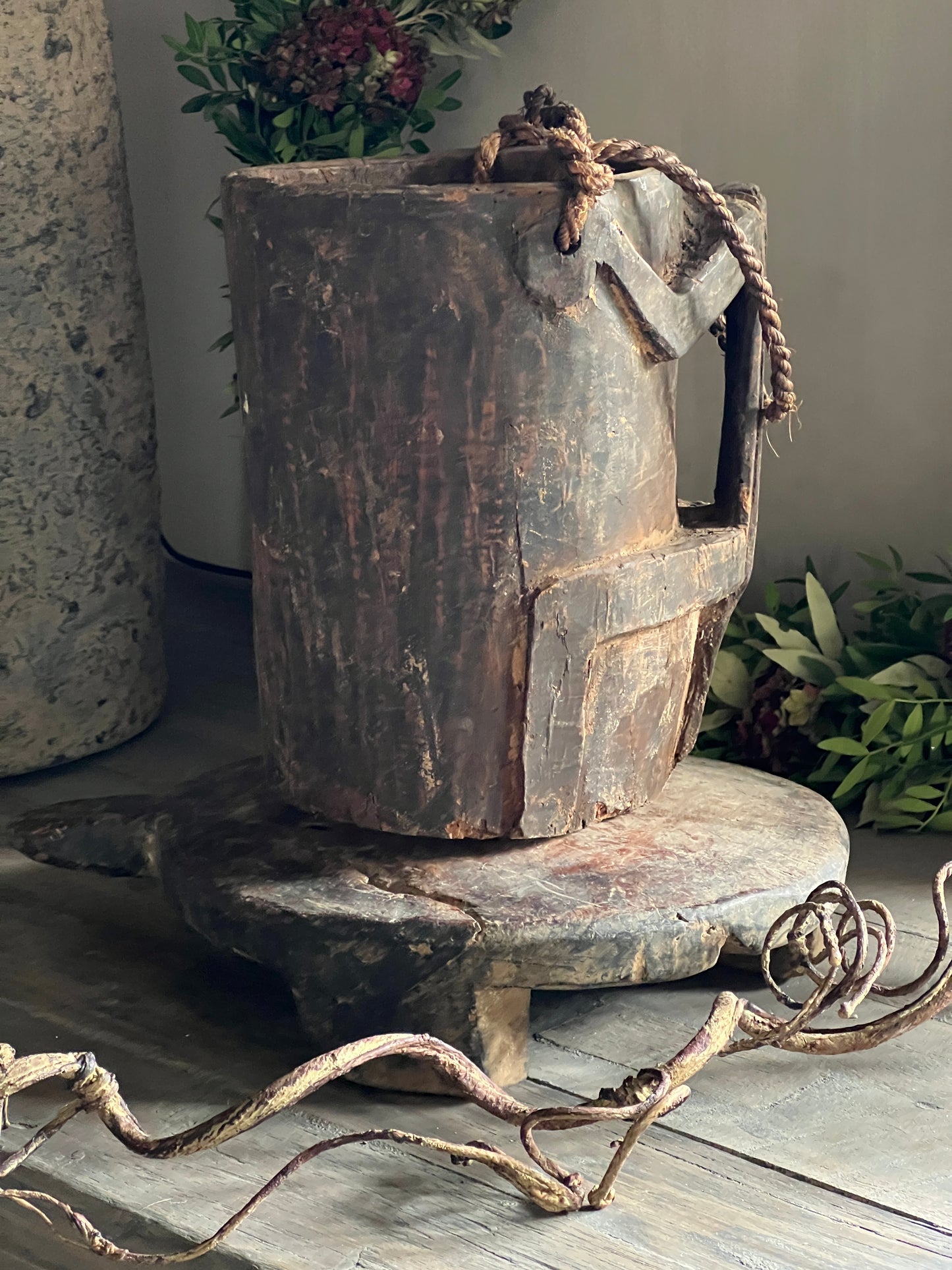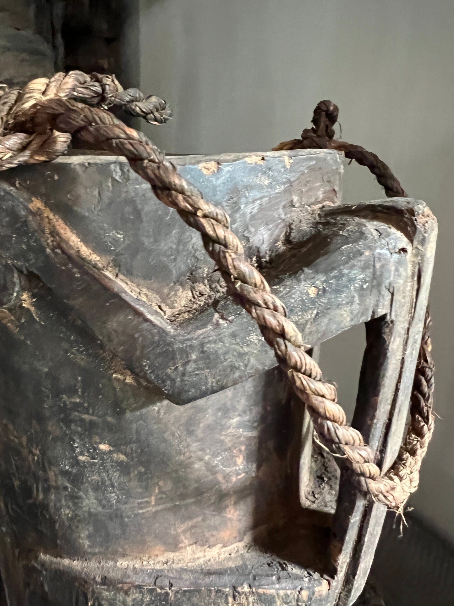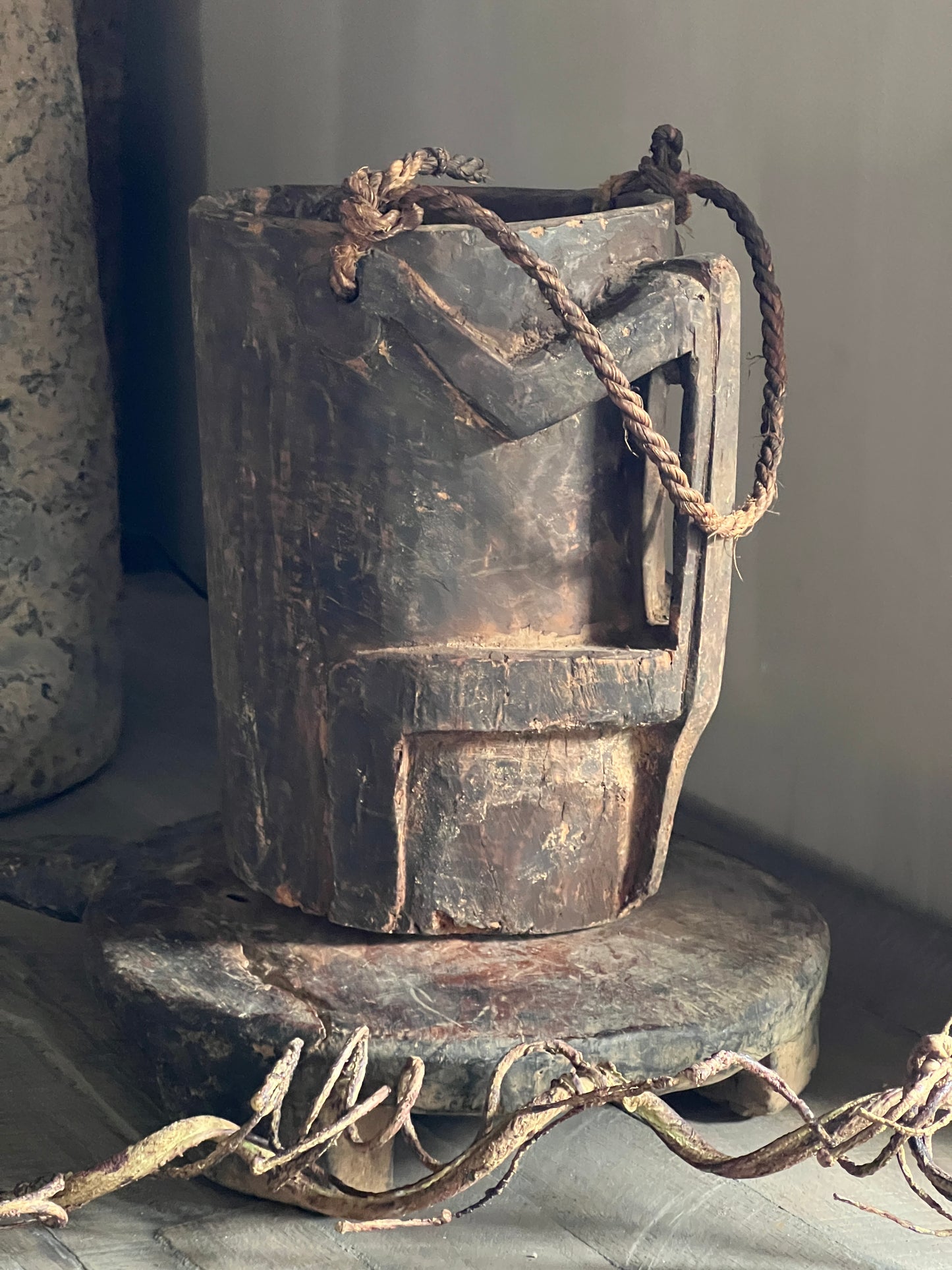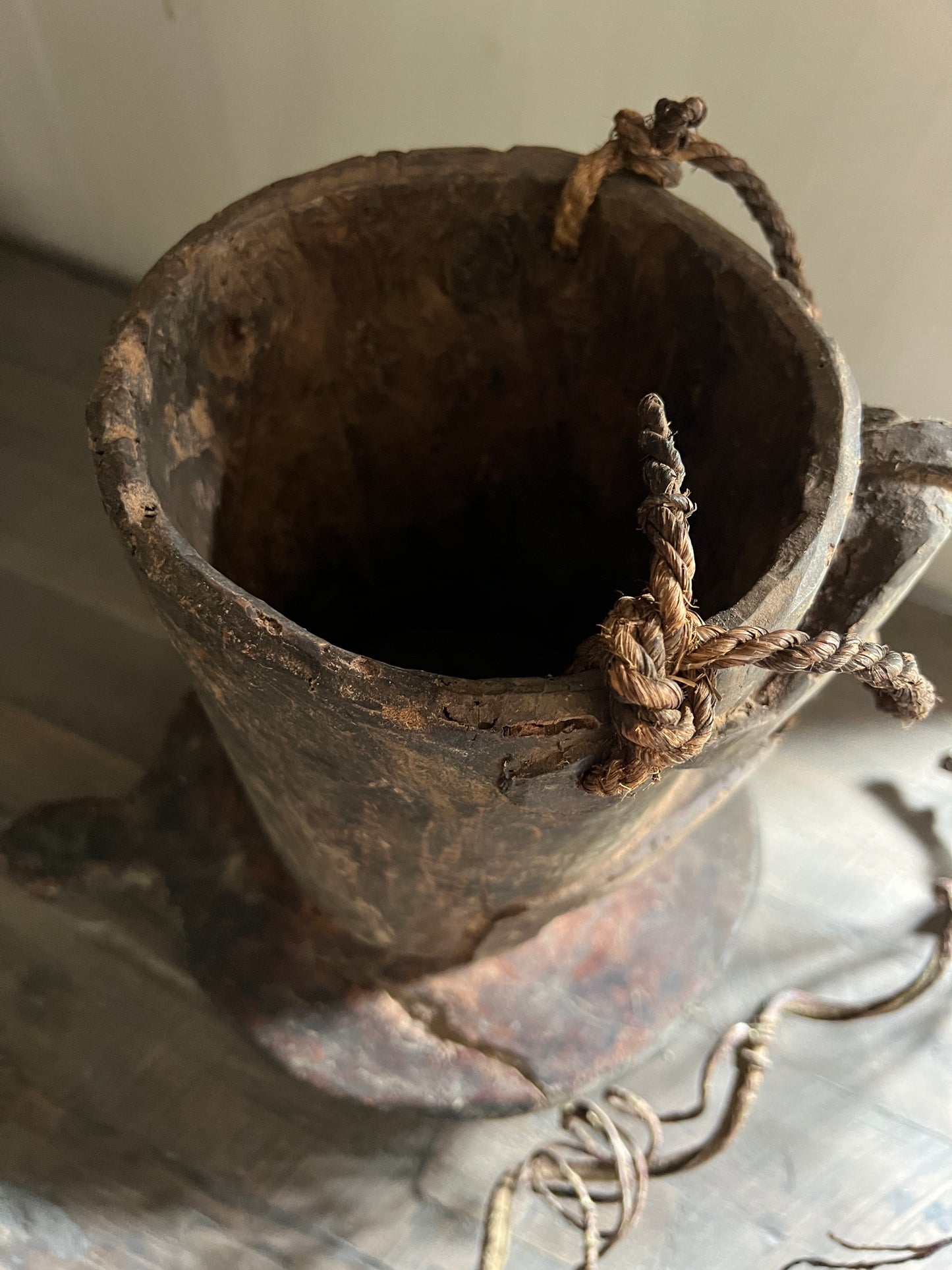 Robuuste en sobere pot, mooi van eenvoud met het unieke handvat. en bovenaan een stoer touw