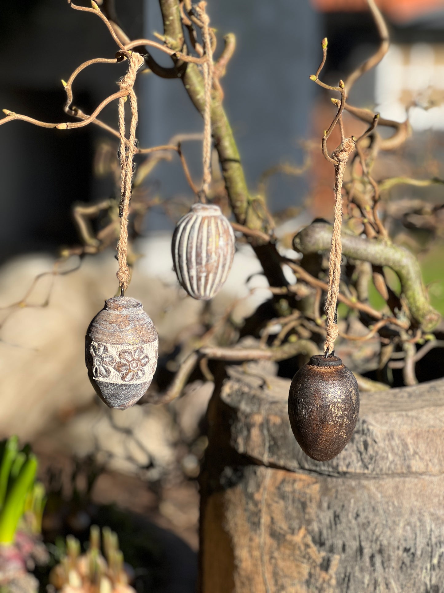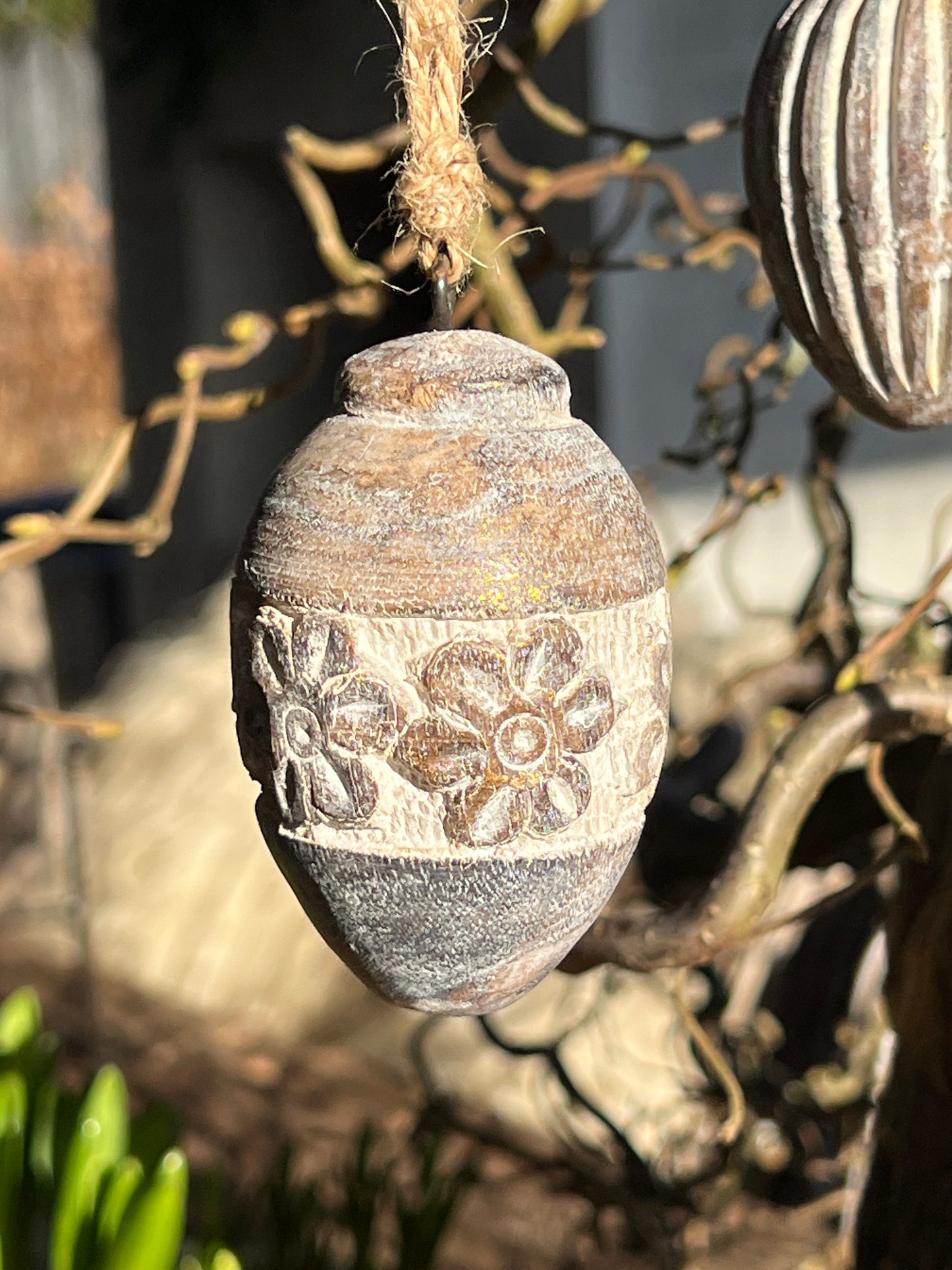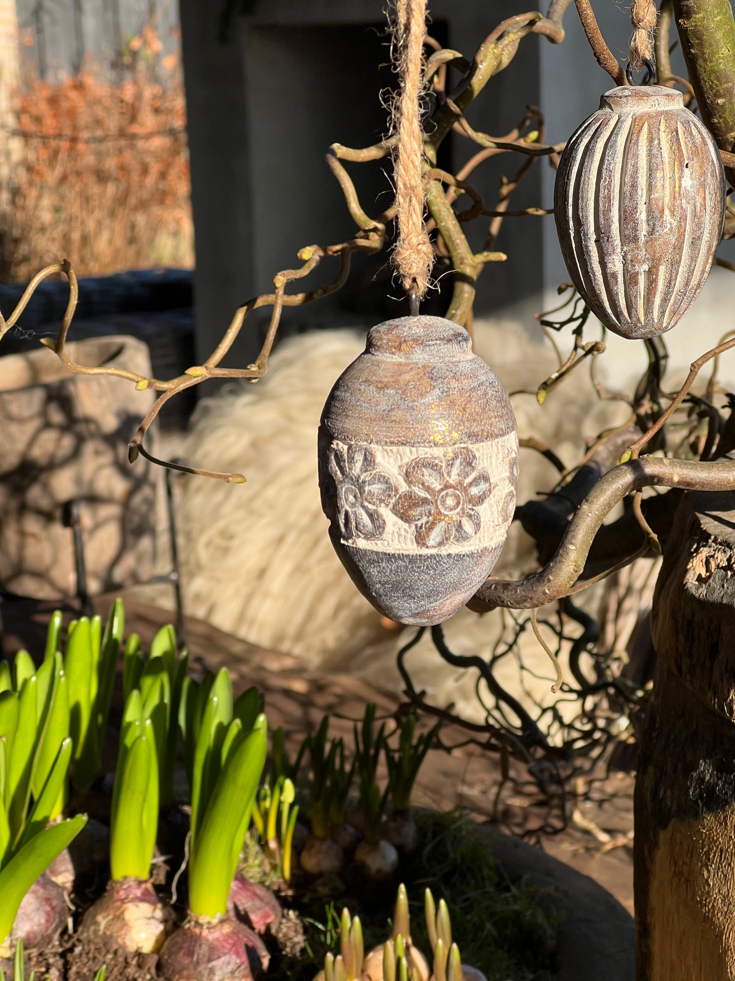 Het ei heeft een white wash laag met een vleugje goud er overheen.