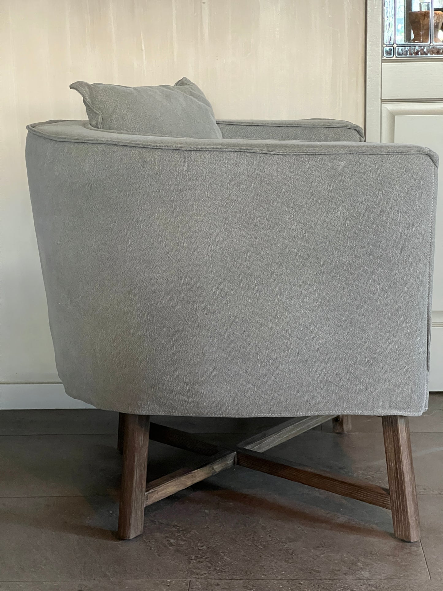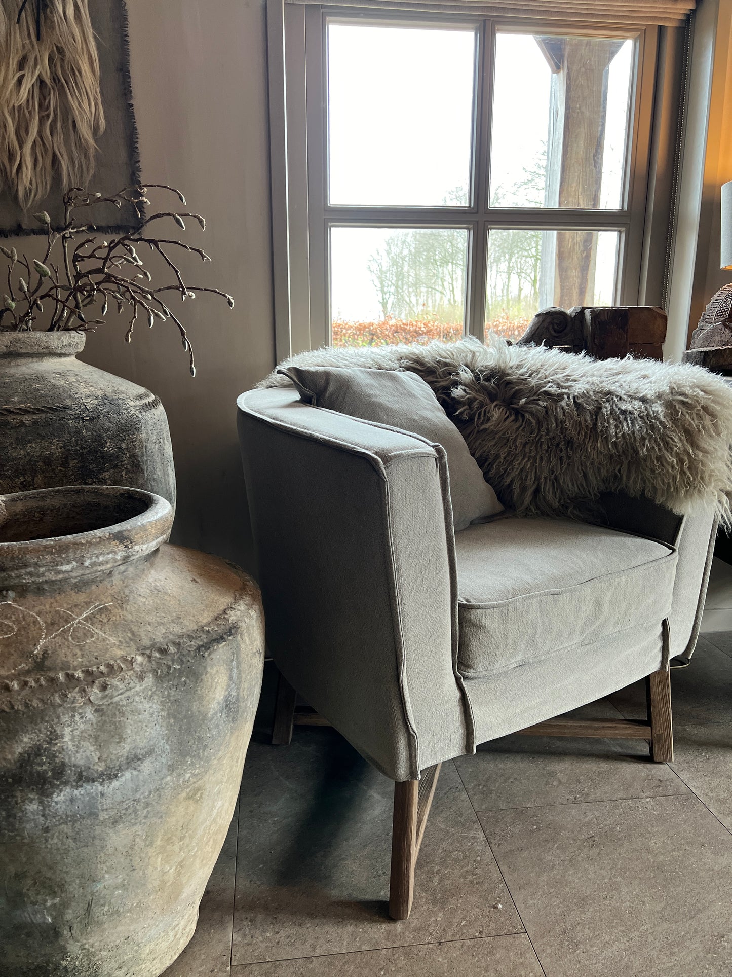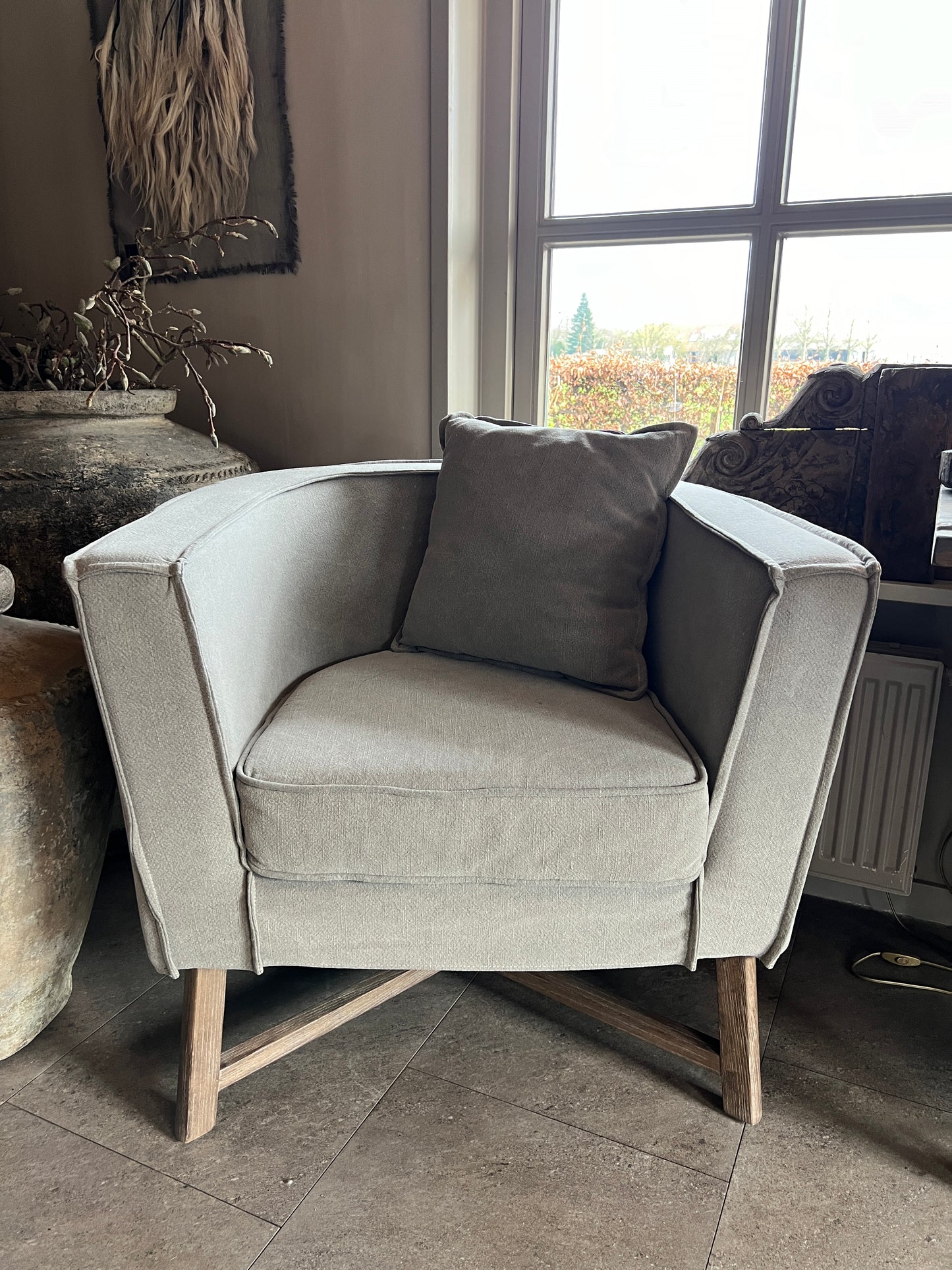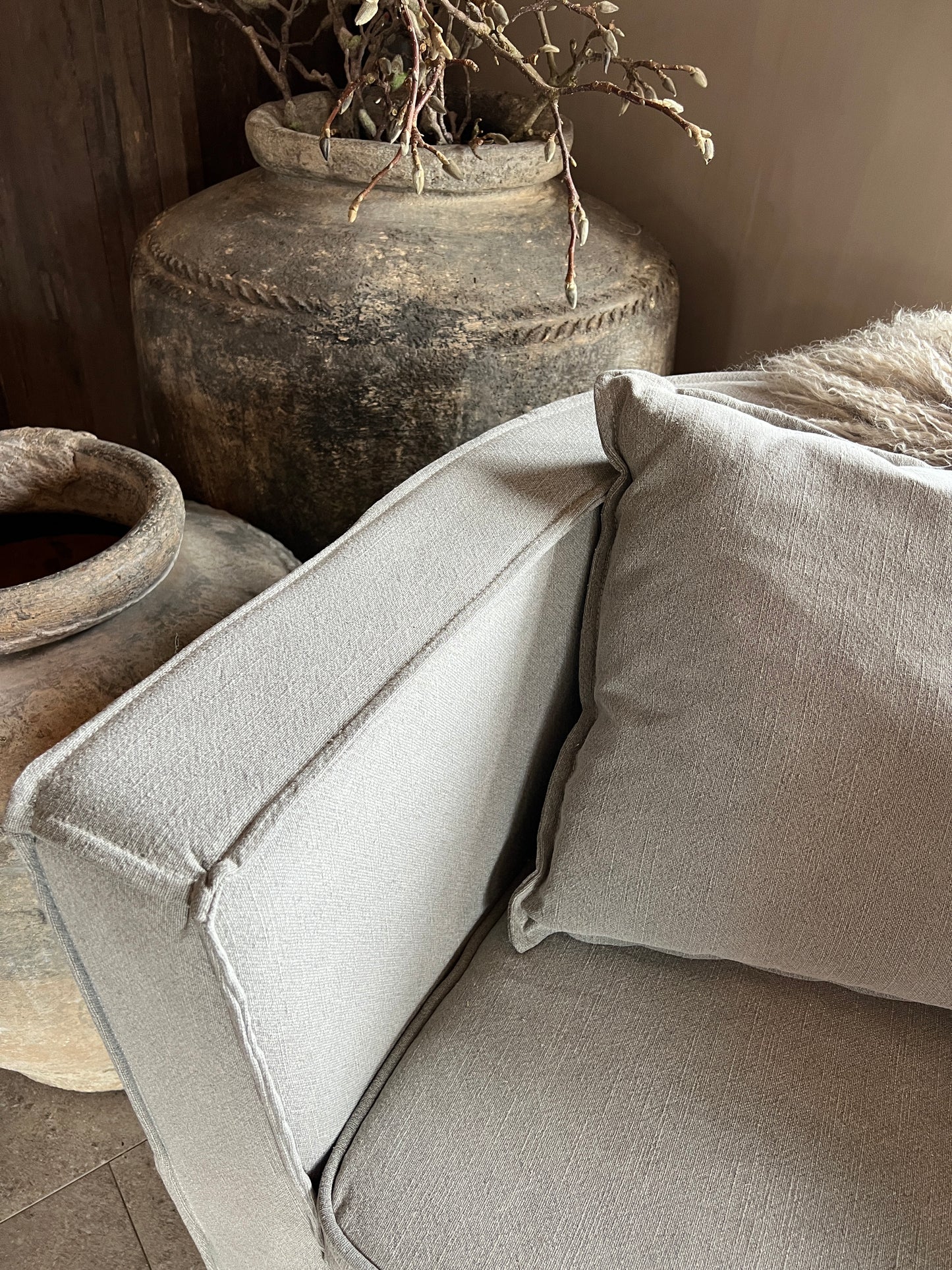 De fauteuil heeft een losse linnen hoes in de kleur Taupe Antraciet en Beige.