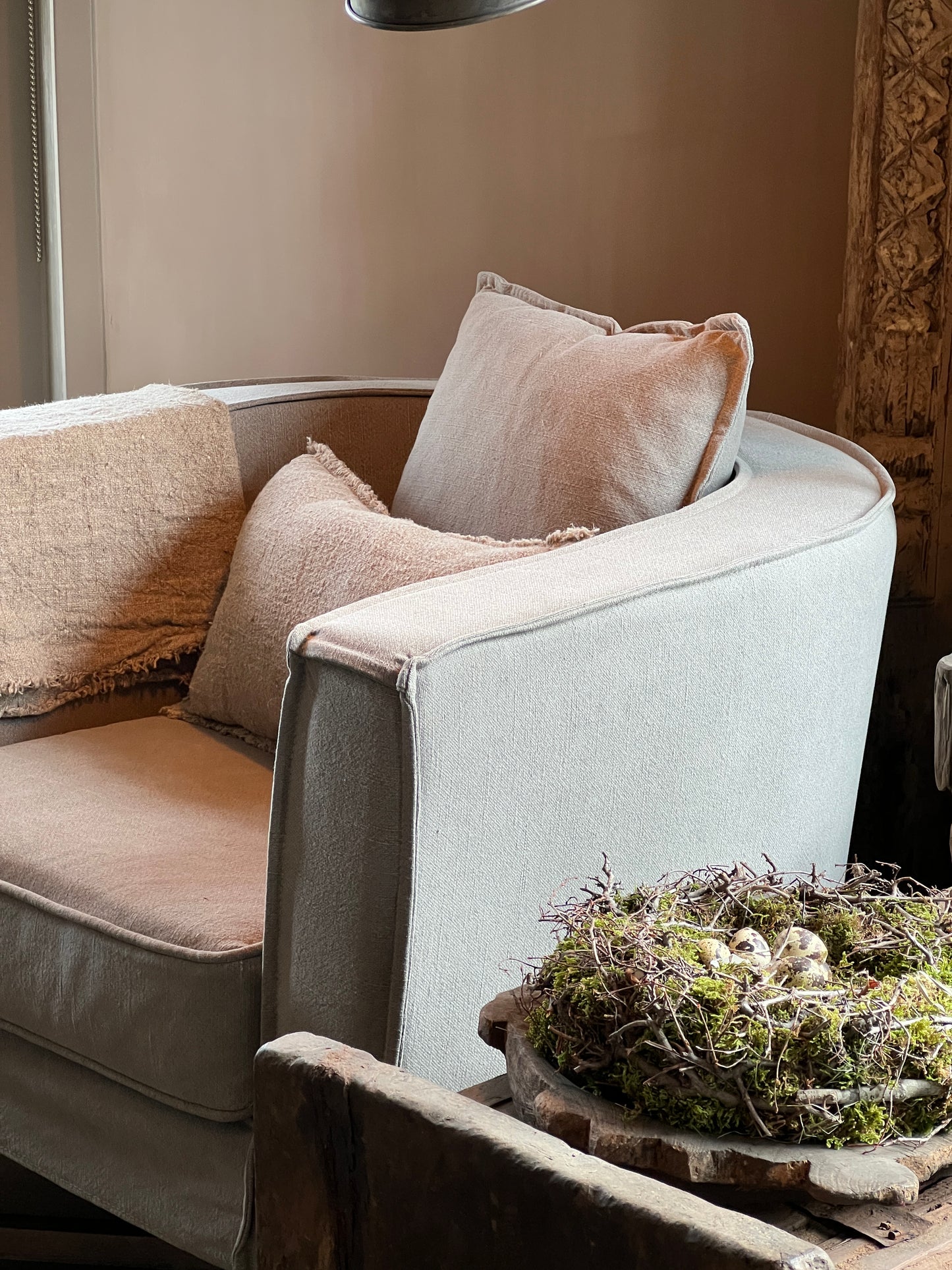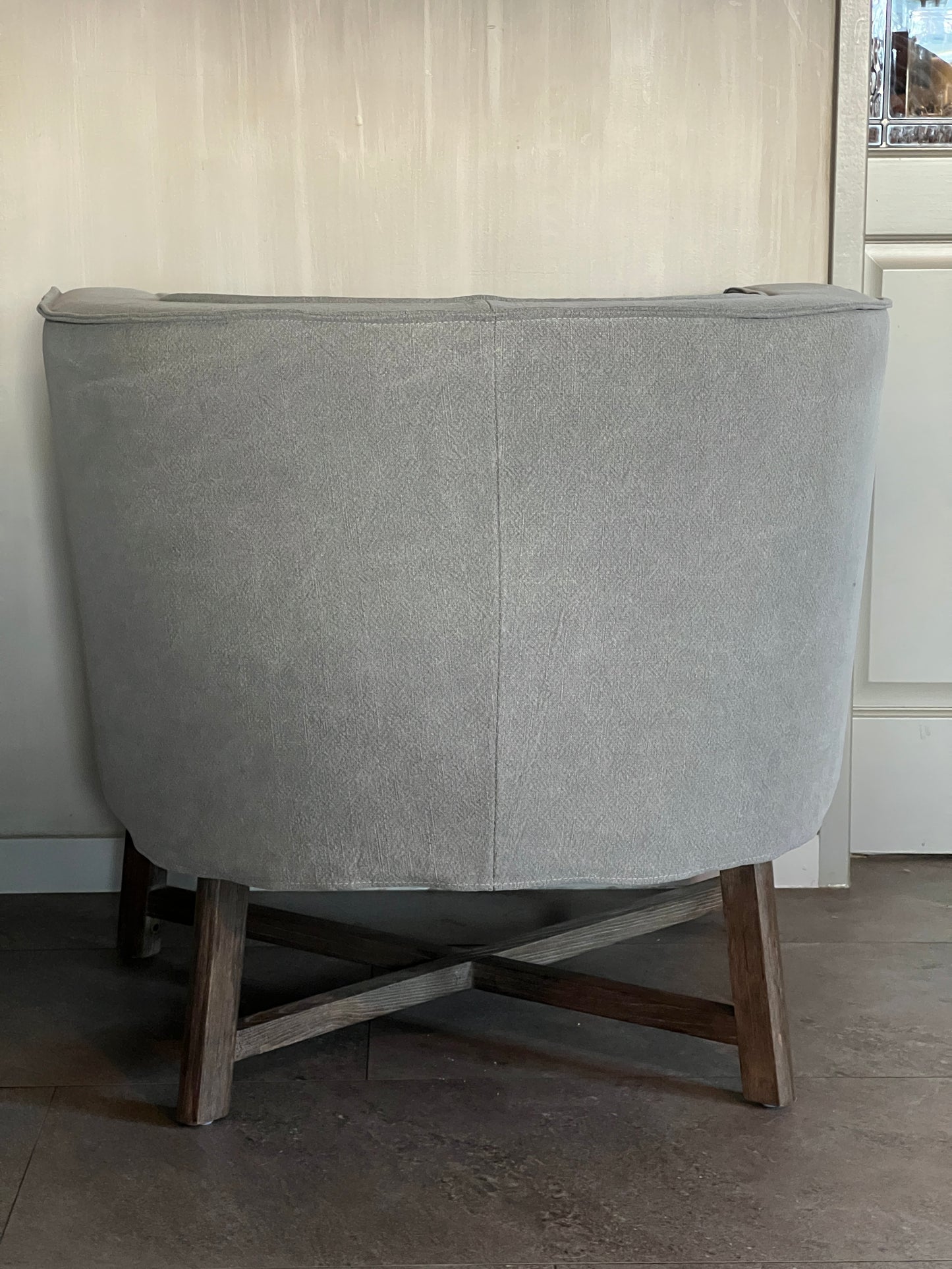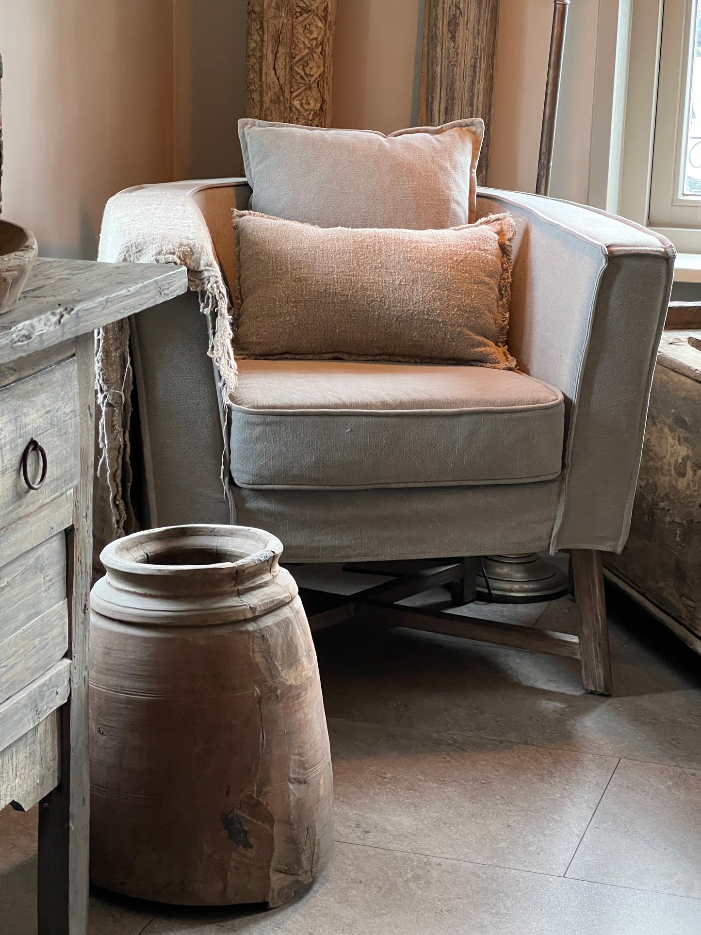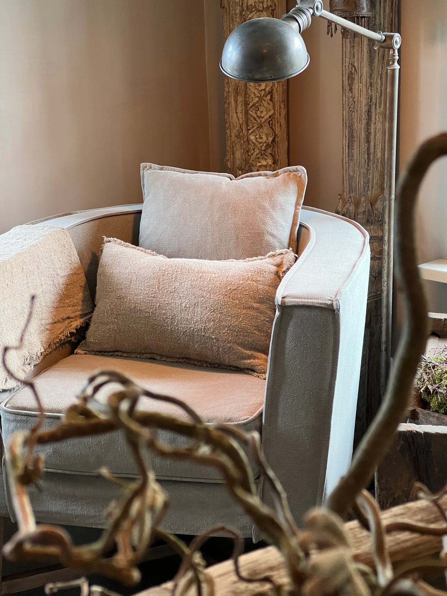 De fauteuil heeft een losse linnen hoes in de kleur Taupe Antraciet en Beige.