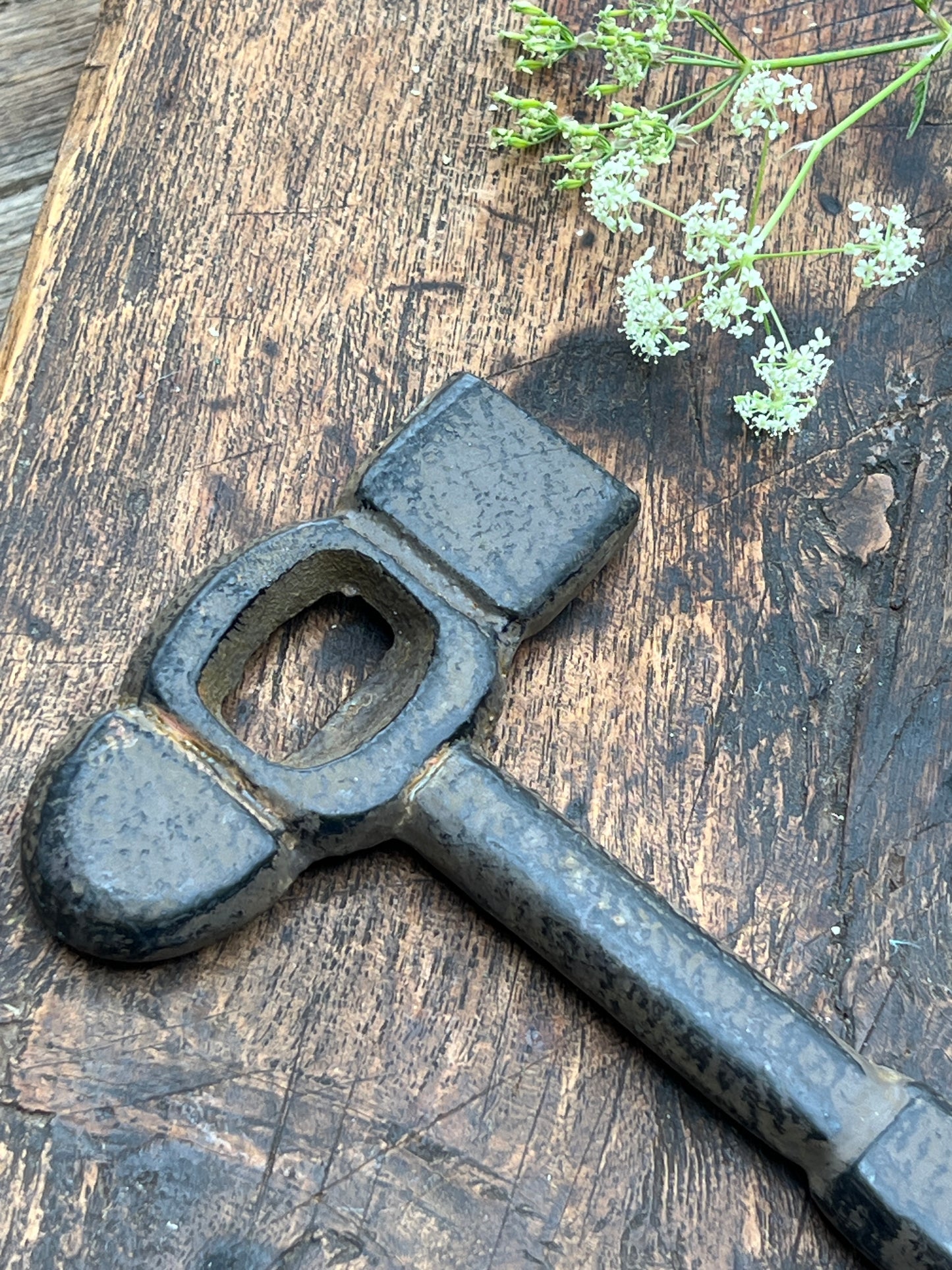 Deze fles opener is gemaakt van smeedijzer in de vorm van een oude hamer.