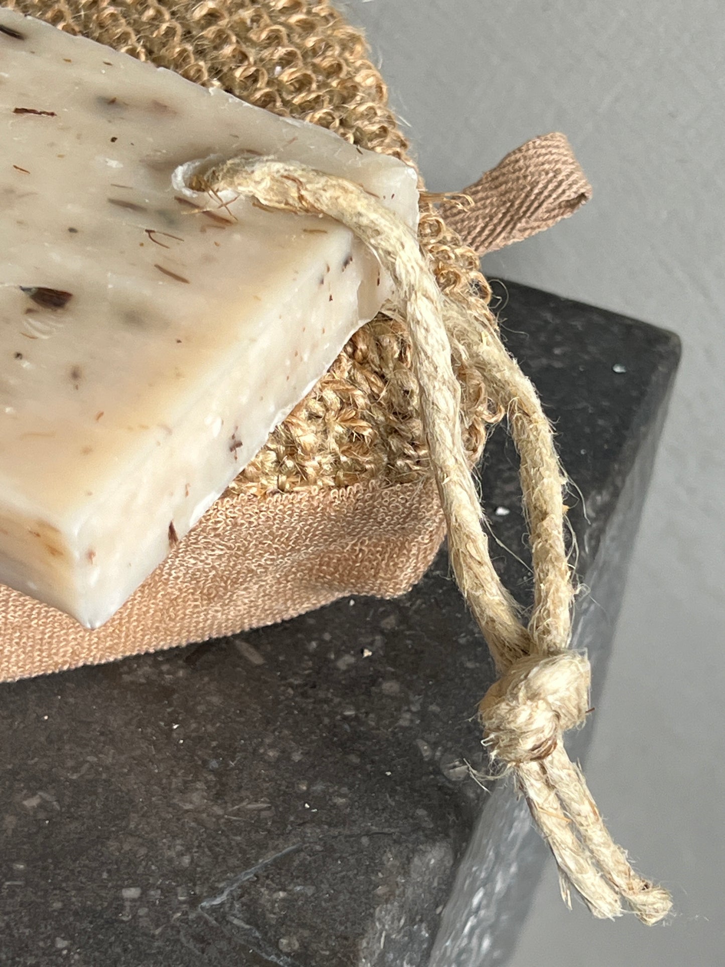 Je kunt de plak zeep liggen of ophangen aan het touw wat er doorheen zit geregen.