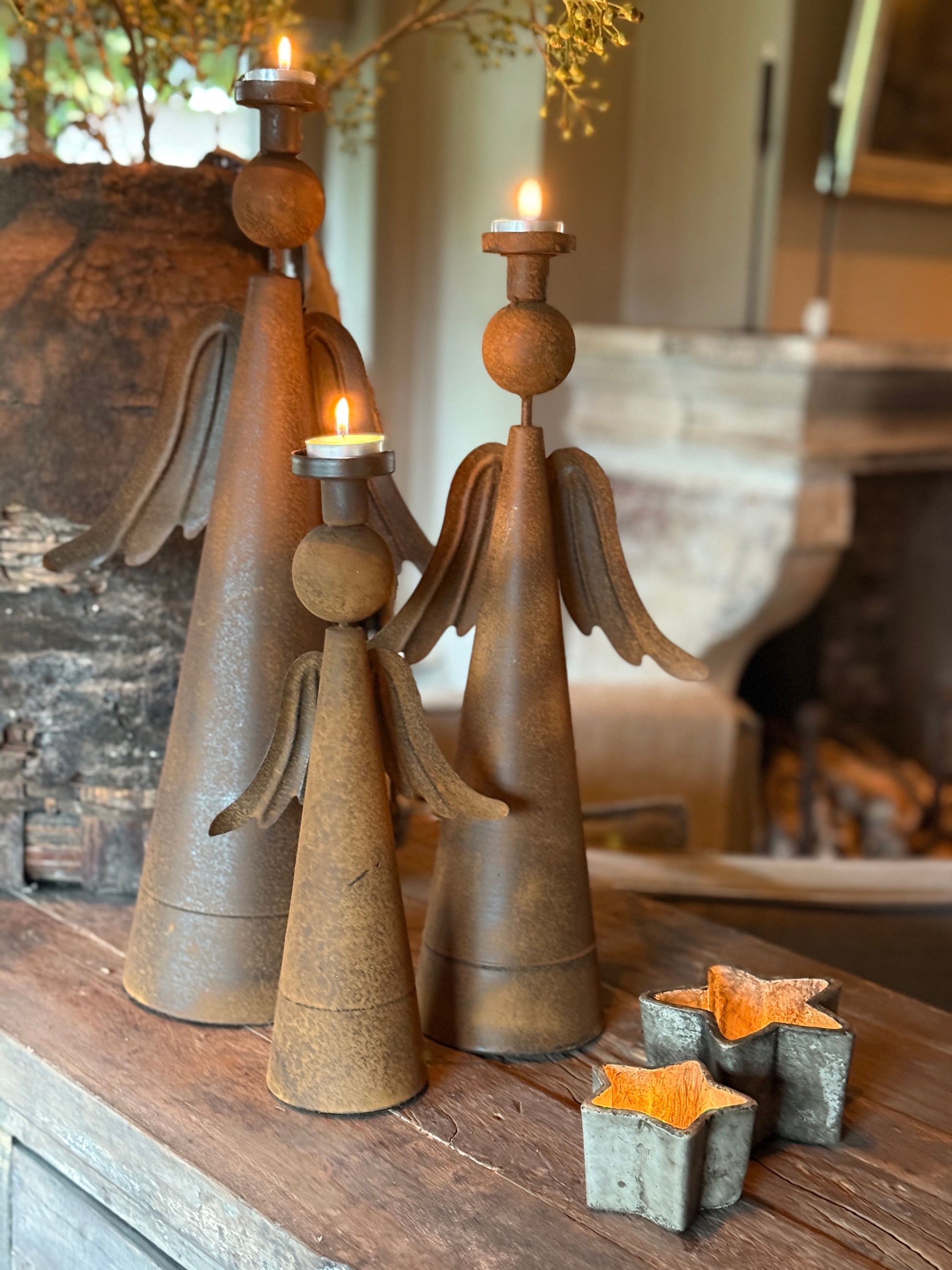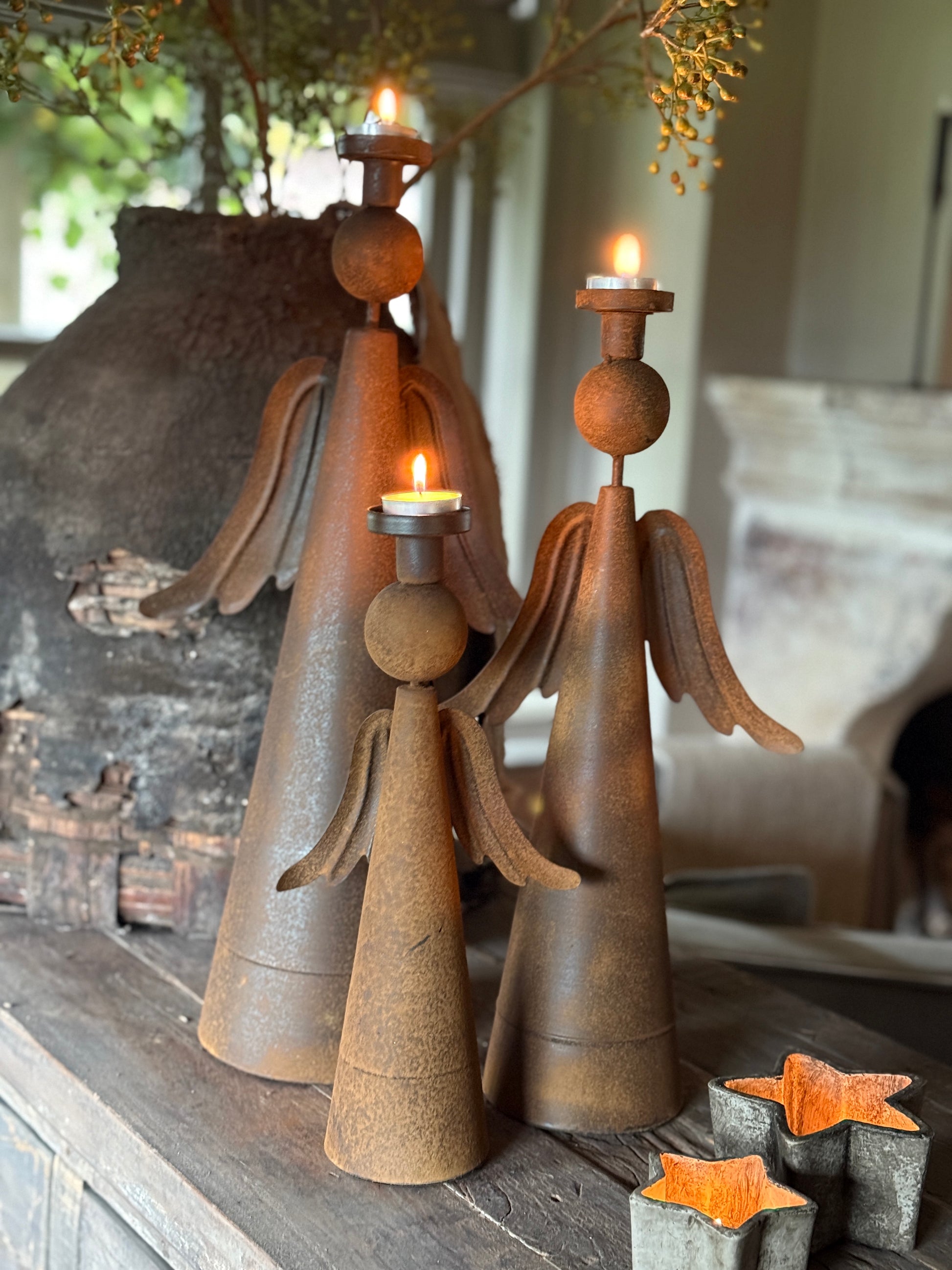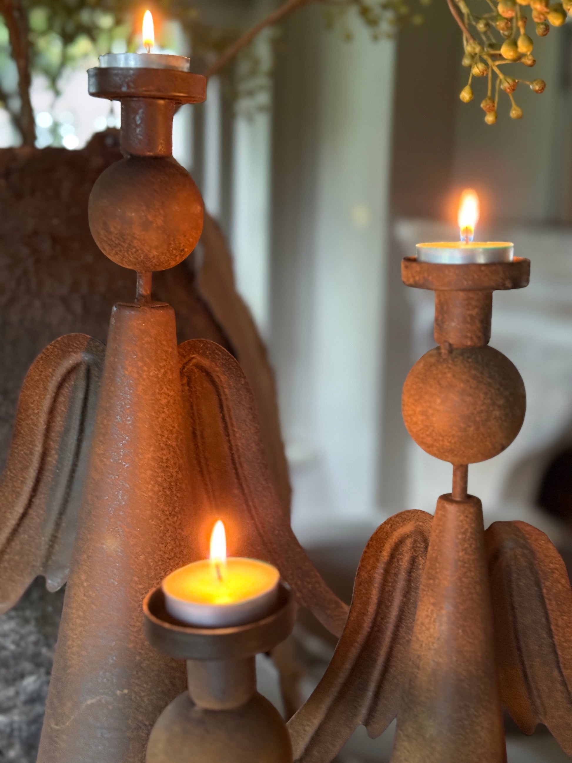 Deze prachtige Engel van roest straalt warmte en sfeer uit en is een echte blikvanger in elk interieur. De Engel is geschikt voor zowel een dinerkaars als een waxinelichtje, waardoor je eenvoudig een gezellige en stijlvolle ambiance creëert.
