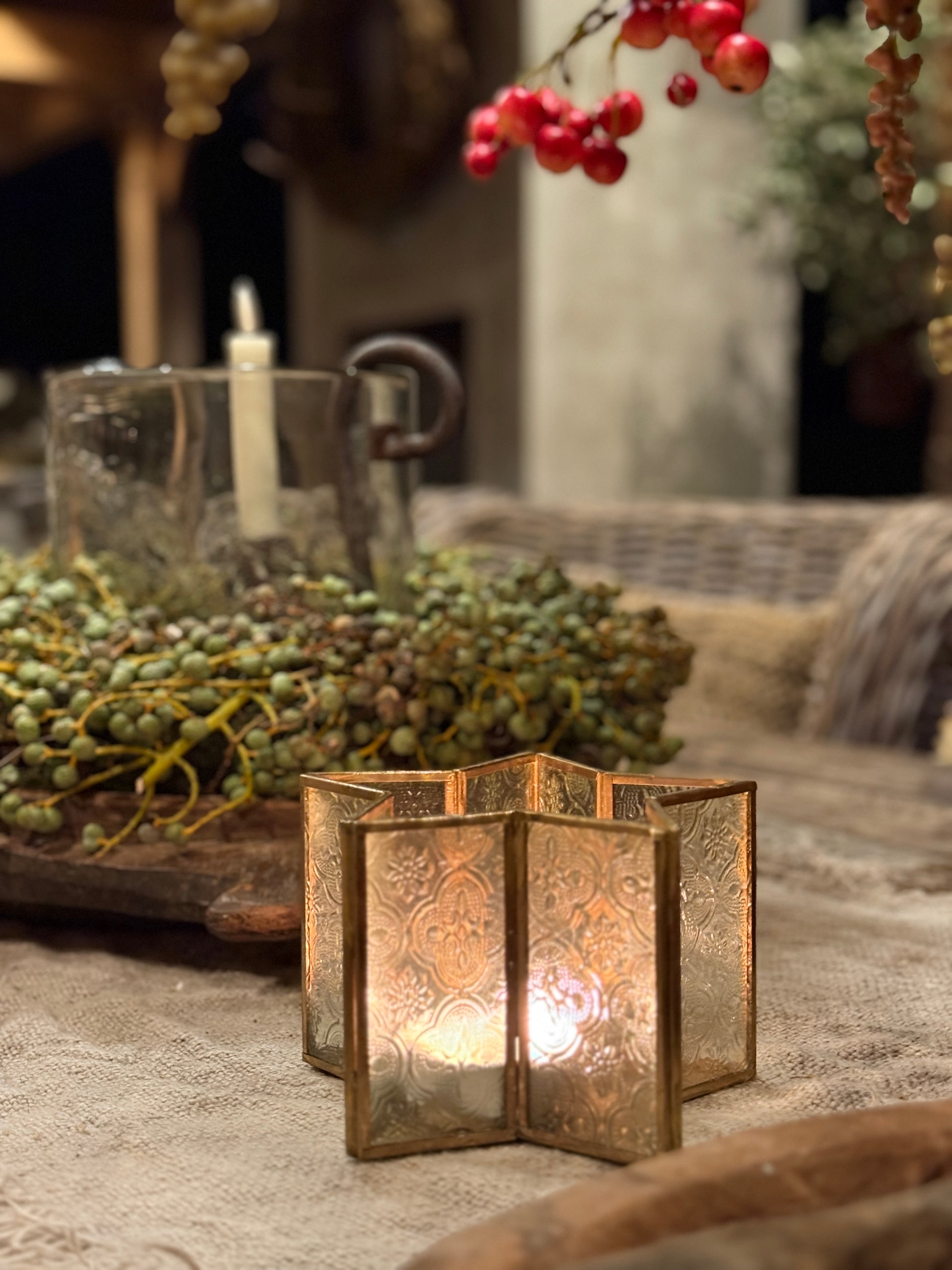 Voeg een vleugje elegantie toe aan je kerstdecoratie met dit schitterende windlicht in de vorm van een ster. Het windlicht is vervaardigd uit bewerkt glas, met een geraamte van messing, en biedt ruimte voor een kaarsje om een warme, sfeervolle gloed te creëren. De stervormige structuur maakt het niet alleen een praktische lichtbron, maar ook een stijlvol statement in je interieur.