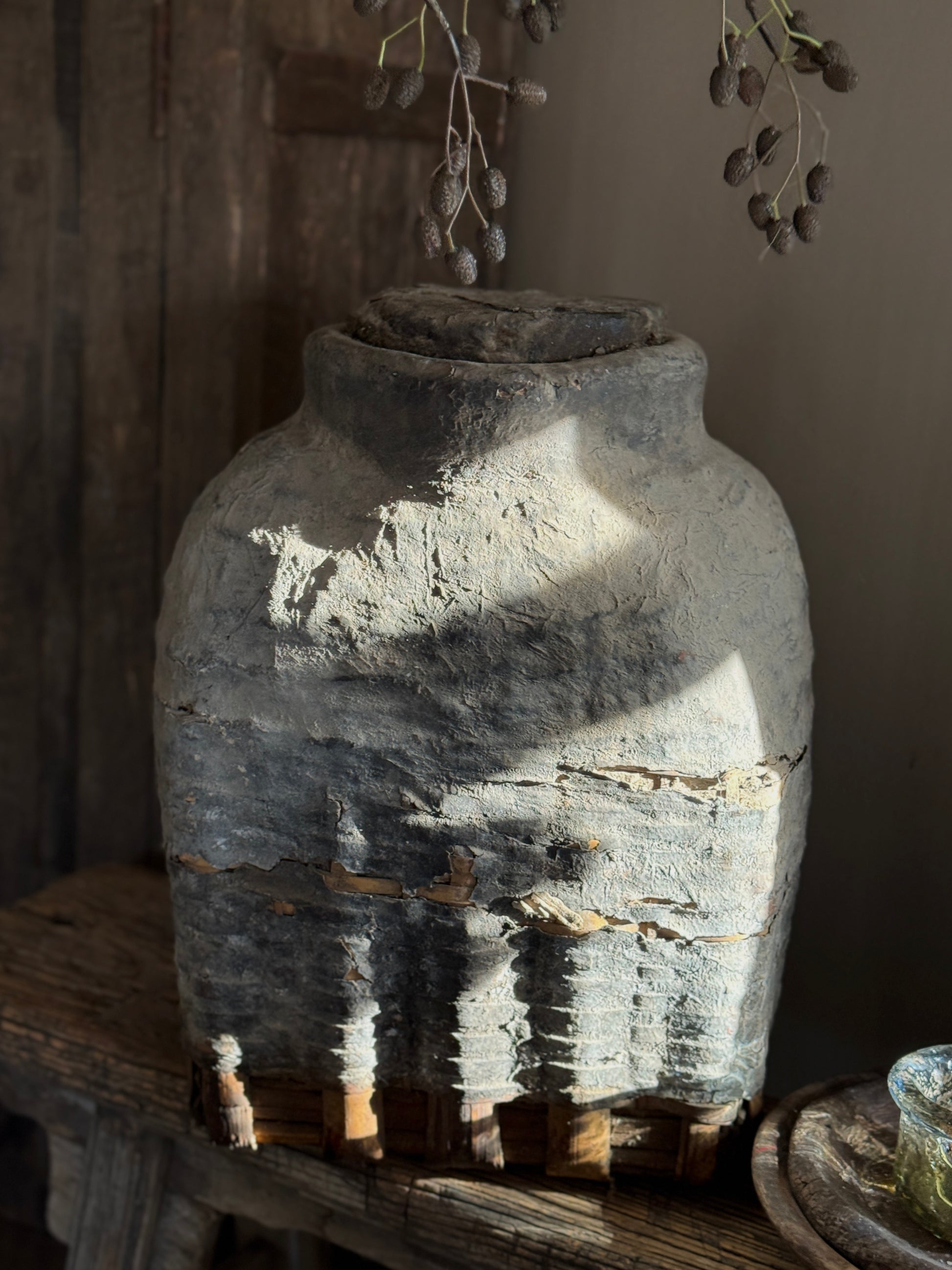Oude leemmand met deksel – authentiek & robuust