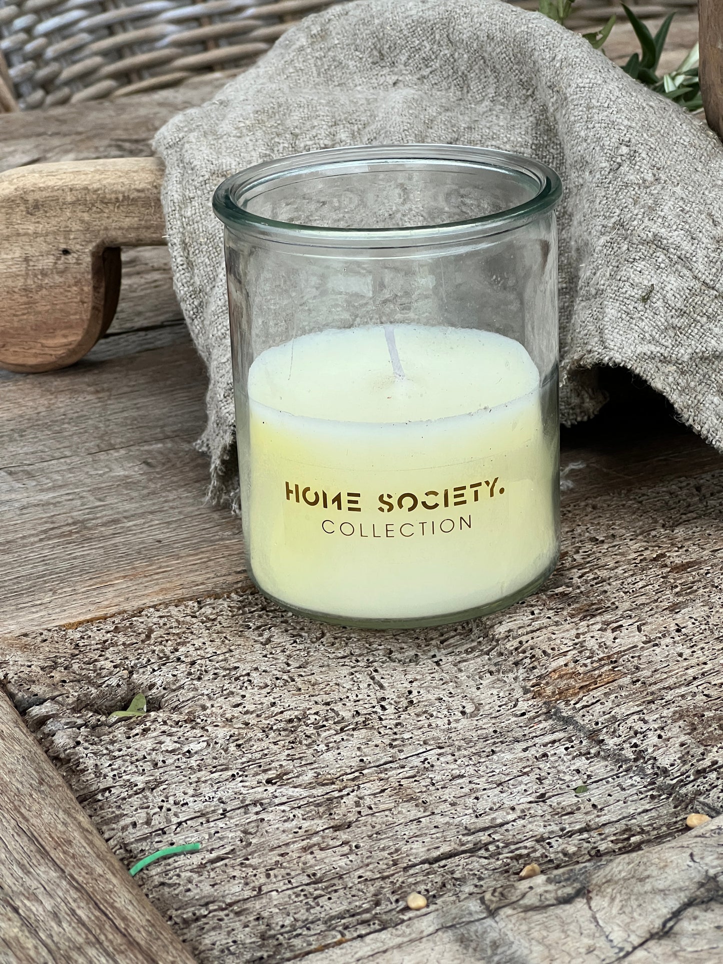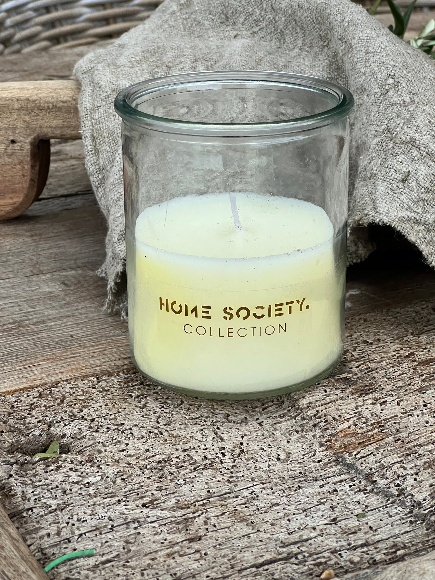 De kaars is in een dik glas gegoten.