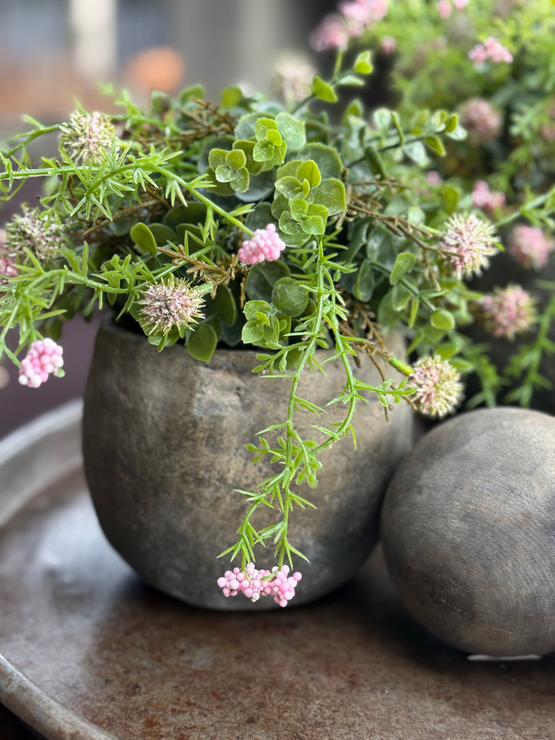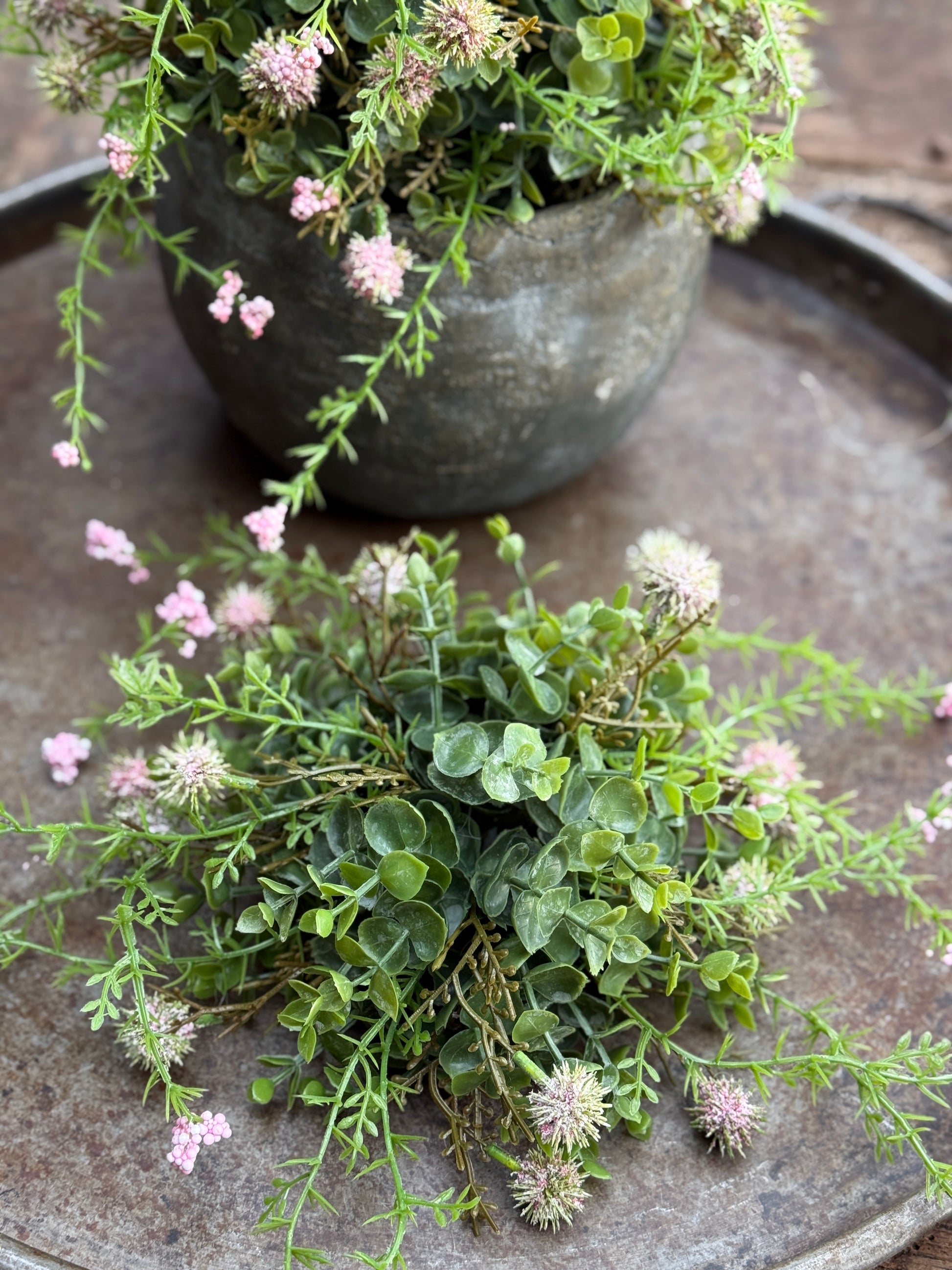 De combinatie van eucalyptusblad met subtiele roze accenten van de echinops zorgt voor een frisse, eigentijdse look die past in zowel moderne als landelijke interieurs.