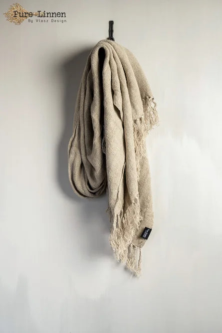Delilah is een Prachtig Naturel kleur. De plaid is gemaakt van 100% handgeweven linnen. De plaid is wat vaster geweven en de franjes op de korte zijde zijn met elkaar verstrengeld. Door de weving is Delilah een plaid van een zwaardere kwaliteit.