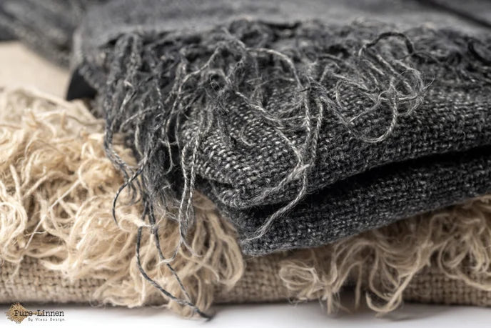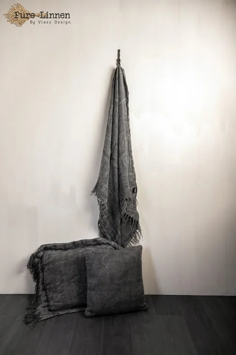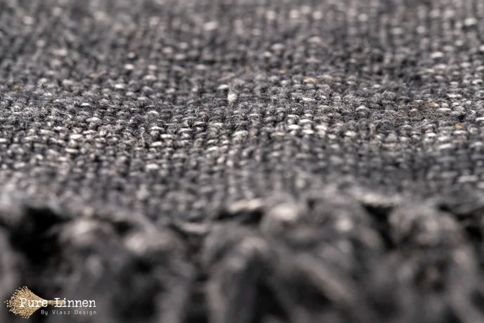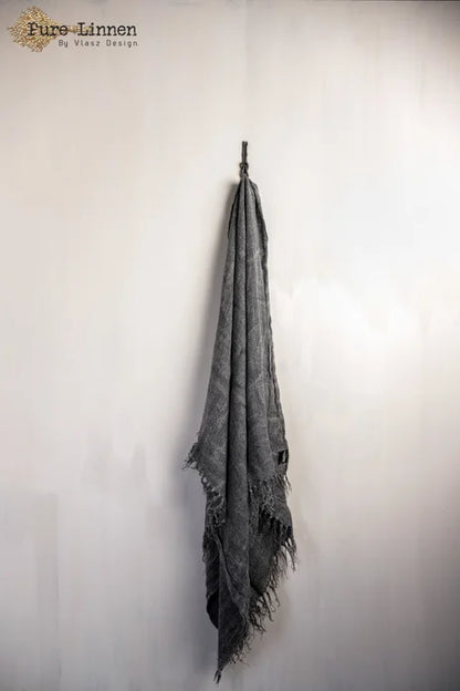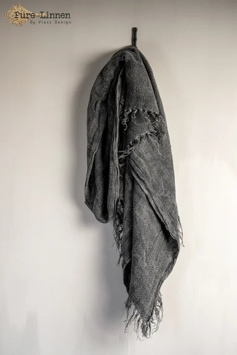 Lydia is een Prachtig donkergrijs d.m.v stonewash verkregen kleur De plaid is gemaakt van 100% handgeweven linnen. De plaid is wat vaster geweven en de franjes op de korte zijde zijn met elkaar verstrengeld. Door de weving is de Lydia een plaid van een zwaardere kwaliteit.