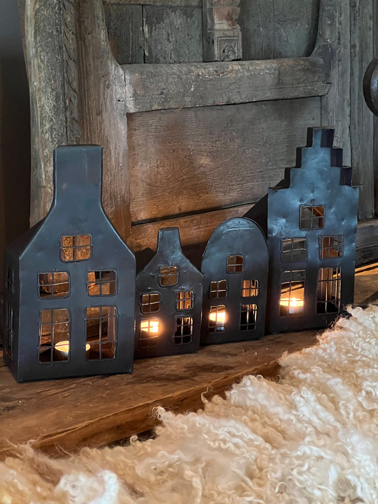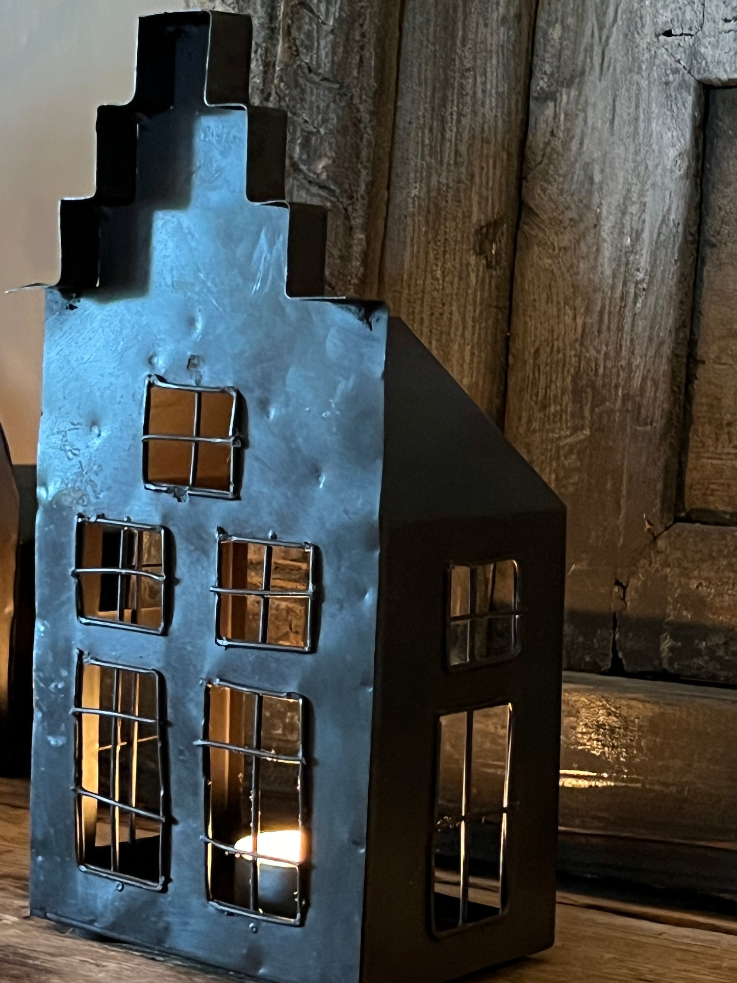 Dit donker metalen gevel huis is aan de achterzijde open zodat er een waxinelichtje in geplaatst kan worden.