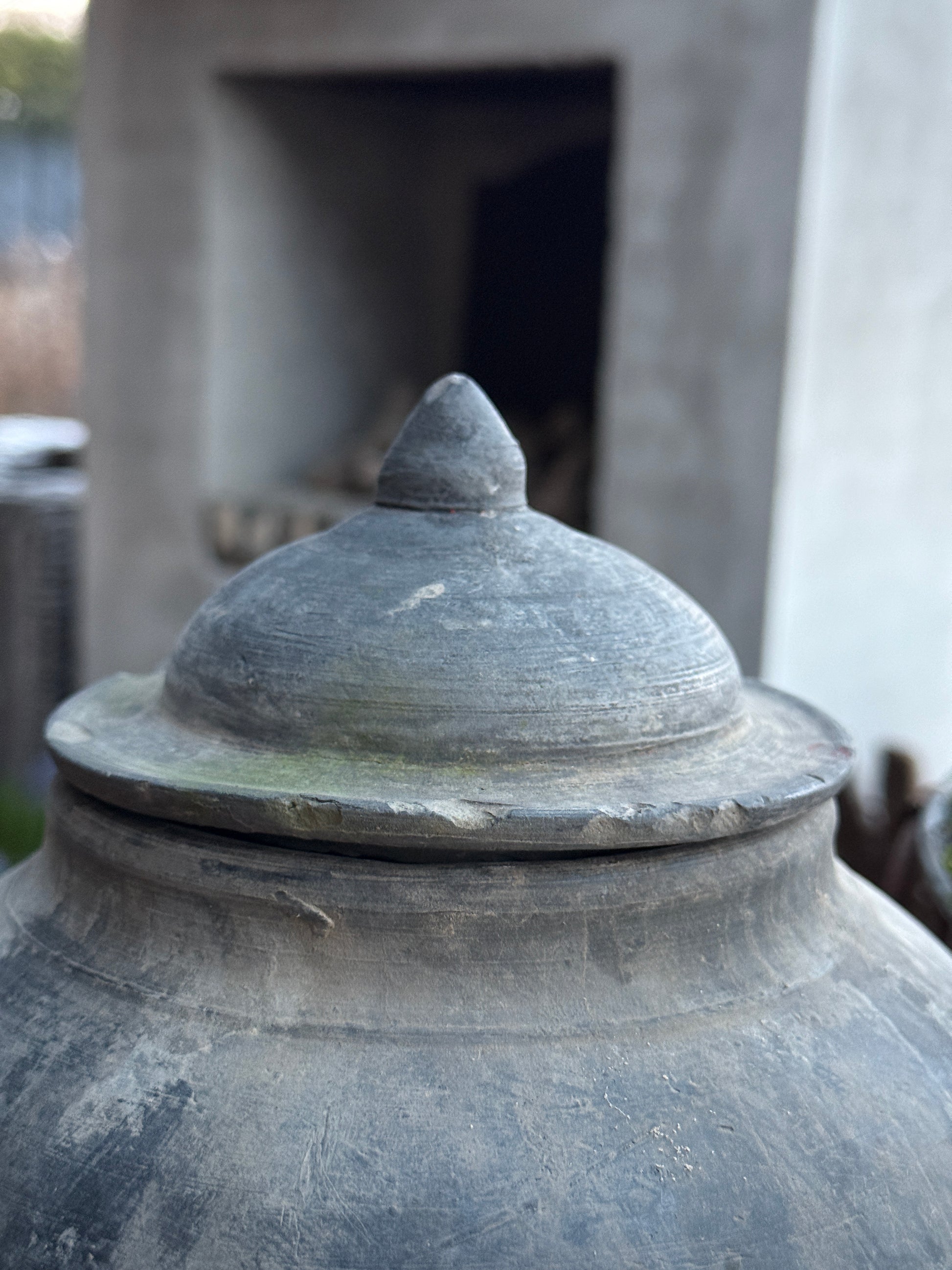 Dit oude kruikje met deksel, afkomstig uit India, is een karaktervol decoratiestuk dat perfect past binnen een landelijk interieur. Door de doorleefde uitstraling en het authentieke materiaal is elk kruikje uniek.