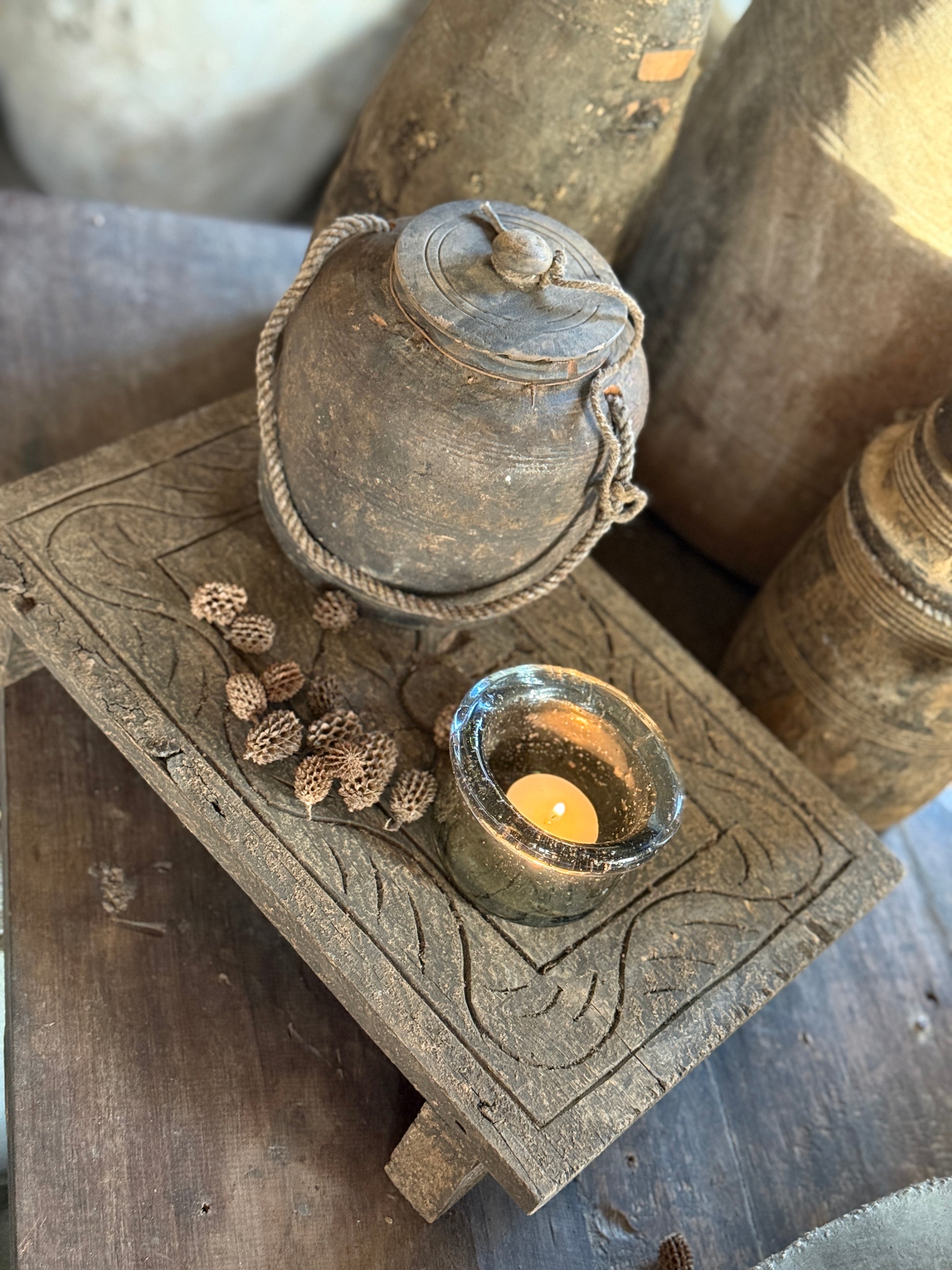 De combinatie van het doorleefde hout en het handgesneden detail zorgt voor een warme, authentieke uitstraling. Elke plank is uniek en draagt sporen van zijn verleden, wat bijdraagt aan zijn charme.