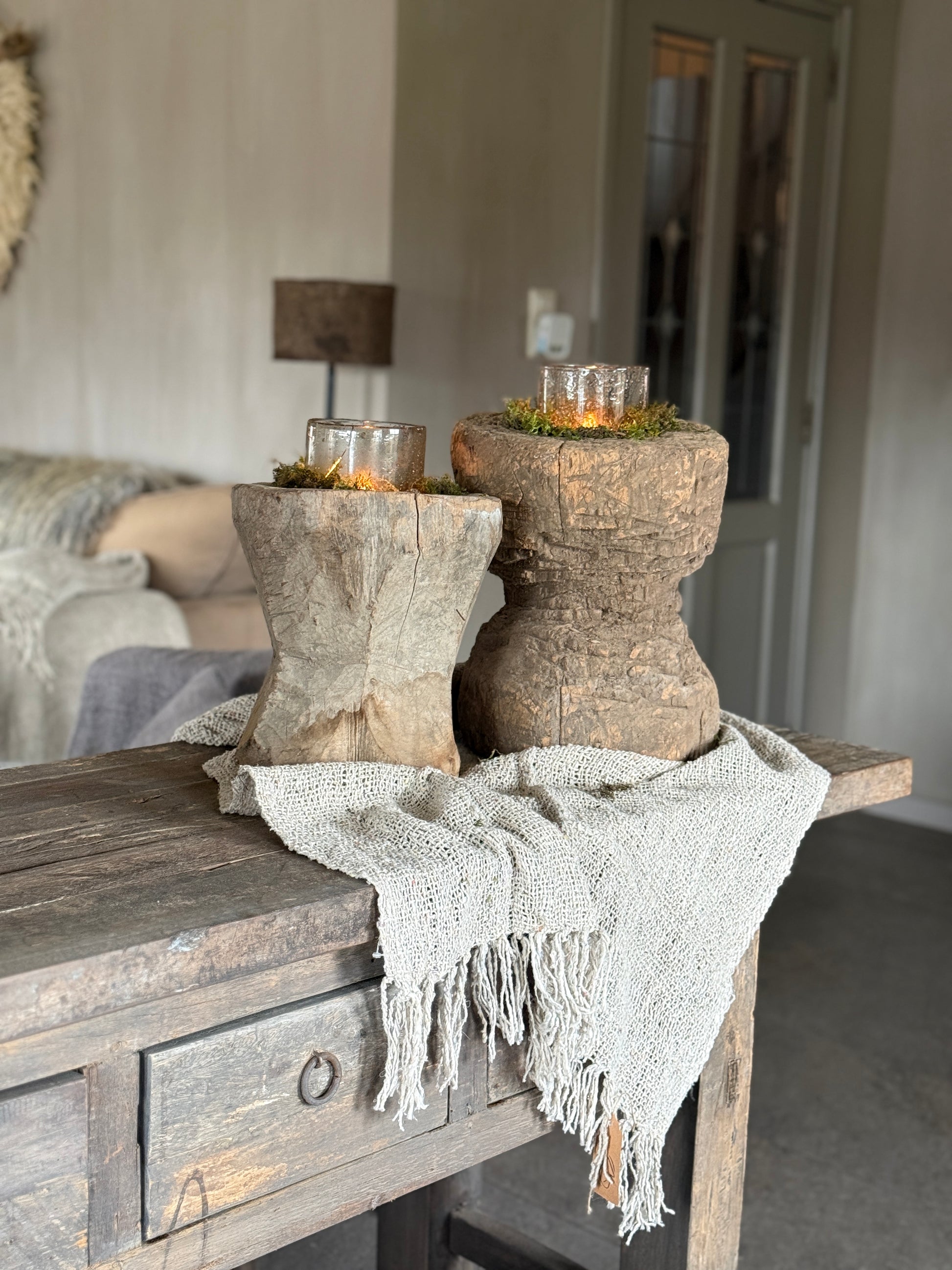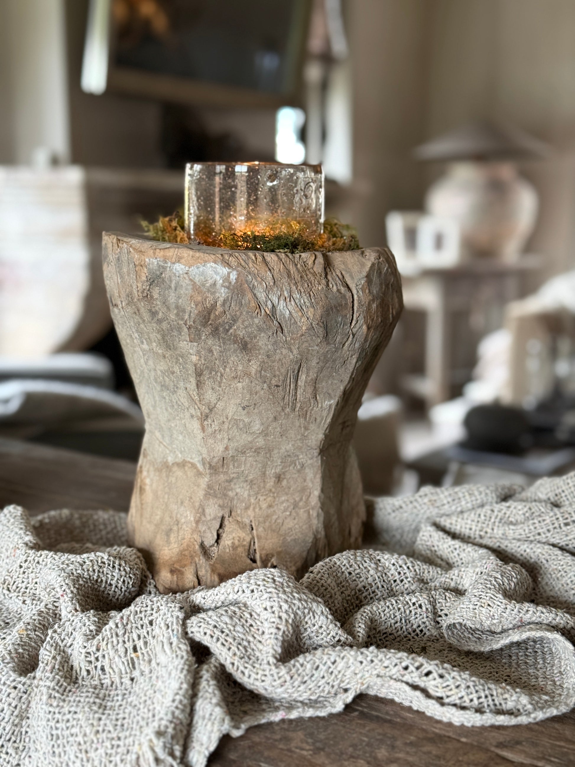 Deze oude houten vijzel exclusief windlicht een uniek en authentiek stuk uit India, met een prachtig doorleefd karakter. Gemaakt van massief hout met zichtbare sporen van gebruik en tijd, wat hem een stoere en landelijke uitstraling geeft.