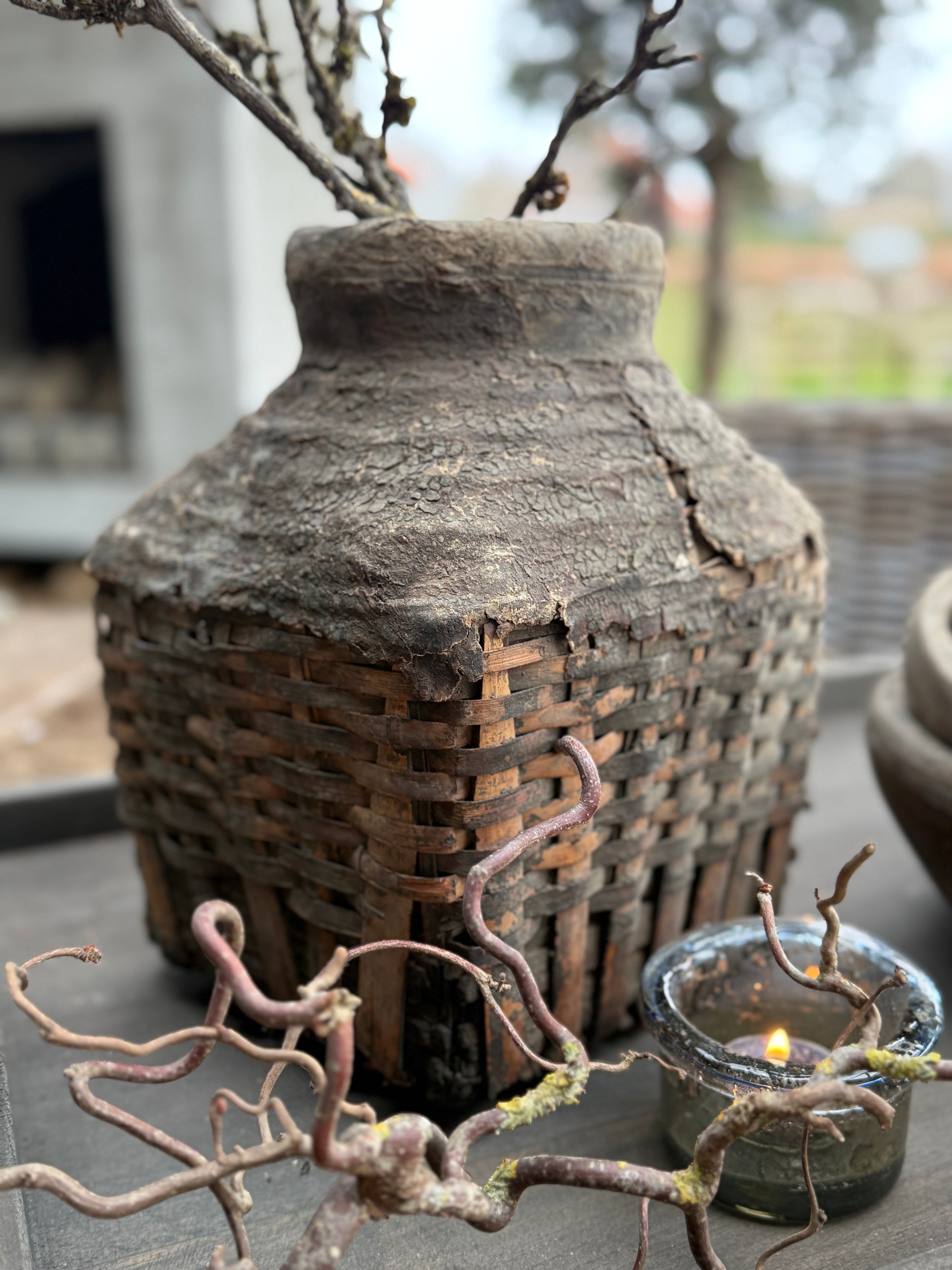 Deze oude leemmand is een bijzonder en authentiek object afkomstig uit India. Oorspronkelijk werd dit type mand gebruikt voor het opslaan en vervoeren van graan, meel en andere grondstoffen. Door jarenlang intensief gebruik heeft elke mand een unieke, doorleefde uitstraling met zichtbare gebruikerssporen, wat ieder exemplaar volledig eigen karakter geeft.
