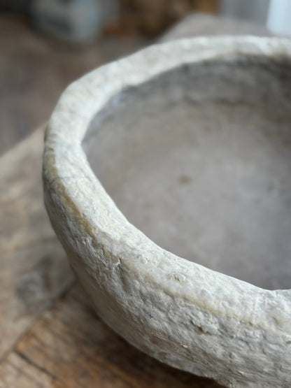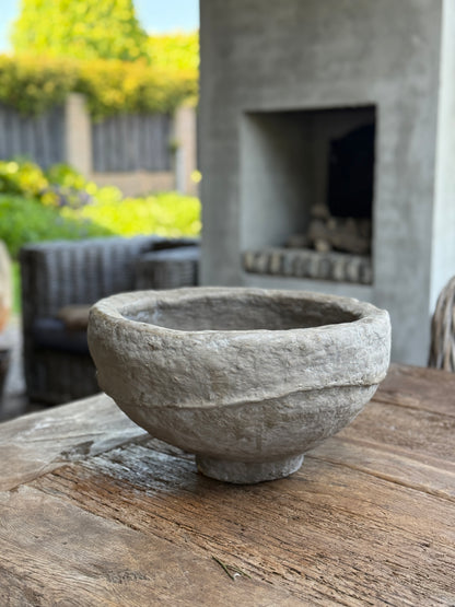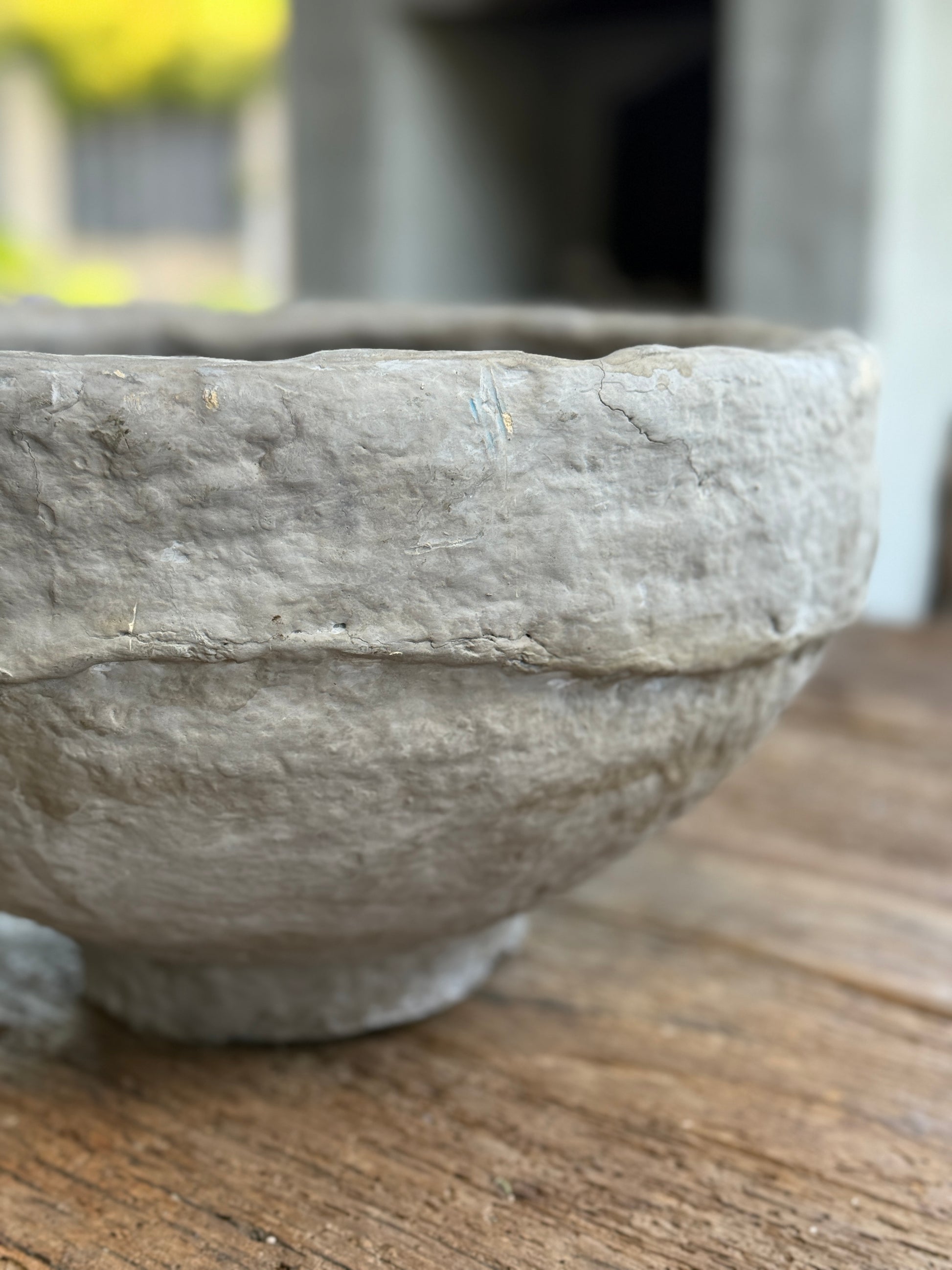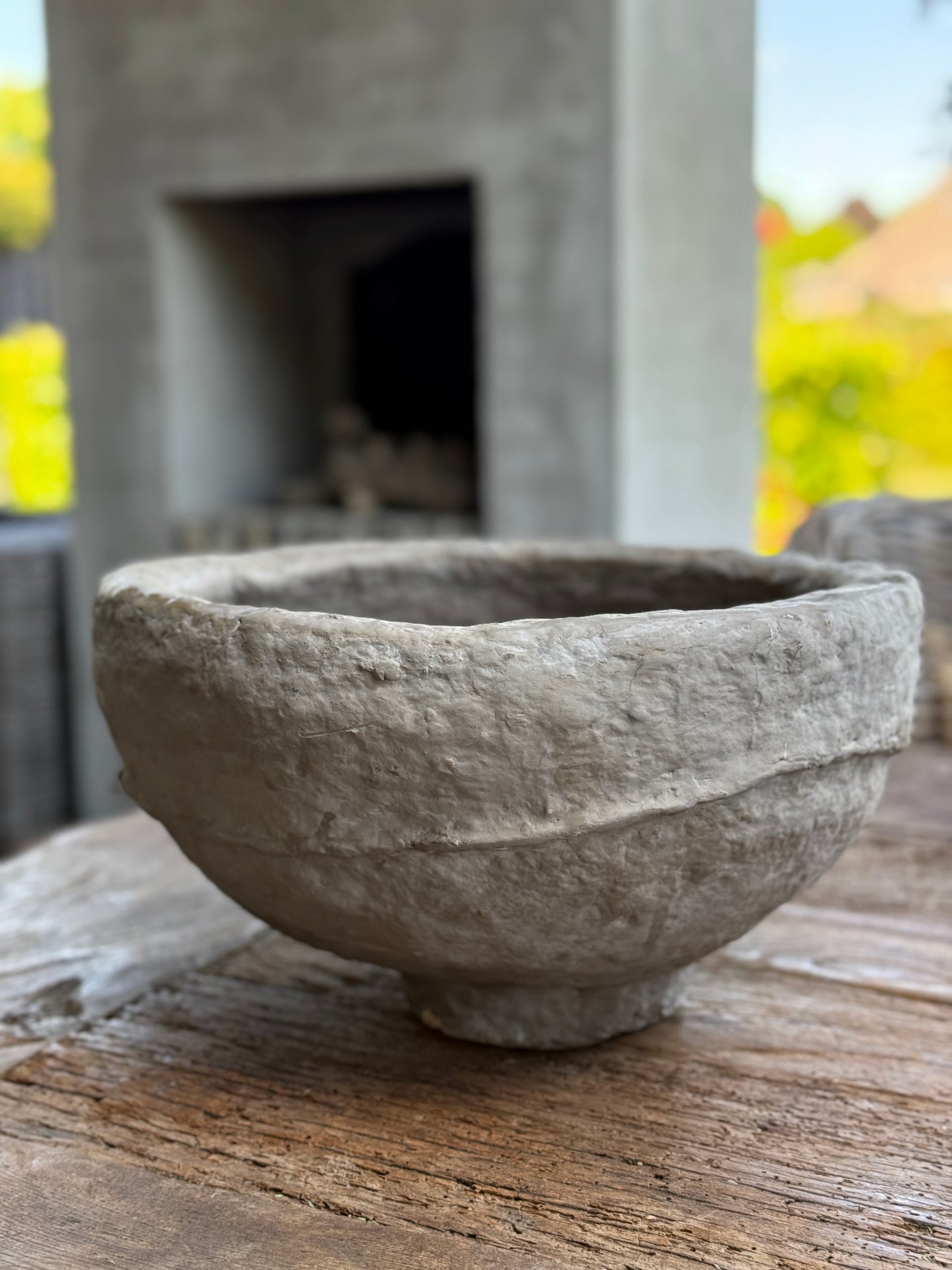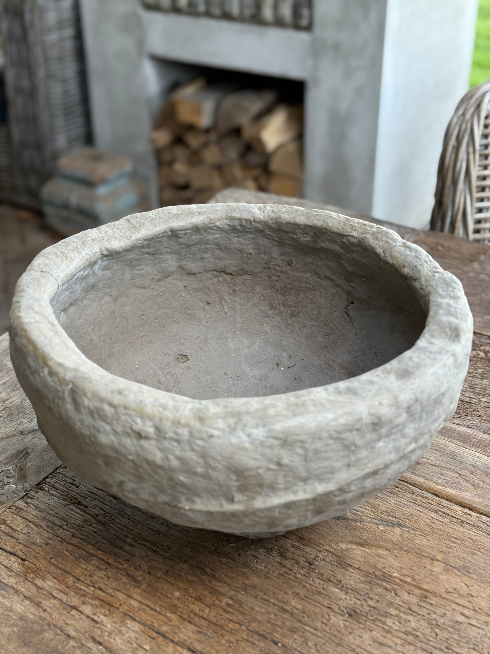 Deze karaktervolle schaal van papier-maché is een echte blikvanger in elk landelijk interieur. De robuuste vormgeving en zachte grijstint zorgen voor een natuurlijke, doorleefde uitstraling die perfect past bij een warme, rustieke woonstijl.
