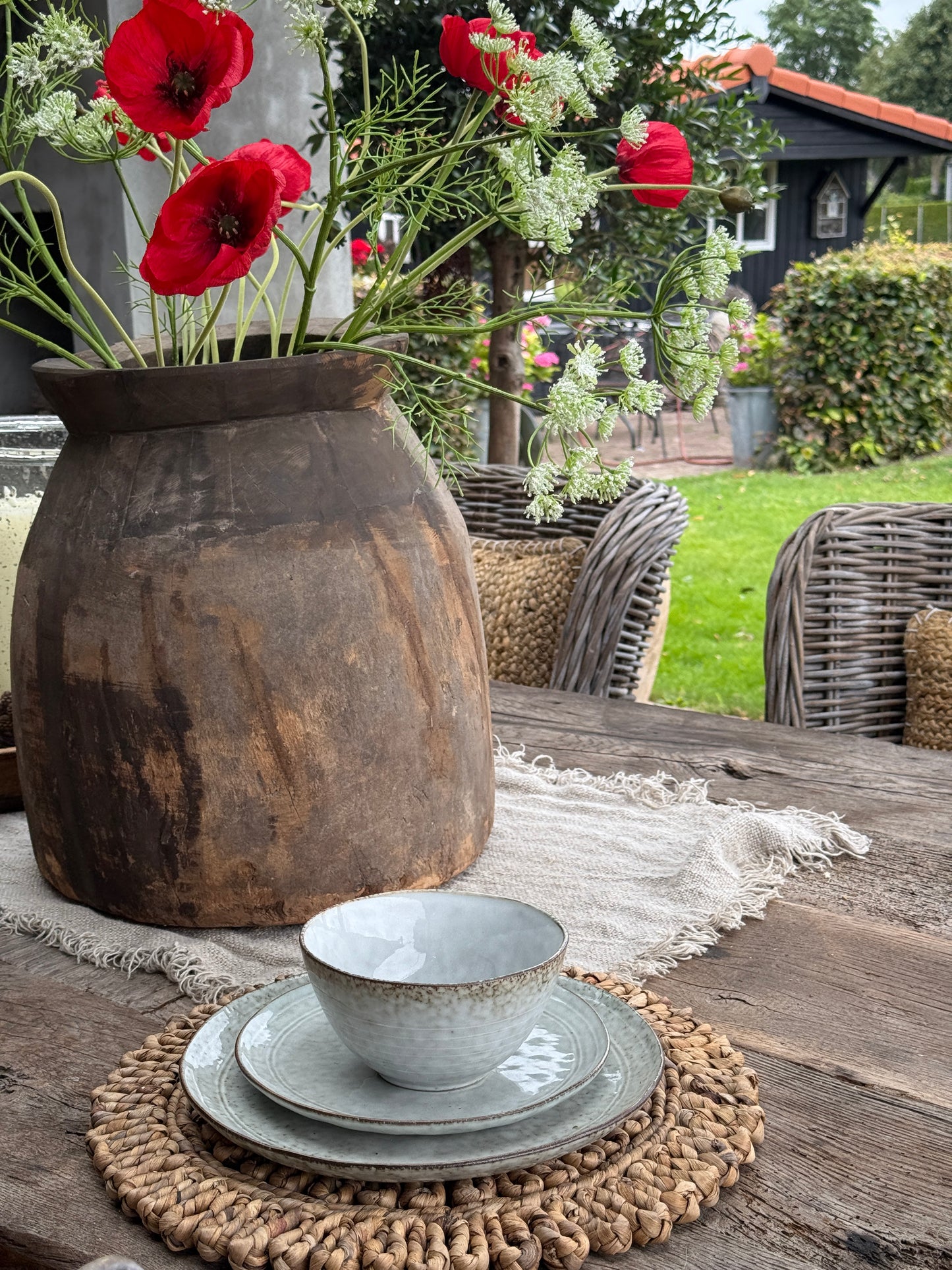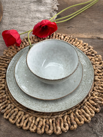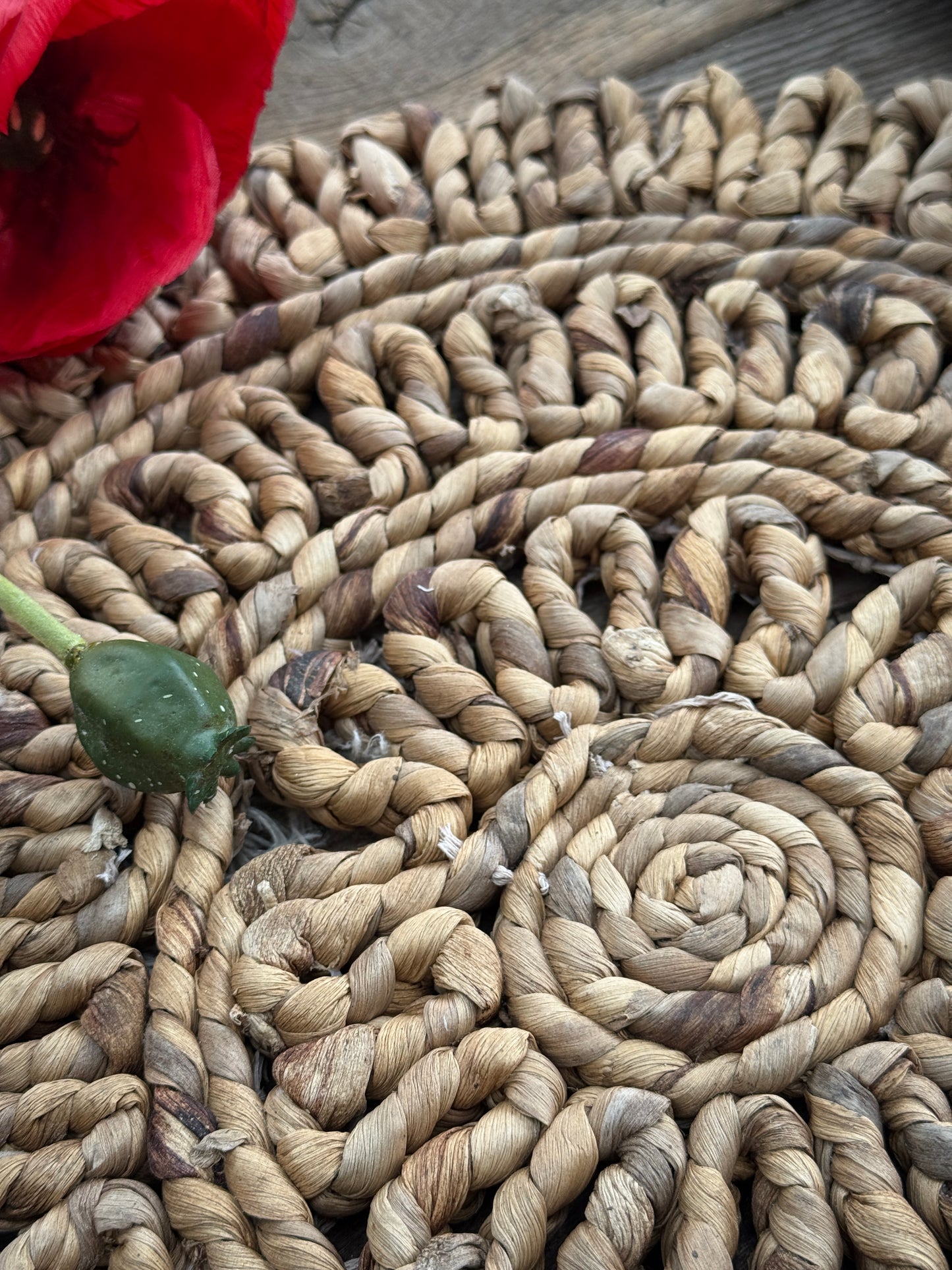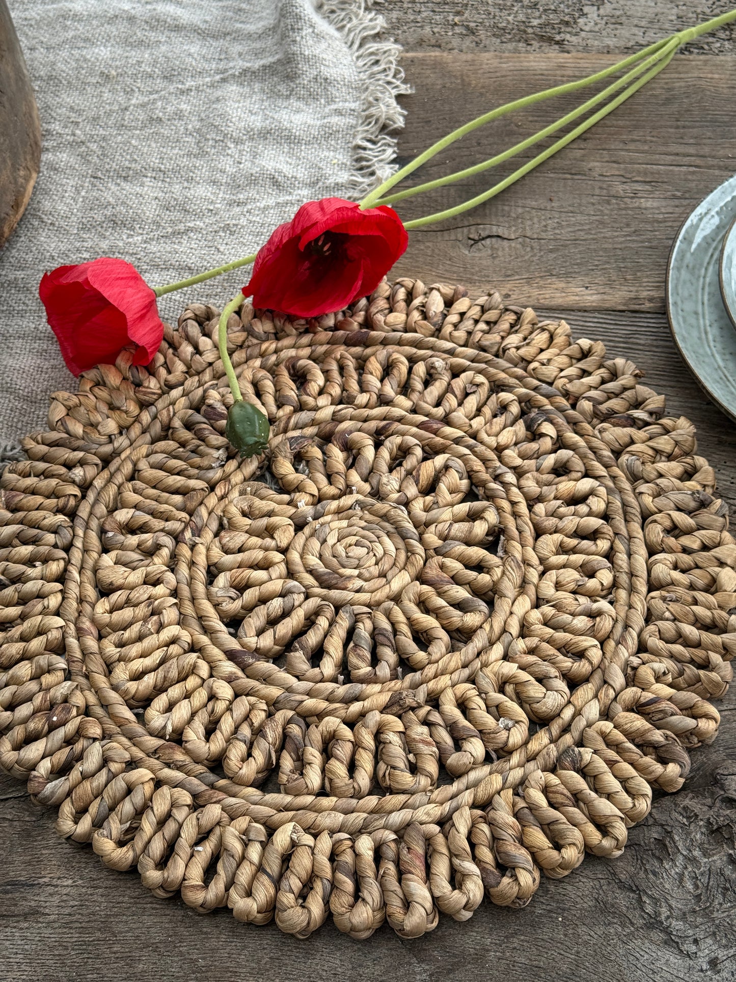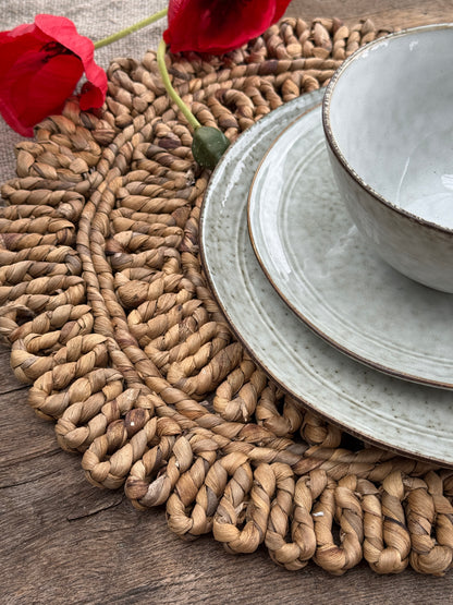 Deze handgemaakte placemat van gevlochten bananenblad brengt warmte en karakter op tafel. Dankzij de natuurlijke kleur en bloemvorm voegt hij direct een landelijke, organische sfeer toe aan je eettafel.