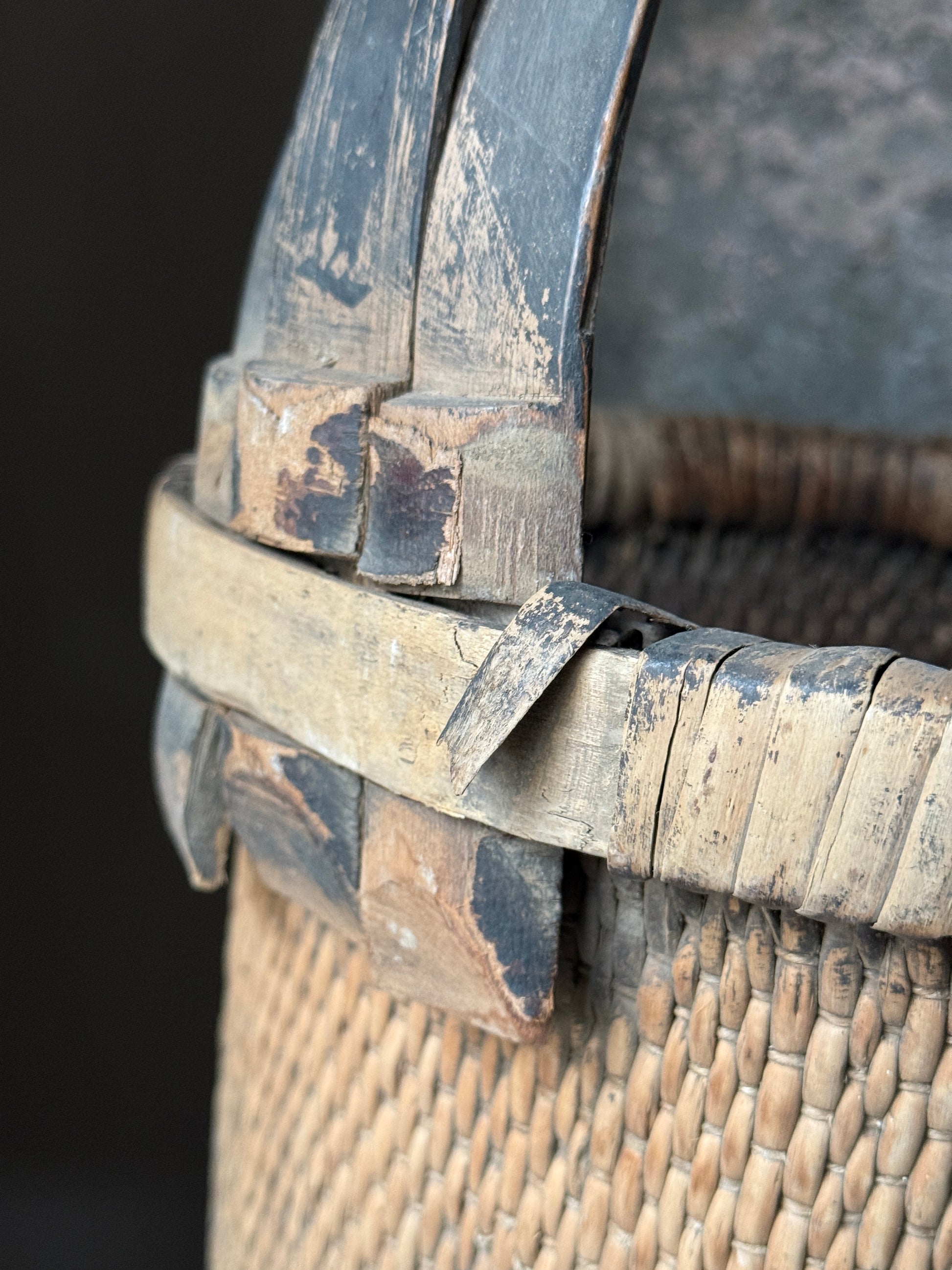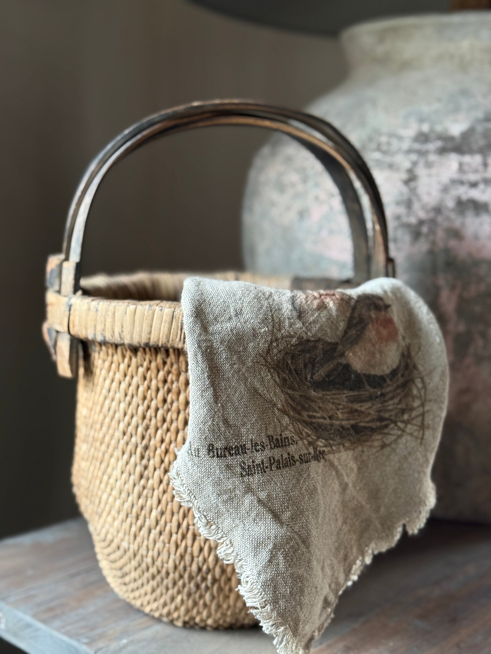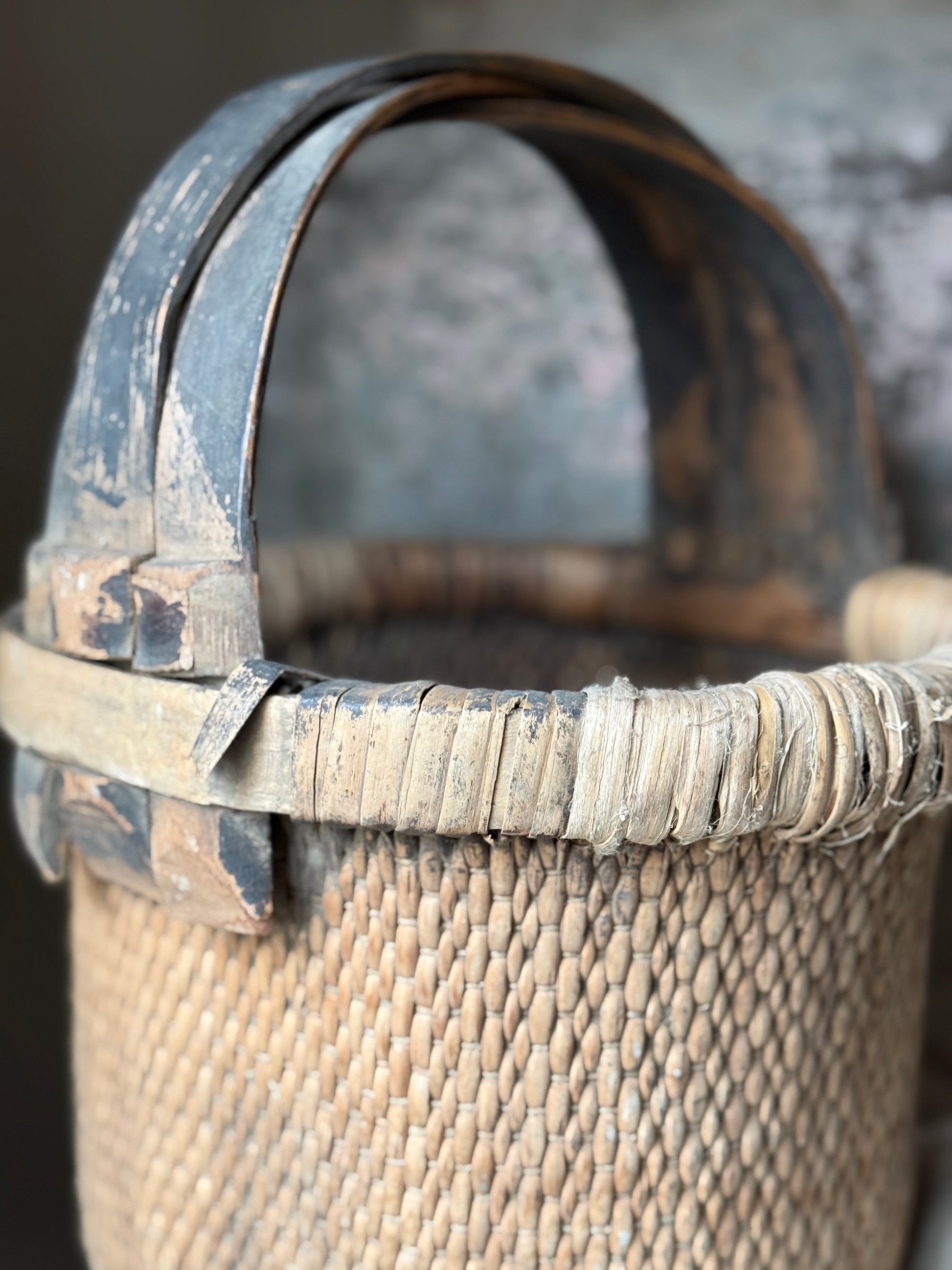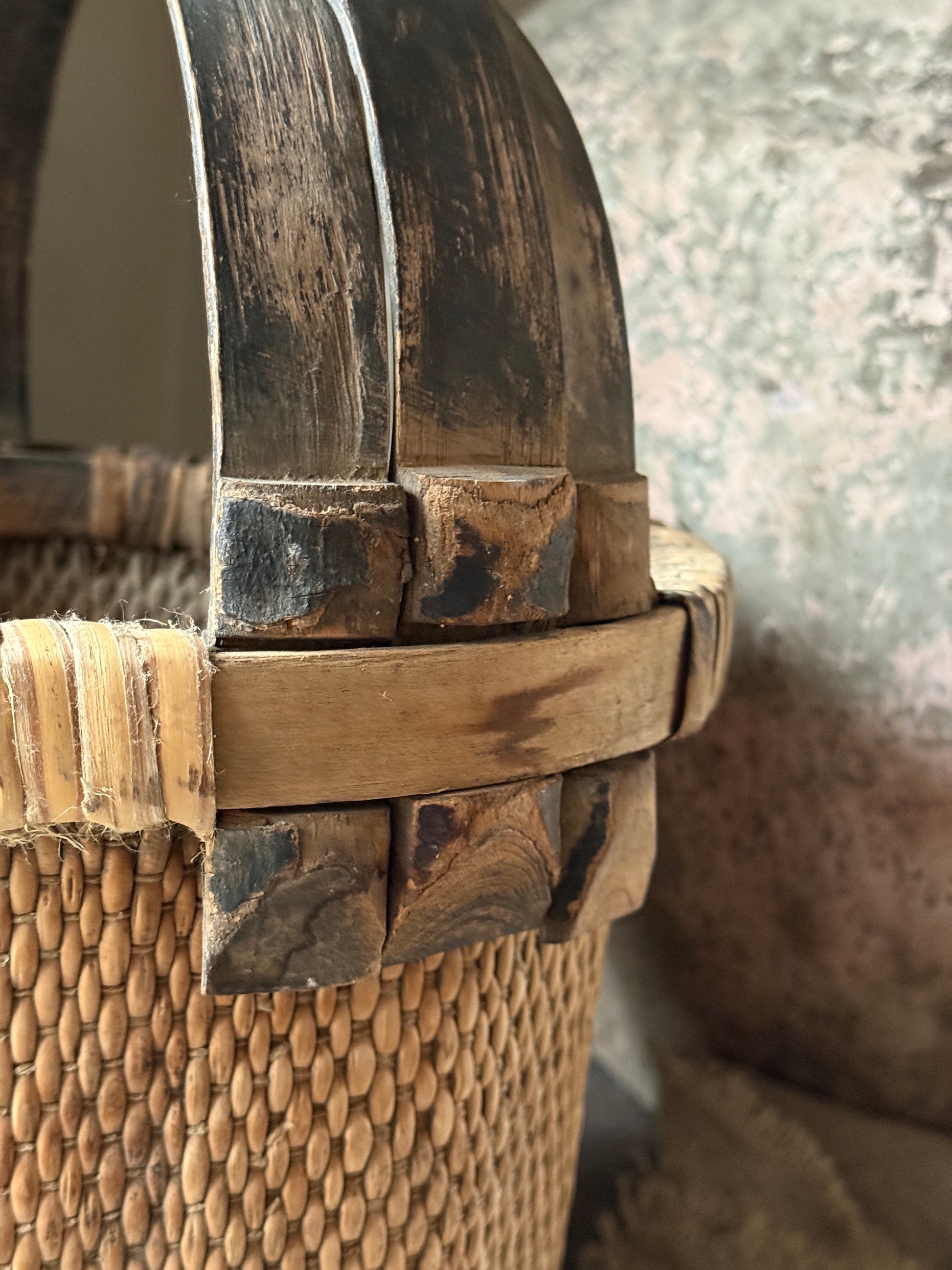 Ontdek de charme van deze oude Chinese rieten mini mand met hengsel – een authentiek stuk met karakter en geschiedenis Oorspronkelijk afkomstig uit China werd deze mand met de hand gevlochten uit natuurlijk riet en straalt daardoor pure ambacht uit