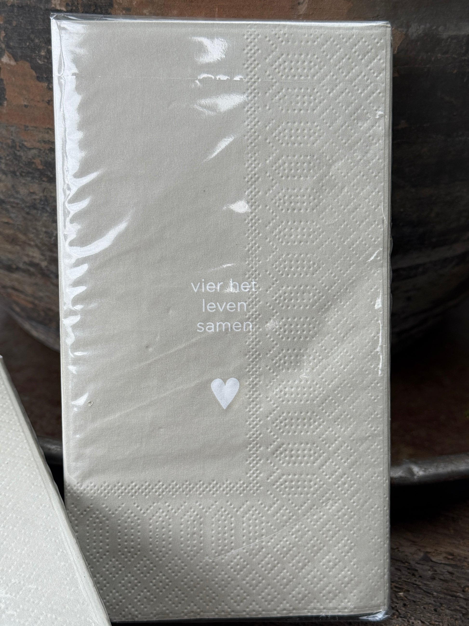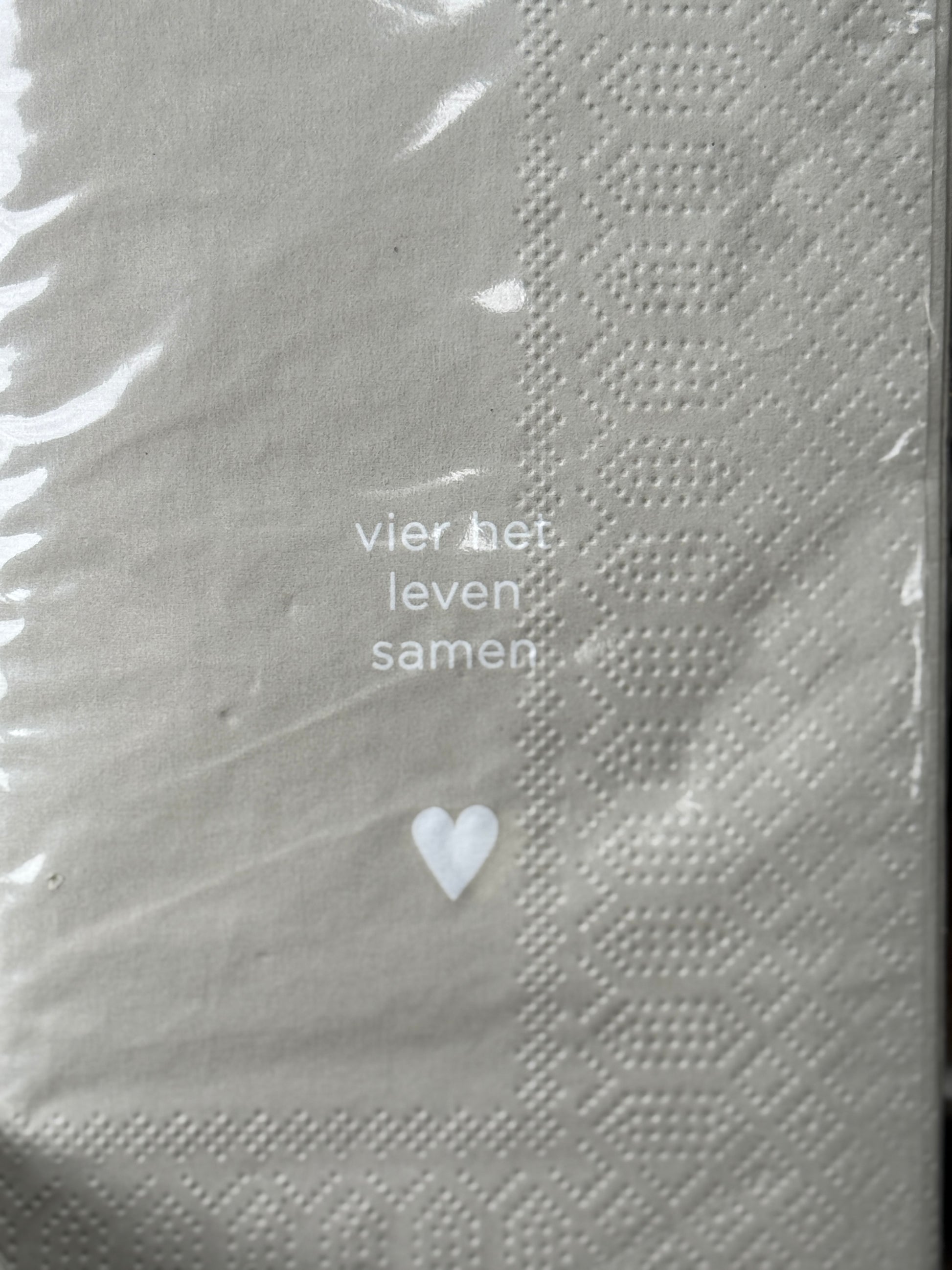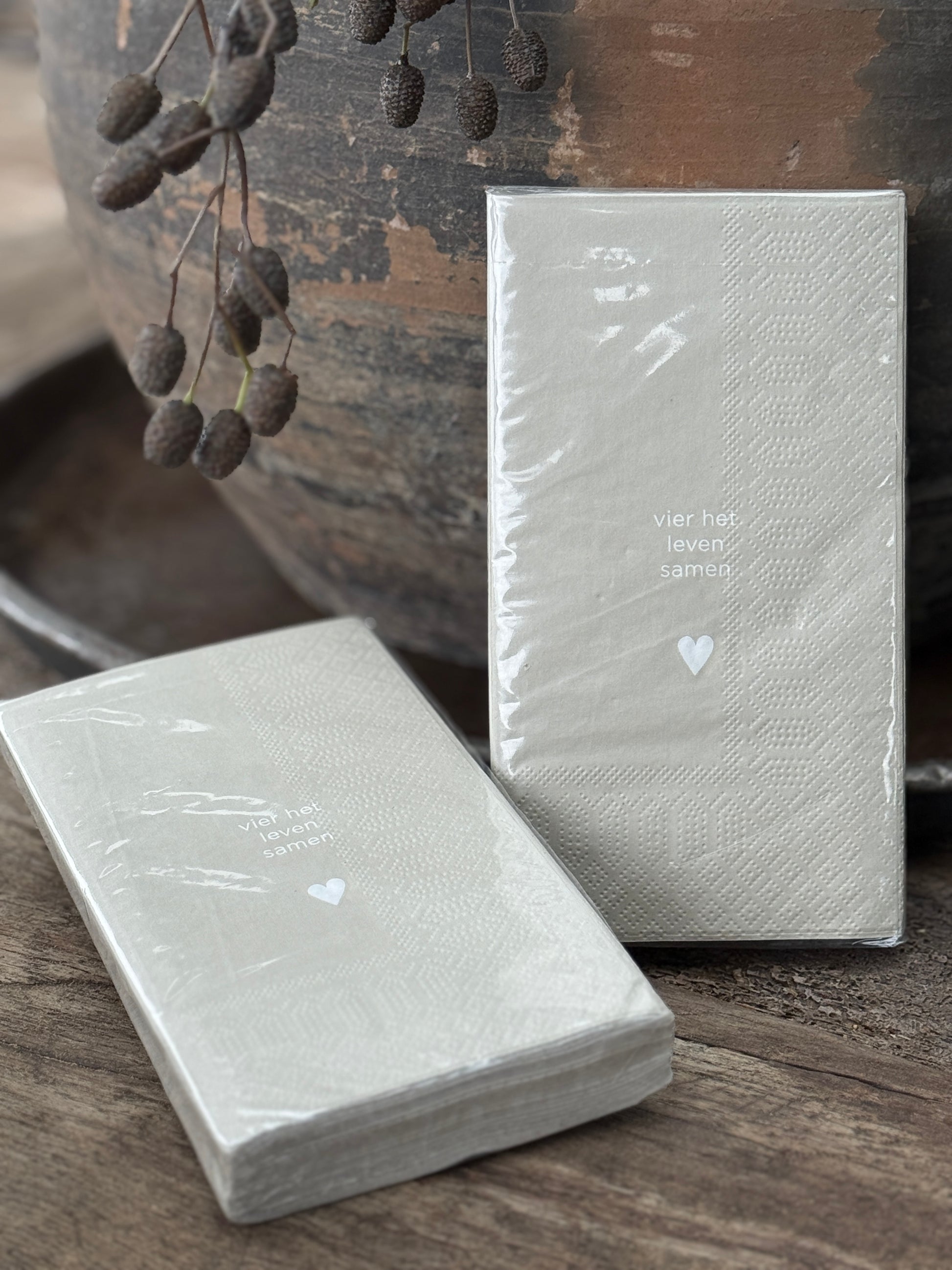Deze papieren servetten met de opdruk “Vier het leven samen” zorgen voor een warme en betekenisvolle sfeer aan tafel. De minimalistische tekst geeft de servetten een rustige, stijlvolle uitstraling en past perfect binnen een landelijk en sober interieur.