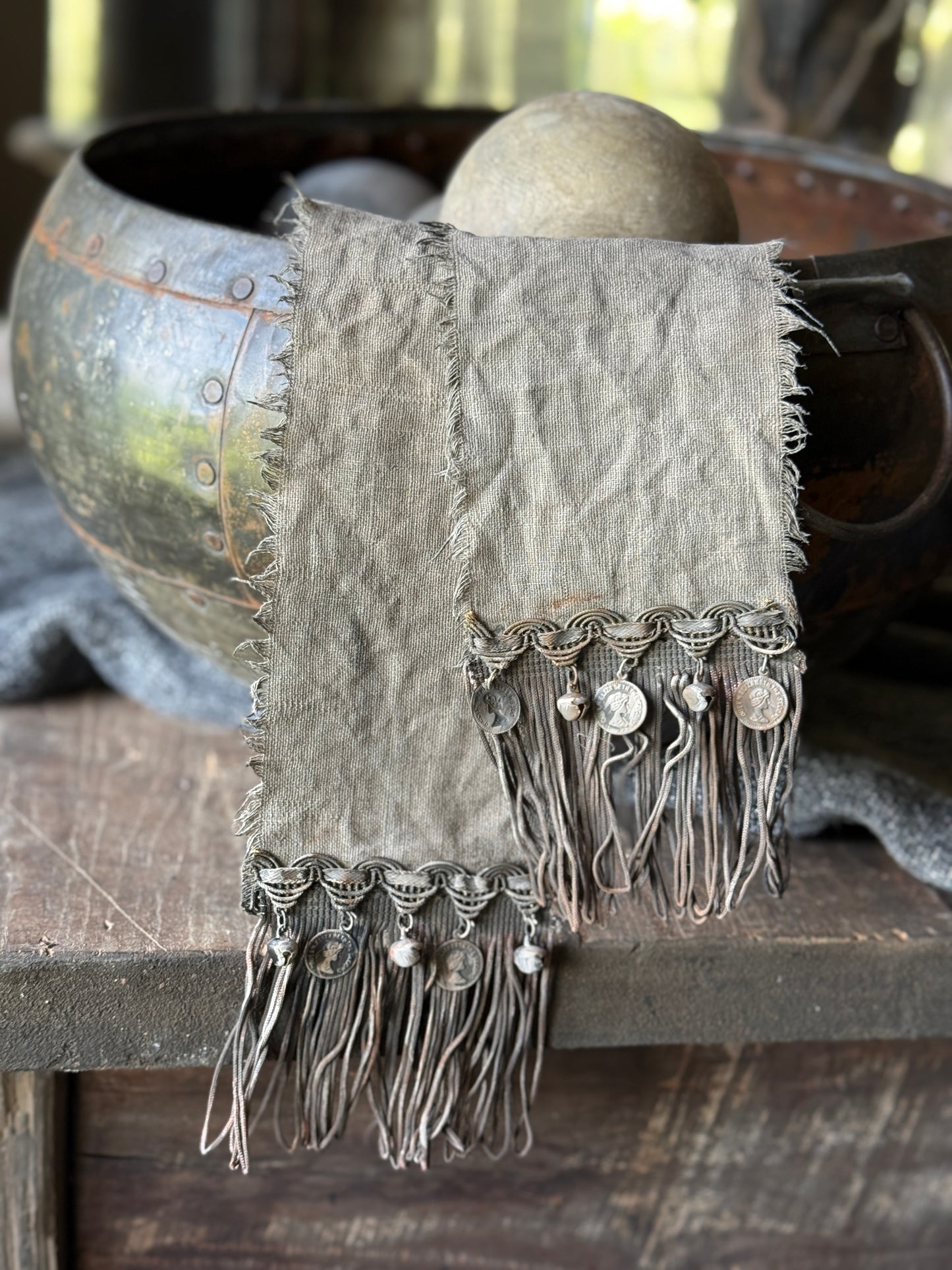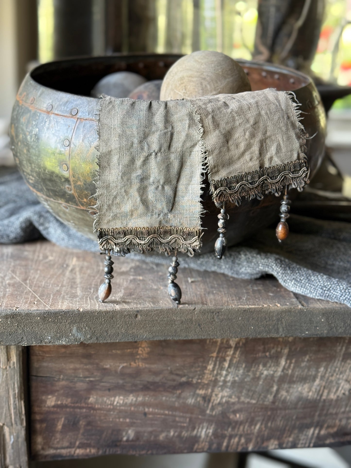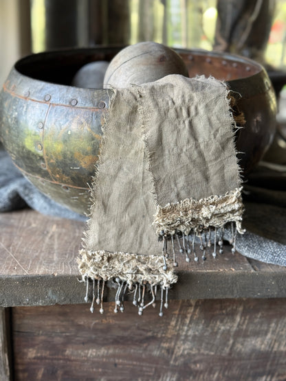 Dit lange shabby lint is geverfd in een kalkbad en heeft daardoor een prachtige verweerde, matte uitstraling met een zachte, vintage textuur. Het soepele materiaal maakt het lint perfect te vormen en te stylen op allerlei manieren – gedrapeerd over een object, geknoopt aan een vaas ofuit een vaas of kruik.